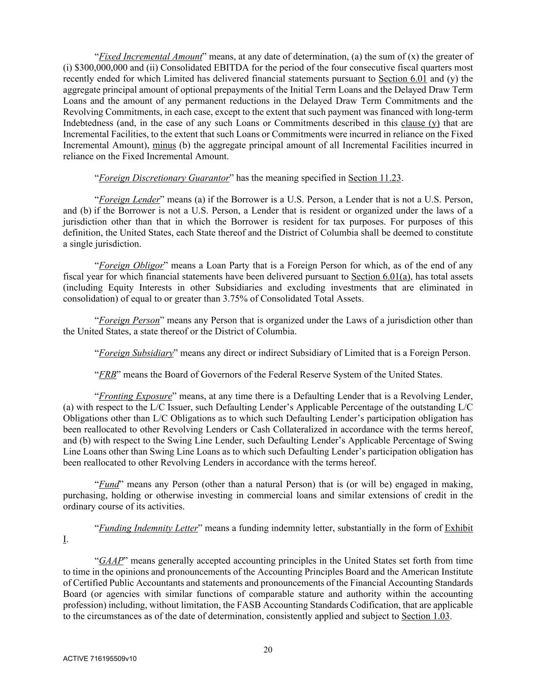 20 ACTIVE 716195509v10 “Fixed Incremental Amount” means, at any date of determination, (a) the sum of (x) the greater of (i) $300,000,000 and (ii) Consolidated EBITDA for the period of the four consecutive fiscal quarters most recently ended for which Limited has delivered financial statements pursuant to Section 6.01 and (y) the aggregate principal amount of optional prepayments of the Initial Term Loans and the Delayed Draw Term Loans and the amount of any permanent reductions in the Delayed Draw Term Commitments and the Revolving Commitments, in each case, except to the extent that such payment was financed with long-term Indebtedness (and, in the case of any such Loans or Commitments described in this clause (y) that are Incremental Facilities, to the extent that such Loans or Commitments were incurred in reliance on the Fixed Incremental Amount), minus (b) the aggregate principal amount of all Incremental Facilities incurred in reliance on the Fixed Incremental Amount. “Foreign Discretionary Guarantor” has the meaning specified in Section 11.23. “Foreign Lender” means (a) if the Borrower is a U.S. Person, a Lender that is not a U.S. Person, and (b) if the Borrower is not a U.S. Person, a Lender that is resident or organized under the laws of a jurisdiction other than that in which the Borrower is resident for tax purposes. For purposes of this definition, the United States, each State thereof and the District of Columbia shall be deemed to constitute a single jurisdiction. “Foreign Obligor” means a Loan Party that is a Foreign Person for which, as of the end of any fiscal year for which financial statements have been delivered pursuant to Section 6.01(a), has total assets (including Equity Interests in other Subsidiaries and excluding investments that are eliminated in consolidation) of equal to or greater than 3.75% of Consolidated Total Assets. “Foreign Person” means any Person that is organized under the Laws of a jurisdiction other than the United States, a state thereof or the District of Columbia. “Foreign Subsidiary” means any direct or indirect Subsidiary of Limited that is a Foreign Person. “FRB” means the Board of Governors of the Federal Reserve System of the United States. “Fronting Exposure” means, at any time there is a Defaulting Lender that is a Revolving Lender, (a) with respect to the L/C Issuer, such Defaulting Lender’s Applicable Percentage of the outstanding L/C Obligations other than L/C Obligations as to which such Defaulting Lender’s participation obligation has been reallocated to other Revolving Lenders or Cash Collateralized in accordance with the terms hereof, and (b) with respect to the Swing Line Lender, such Defaulting Lender’s Applicable Percentage of Swing Line Loans other than Swing Line Loans as to which such Defaulting Lender’s participation obligation has been reallocated to other Revolving Lenders in accordance with the terms hereof. “Fund” means any Person (other than a natural Person) that is (or will be) engaged in making, purchasing, holding or otherwise investing in commercial loans and similar extensions of credit in the ordinary course of its activities. “Funding Indemnity Letter” means a funding indemnity letter, substantially in the form of Exhibit I. “GAAP” means generally accepted accounting principles in the United States set forth from time to time in the opinions and pronouncements of the Accounting Principles Board and the American Institute of Certified Public Accountants and statements and pronouncements of the Financial Accounting Standards Board (or agencies with similar functions of comparable stature and authority within the accounting profession) including, without limitation, the FASB Accounting Standards Codification, that are applicable to the circumstances as of the date of determination, consistently applied and subject to Section 1.03.