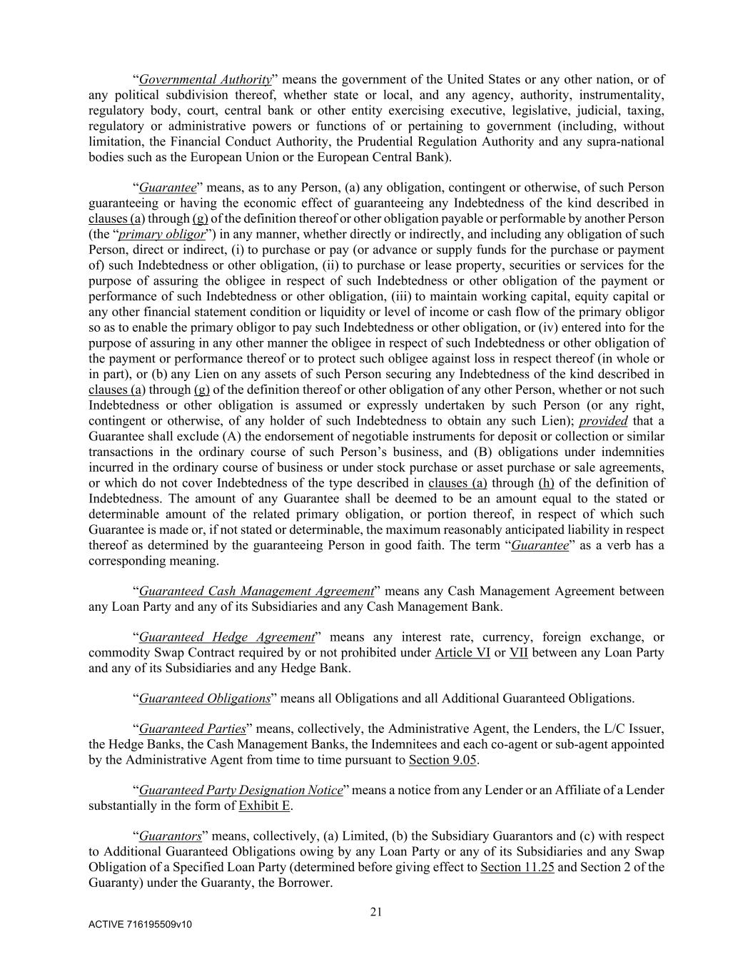 21 ACTIVE 716195509v10 “Governmental Authority” means the government of the United States or any other nation, or of any political subdivision thereof, whether state or local, and any agency, authority, instrumentality, regulatory body, court, central bank or other entity exercising executive, legislative, judicial, taxing, regulatory or administrative powers or functions of or pertaining to government (including, without limitation, the Financial Conduct Authority, the Prudential Regulation Authority and any supra-national bodies such as the European Union or the European Central Bank). “Guarantee” means, as to any Person, (a) any obligation, contingent or otherwise, of such Person guaranteeing or having the economic effect of guaranteeing any Indebtedness of the kind described in clauses (a) through (g) of the definition thereof or other obligation payable or performable by another Person (the “primary obligor”) in any manner, whether directly or indirectly, and including any obligation of such Person, direct or indirect, (i) to purchase or pay (or advance or supply funds for the purchase or payment of) such Indebtedness or other obligation, (ii) to purchase or lease property, securities or services for the purpose of assuring the obligee in respect of such Indebtedness or other obligation of the payment or performance of such Indebtedness or other obligation, (iii) to maintain working capital, equity capital or any other financial statement condition or liquidity or level of income or cash flow of the primary obligor so as to enable the primary obligor to pay such Indebtedness or other obligation, or (iv) entered into for the purpose of assuring in any other manner the obligee in respect of such Indebtedness or other obligation of the payment or performance thereof or to protect such obligee against loss in respect thereof (in whole or in part), or (b) any Lien on any assets of such Person securing any Indebtedness of the kind described in clauses (a) through (g) of the definition thereof or other obligation of any other Person, whether or not such Indebtedness or other obligation is assumed or expressly undertaken by such Person (or any right, contingent or otherwise, of any holder of such Indebtedness to obtain any such Lien); provided that a Guarantee shall exclude (A) the endorsement of negotiable instruments for deposit or collection or similar transactions in the ordinary course of such Person’s business, and (B) obligations under indemnities incurred in the ordinary course of business or under stock purchase or asset purchase or sale agreements, or which do not cover Indebtedness of the type described in clauses (a) through (h) of the definition of Indebtedness. The amount of any Guarantee shall be deemed to be an amount equal to the stated or determinable amount of the related primary obligation, or portion thereof, in respect of which such Guarantee is made or, if not stated or determinable, the maximum reasonably anticipated liability in respect thereof as determined by the guaranteeing Person in good faith. The term “Guarantee” as a verb has a corresponding meaning. “Guaranteed Cash Management Agreement” means any Cash Management Agreement between any Loan Party and any of its Subsidiaries and any Cash Management Bank. “Guaranteed Hedge Agreement” means any interest rate, currency, foreign exchange, or commodity Swap Contract required by or not prohibited under Article VI or VII between any Loan Party and any of its Subsidiaries and any Hedge Bank. “Guaranteed Obligations” means all Obligations and all Additional Guaranteed Obligations. “Guaranteed Parties” means, collectively, the Administrative Agent, the Lenders, the L/C Issuer, the Hedge Banks, the Cash Management Banks, the Indemnitees and each co-agent or sub-agent appointed by the Administrative Agent from time to time pursuant to Section 9.05. “Guaranteed Party Designation Notice” means a notice from any Lender or an Affiliate of a Lender substantially in the form of Exhibit E. “Guarantors” means, collectively, (a) Limited, (b) the Subsidiary Guarantors and (c) with respect to Additional Guaranteed Obligations owing by any Loan Party or any of its Subsidiaries and any Swap Obligation of a Specified Loan Party (determined before giving effect to Section 11.25 and Section 2 of the Guaranty) under the Guaranty, the Borrower.