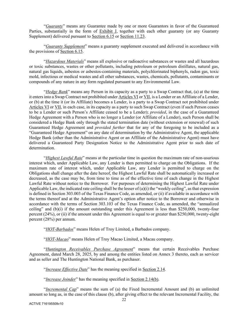 22 ACTIVE 716195509v10 “Guaranty” means any Guarantee made by one or more Guarantors in favor of the Guaranteed Parties, substantially in the form of Exhibit J, together with each other guaranty (or any Guaranty Supplement) delivered pursuant to Section 6.15 or Section 11.23. “Guaranty Supplement” means a guaranty supplement executed and delivered in accordance with the provisions of Section 6.15. “Hazardous Materials” means all explosive or radioactive substances or wastes and all hazardous or toxic substances, wastes or other pollutants, including petroleum or petroleum distillates, natural gas, natural gas liquids, asbestos or asbestos-containing materials, polychlorinated biphenyls, radon gas, toxic mold, infectious or medical wastes and all other substances, wastes, chemicals, pollutants, contaminants or compounds of any nature in any form regulated pursuant to any Environmental Law. “Hedge Bank” means any Person in its capacity as a party to a Swap Contract that, (a) at the time it enters into a Swap Contract not prohibited under Articles VI or VII, is a Lender or an Affiliate of a Lender, or (b) at the time it (or its Affiliate) becomes a Lender, is a party to a Swap Contract not prohibited under Articles VI or VII, in each case, in its capacity as a party to such Swap Contract (even if such Person ceases to be a Lender or such Person’s Affiliate ceased to be a Lender); provided, in the case of a Guaranteed Hedge Agreement with a Person who is no longer a Lender (or Affiliate of a Lender), such Person shall be considered a Hedge Bank only through the stated termination date (without extension or renewal) of such Guaranteed Hedge Agreement and provided further that for any of the foregoing to be included as a “Guaranteed Hedge Agreement” on any date of determination by the Administrative Agent, the applicable Hedge Bank (other than the Administrative Agent or an Affiliate of the Administrative Agent) must have delivered a Guaranteed Party Designation Notice to the Administrative Agent prior to such date of determination. “Highest Lawful Rate” means at the particular time in question the maximum rate of non-usurious interest which, under Applicable Law, any Lender is then permitted to charge on the Obligations. If the maximum rate of interest which, under Applicable Law, any Lender is permitted to charge on the Obligations shall change after the date hereof, the Highest Lawful Rate shall be automatically increased or decreased, as the case may be, from time to time as of the effective time of each change in the Highest Lawful Rate without notice to the Borrower. For purposes of determining the Highest Lawful Rate under Applicable Law, the indicated rate ceiling shall be the lesser of (a)(i) the “weekly ceiling”, as that expression is defined in Section 303.003 of the Texas Finance Code, as amended, or (ii) if available in accordance with the terms thereof and at the Administrative Agent’s option after notice to the Borrower and otherwise in accordance with the terms of Section 303.103 of the Texas Finance Code, as amended, the “annualized ceiling” and (b)(i) if the amount outstanding under this Agreement is less than $250,000, twenty-four percent (24%), or (ii) if the amount under this Agreement is equal to or greater than $250,000, twenty-eight percent (28%) per annum. “HOT-Barbados” means Helen of Troy Limited, a Barbados company. “HOT-Macao” means Helen of Troy Macao Limited, a Macau company. “Huntington Receivables Purchase Agreement” means that certain Receivables Purchase Agreement, dated March 28, 2025, by and among the entities listed on Annex 3 thereto, each as servicer and as seller and The Huntington National Bank, as purchaser. “Increase Effective Date” has the meaning specified in Section 2.14. “Increase Joinder” has the meaning specified in Section 2.14(b). “Incremental Cap” means the sum of (a) the Fixed Incremental Amount and (b) an unlimited amount so long as, in the case of this clause (b), after giving effect to the relevant Incremental Facility, the
