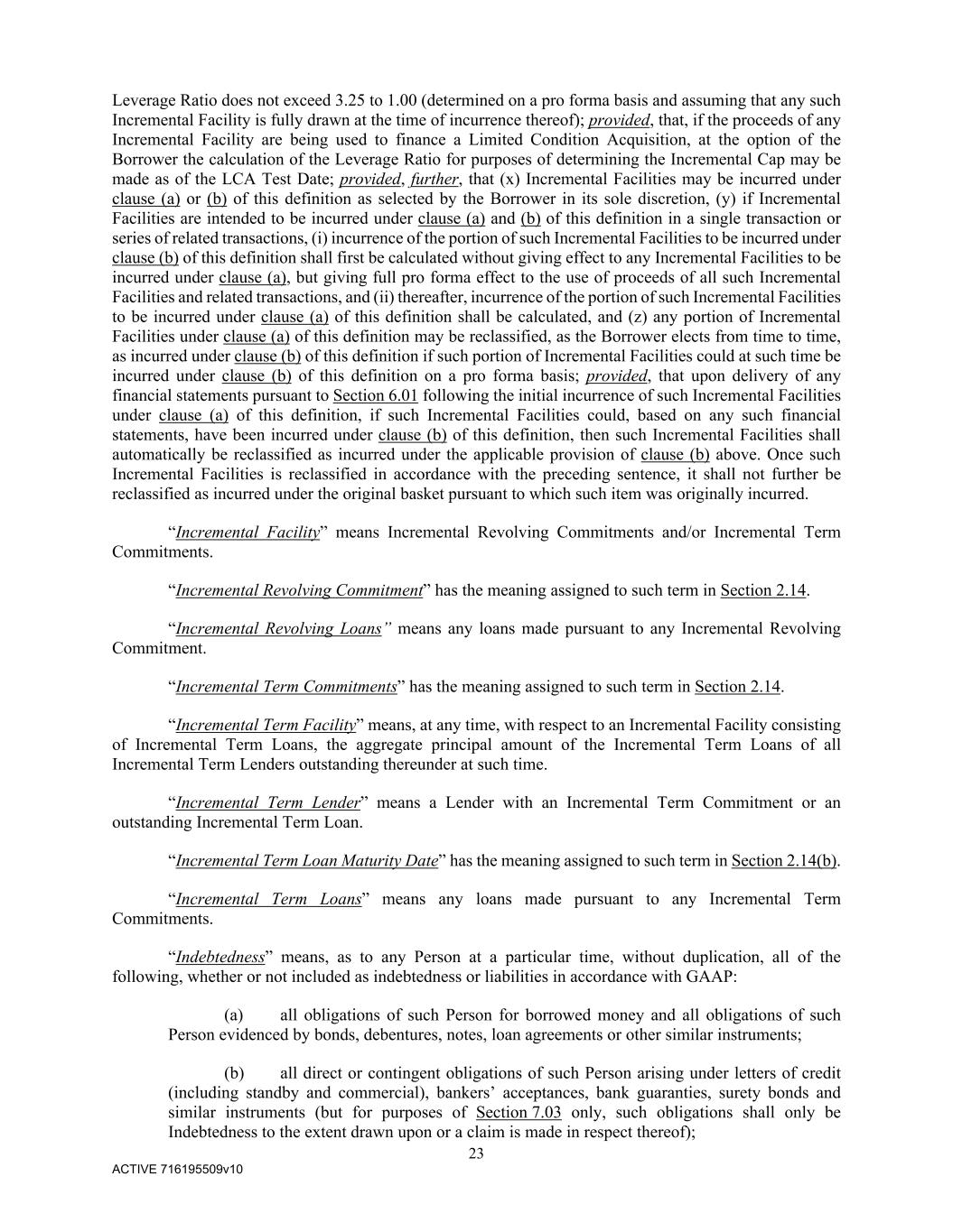 23 ACTIVE 716195509v10 Leverage Ratio does not exceed 3.25 to 1.00 (determined on a pro forma basis and assuming that any such Incremental Facility is fully drawn at the time of incurrence thereof); provided, that, if the proceeds of any Incremental Facility are being used to finance a Limited Condition Acquisition, at the option of the Borrower the calculation of the Leverage Ratio for purposes of determining the Incremental Cap may be made as of the LCA Test Date; provided, further, that (x) Incremental Facilities may be incurred under clause (a) or (b) of this definition as selected by the Borrower in its sole discretion, (y) if Incremental Facilities are intended to be incurred under clause (a) and (b) of this definition in a single transaction or series of related transactions, (i) incurrence of the portion of such Incremental Facilities to be incurred under clause (b) of this definition shall first be calculated without giving effect to any Incremental Facilities to be incurred under clause (a), but giving full pro forma effect to the use of proceeds of all such Incremental Facilities and related transactions, and (ii) thereafter, incurrence of the portion of such Incremental Facilities to be incurred under clause (a) of this definition shall be calculated, and (z) any portion of Incremental Facilities under clause (a) of this definition may be reclassified, as the Borrower elects from time to time, as incurred under clause (b) of this definition if such portion of Incremental Facilities could at such time be incurred under clause (b) of this definition on a pro forma basis; provided, that upon delivery of any financial statements pursuant to Section 6.01 following the initial incurrence of such Incremental Facilities under clause (a) of this definition, if such Incremental Facilities could, based on any such financial statements, have been incurred under clause (b) of this definition, then such Incremental Facilities shall automatically be reclassified as incurred under the applicable provision of clause (b) above. Once such Incremental Facilities is reclassified in accordance with the preceding sentence, it shall not further be reclassified as incurred under the original basket pursuant to which such item was originally incurred. “Incremental Facility” means Incremental Revolving Commitments and/or Incremental Term Commitments. “Incremental Revolving Commitment” has the meaning assigned to such term in Section 2.14. “Incremental Revolving Loans” means any loans made pursuant to any Incremental Revolving Commitment. “Incremental Term Commitments” has the meaning assigned to such term in Section 2.14. “Incremental Term Facility” means, at any time, with respect to an Incremental Facility consisting of Incremental Term Loans, the aggregate principal amount of the Incremental Term Loans of all Incremental Term Lenders outstanding thereunder at such time. “Incremental Term Lender” means a Lender with an Incremental Term Commitment or an outstanding Incremental Term Loan. “Incremental Term Loan Maturity Date” has the meaning assigned to such term in Section 2.14(b). “Incremental Term Loans” means any loans made pursuant to any Incremental Term Commitments. “Indebtedness” means, as to any Person at a particular time, without duplication, all of the following, whether or not included as indebtedness or liabilities in accordance with GAAP: (a) all obligations of such Person for borrowed money and all obligations of such Person evidenced by bonds, debentures, notes, loan agreements or other similar instruments; (b) all direct or contingent obligations of such Person arising under letters of credit (including standby and commercial), bankers’ acceptances, bank guaranties, surety bonds and similar instruments (but for purposes of Section 7.03 only, such obligations shall only be Indebtedness to the extent drawn upon or a claim is made in respect thereof);