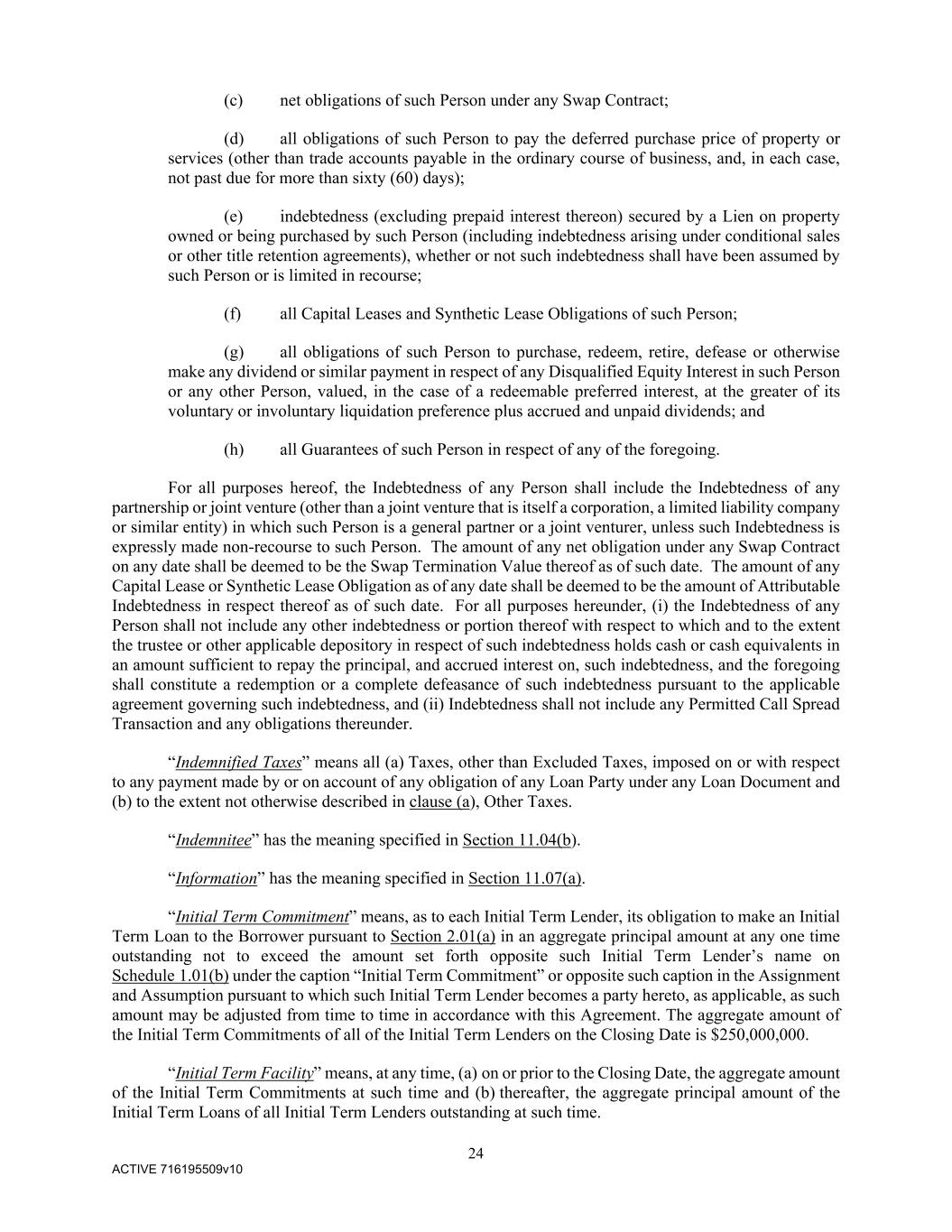 24 ACTIVE 716195509v10 (c) net obligations of such Person under any Swap Contract; (d) all obligations of such Person to pay the deferred purchase price of property or services (other than trade accounts payable in the ordinary course of business, and, in each case, not past due for more than sixty (60) days); (e) indebtedness (excluding prepaid interest thereon) secured by a Lien on property owned or being purchased by such Person (including indebtedness arising under conditional sales or other title retention agreements), whether or not such indebtedness shall have been assumed by such Person or is limited in recourse; (f) all Capital Leases and Synthetic Lease Obligations of such Person; (g) all obligations of such Person to purchase, redeem, retire, defease or otherwise make any dividend or similar payment in respect of any Disqualified Equity Interest in such Person or any other Person, valued, in the case of a redeemable preferred interest, at the greater of its voluntary or involuntary liquidation preference plus accrued and unpaid dividends; and (h) all Guarantees of such Person in respect of any of the foregoing. For all purposes hereof, the Indebtedness of any Person shall include the Indebtedness of any partnership or joint venture (other than a joint venture that is itself a corporation, a limited liability company or similar entity) in which such Person is a general partner or a joint venturer, unless such Indebtedness is expressly made non-recourse to such Person. The amount of any net obligation under any Swap Contract on any date shall be deemed to be the Swap Termination Value thereof as of such date. The amount of any Capital Lease or Synthetic Lease Obligation as of any date shall be deemed to be the amount of Attributable Indebtedness in respect thereof as of such date. For all purposes hereunder, (i) the Indebtedness of any Person shall not include any other indebtedness or portion thereof with respect to which and to the extent the trustee or other applicable depository in respect of such indebtedness holds cash or cash equivalents in an amount sufficient to repay the principal, and accrued interest on, such indebtedness, and the foregoing shall constitute a redemption or a complete defeasance of such indebtedness pursuant to the applicable agreement governing such indebtedness, and (ii) Indebtedness shall not include any Permitted Call Spread Transaction and any obligations thereunder. “Indemnified Taxes” means all (a) Taxes, other than Excluded Taxes, imposed on or with respect to any payment made by or on account of any obligation of any Loan Party under any Loan Document and (b) to the extent not otherwise described in clause (a), Other Taxes. “Indemnitee” has the meaning specified in Section 11.04(b). “Information” has the meaning specified in Section 11.07(a). “Initial Term Commitment” means, as to each Initial Term Lender, its obligation to make an Initial Term Loan to the Borrower pursuant to Section 2.01(a) in an aggregate principal amount at any one time outstanding not to exceed the amount set forth opposite such Initial Term Lender’s name on Schedule 1.01(b) under the caption “Initial Term Commitment” or opposite such caption in the Assignment and Assumption pursuant to which such Initial Term Lender becomes a party hereto, as applicable, as such amount may be adjusted from time to time in accordance with this Agreement. The aggregate amount of the Initial Term Commitments of all of the Initial Term Lenders on the Closing Date is $250,000,000. “Initial Term Facility” means, at any time, (a) on or prior to the Closing Date, the aggregate amount of the Initial Term Commitments at such time and (b) thereafter, the aggregate principal amount of the Initial Term Loans of all Initial Term Lenders outstanding at such time.