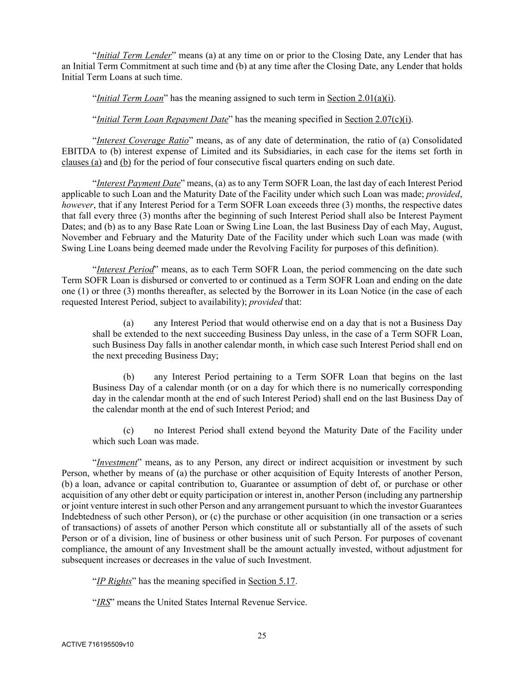 25 ACTIVE 716195509v10 “Initial Term Lender” means (a) at any time on or prior to the Closing Date, any Lender that has an Initial Term Commitment at such time and (b) at any time after the Closing Date, any Lender that holds Initial Term Loans at such time. “Initial Term Loan” has the meaning assigned to such term in Section 2.01(a)(i). “Initial Term Loan Repayment Date” has the meaning specified in Section 2.07(c)(i). “Interest Coverage Ratio” means, as of any date of determination, the ratio of (a) Consolidated EBITDA to (b) interest expense of Limited and its Subsidiaries, in each case for the items set forth in clauses (a) and (b) for the period of four consecutive fiscal quarters ending on such date. “Interest Payment Date” means, (a) as to any Term SOFR Loan, the last day of each Interest Period applicable to such Loan and the Maturity Date of the Facility under which such Loan was made; provided, however, that if any Interest Period for a Term SOFR Loan exceeds three (3) months, the respective dates that fall every three (3) months after the beginning of such Interest Period shall also be Interest Payment Dates; and (b) as to any Base Rate Loan or Swing Line Loan, the last Business Day of each May, August, November and February and the Maturity Date of the Facility under which such Loan was made (with Swing Line Loans being deemed made under the Revolving Facility for purposes of this definition). “Interest Period” means, as to each Term SOFR Loan, the period commencing on the date such Term SOFR Loan is disbursed or converted to or continued as a Term SOFR Loan and ending on the date one (1) or three (3) months thereafter, as selected by the Borrower in its Loan Notice (in the case of each requested Interest Period, subject to availability); provided that: (a) any Interest Period that would otherwise end on a day that is not a Business Day shall be extended to the next succeeding Business Day unless, in the case of a Term SOFR Loan, such Business Day falls in another calendar month, in which case such Interest Period shall end on the next preceding Business Day; (b) any Interest Period pertaining to a Term SOFR Loan that begins on the last Business Day of a calendar month (or on a day for which there is no numerically corresponding day in the calendar month at the end of such Interest Period) shall end on the last Business Day of the calendar month at the end of such Interest Period; and (c) no Interest Period shall extend beyond the Maturity Date of the Facility under which such Loan was made. “Investment” means, as to any Person, any direct or indirect acquisition or investment by such Person, whether by means of (a) the purchase or other acquisition of Equity Interests of another Person, (b) a loan, advance or capital contribution to, Guarantee or assumption of debt of, or purchase or other acquisition of any other debt or equity participation or interest in, another Person (including any partnership or joint venture interest in such other Person and any arrangement pursuant to which the investor Guarantees Indebtedness of such other Person), or (c) the purchase or other acquisition (in one transaction or a series of transactions) of assets of another Person which constitute all or substantially all of the assets of such Person or of a division, line of business or other business unit of such Person. For purposes of covenant compliance, the amount of any Investment shall be the amount actually invested, without adjustment for subsequent increases or decreases in the value of such Investment. “IP Rights” has the meaning specified in Section 5.17. “IRS” means the United States Internal Revenue Service.