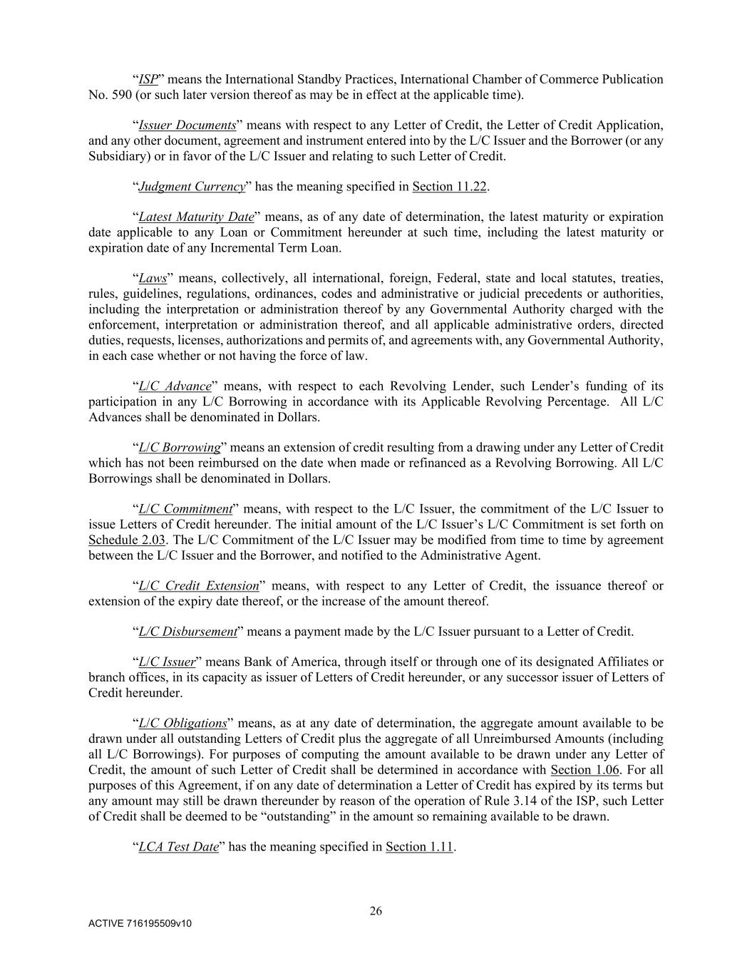 26 ACTIVE 716195509v10 “ISP” means the International Standby Practices, International Chamber of Commerce Publication No. 590 (or such later version thereof as may be in effect at the applicable time). “Issuer Documents” means with respect to any Letter of Credit, the Letter of Credit Application, and any other document, agreement and instrument entered into by the L/C Issuer and the Borrower (or any Subsidiary) or in favor of the L/C Issuer and relating to such Letter of Credit. “Judgment Currency” has the meaning specified in Section 11.22. “Latest Maturity Date” means, as of any date of determination, the latest maturity or expiration date applicable to any Loan or Commitment hereunder at such time, including the latest maturity or expiration date of any Incremental Term Loan. “Laws” means, collectively, all international, foreign, Federal, state and local statutes, treaties, rules, guidelines, regulations, ordinances, codes and administrative or judicial precedents or authorities, including the interpretation or administration thereof by any Governmental Authority charged with the enforcement, interpretation or administration thereof, and all applicable administrative orders, directed duties, requests, licenses, authorizations and permits of, and agreements with, any Governmental Authority, in each case whether or not having the force of law. “L/C Advance” means, with respect to each Revolving Lender, such Lender’s funding of its participation in any L/C Borrowing in accordance with its Applicable Revolving Percentage. All L/C Advances shall be denominated in Dollars. “L/C Borrowing” means an extension of credit resulting from a drawing under any Letter of Credit which has not been reimbursed on the date when made or refinanced as a Revolving Borrowing. All L/C Borrowings shall be denominated in Dollars. “L/C Commitment” means, with respect to the L/C Issuer, the commitment of the L/C Issuer to issue Letters of Credit hereunder. The initial amount of the L/C Issuer’s L/C Commitment is set forth on Schedule 2.03. The L/C Commitment of the L/C Issuer may be modified from time to time by agreement between the L/C Issuer and the Borrower, and notified to the Administrative Agent. “L/C Credit Extension” means, with respect to any Letter of Credit, the issuance thereof or extension of the expiry date thereof, or the increase of the amount thereof. “L/C Disbursement” means a payment made by the L/C Issuer pursuant to a Letter of Credit. “L/C Issuer” means Bank of America, through itself or through one of its designated Affiliates or branch offices, in its capacity as issuer of Letters of Credit hereunder, or any successor issuer of Letters of Credit hereunder. “L/C Obligations” means, as at any date of determination, the aggregate amount available to be drawn under all outstanding Letters of Credit plus the aggregate of all Unreimbursed Amounts (including all L/C Borrowings). For purposes of computing the amount available to be drawn under any Letter of Credit, the amount of such Letter of Credit shall be determined in accordance with Section 1.06. For all purposes of this Agreement, if on any date of determination a Letter of Credit has expired by its terms but any amount may still be drawn thereunder by reason of the operation of Rule 3.14 of the ISP, such Letter of Credit shall be deemed to be “outstanding” in the amount so remaining available to be drawn. “LCA Test Date” has the meaning specified in Section 1.11.