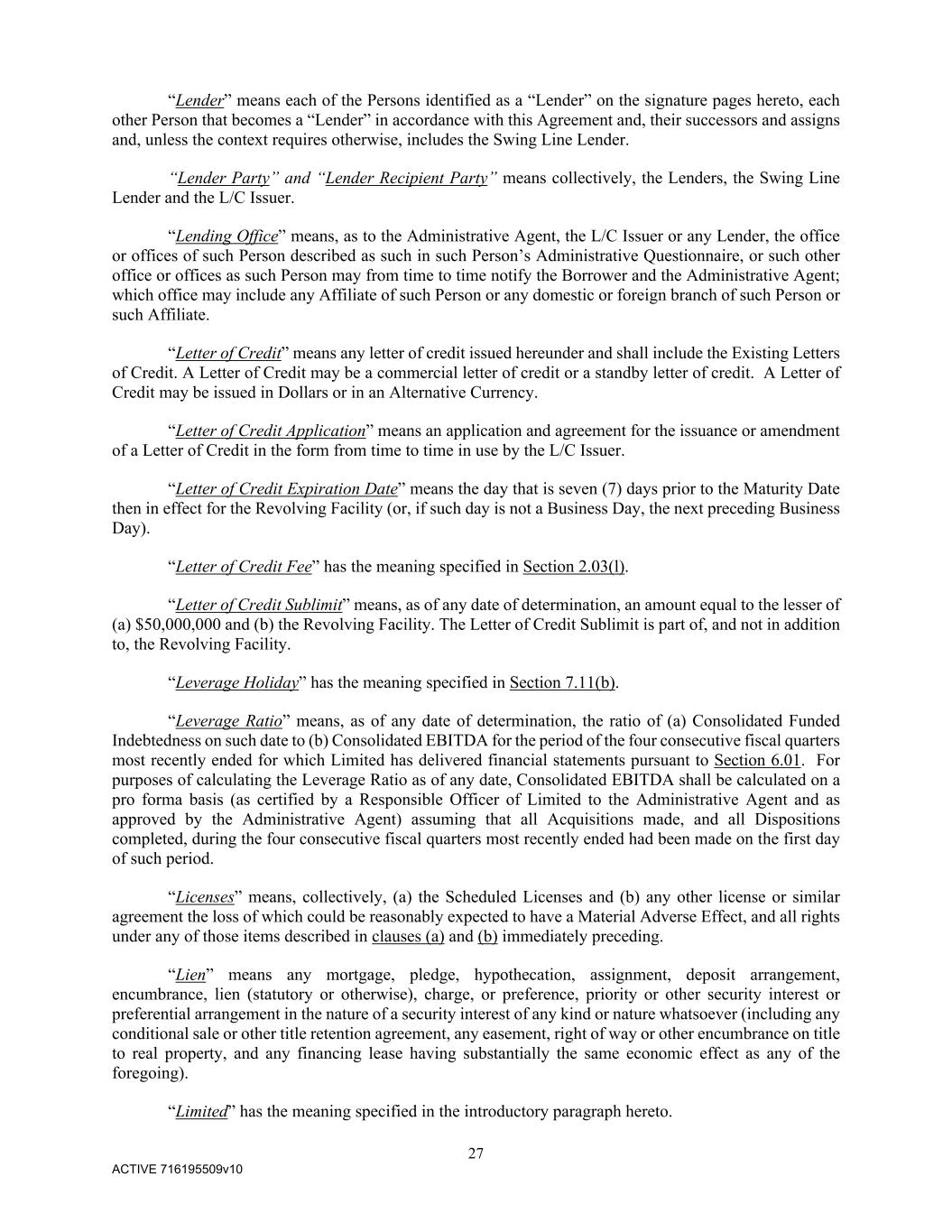27 ACTIVE 716195509v10 “Lender” means each of the Persons identified as a “Lender” on the signature pages hereto, each other Person that becomes a “Lender” in accordance with this Agreement and, their successors and assigns and, unless the context requires otherwise, includes the Swing Line Lender. “Lender Party” and “Lender Recipient Party” means collectively, the Lenders, the Swing Line Lender and the L/C Issuer. “Lending Office” means, as to the Administrative Agent, the L/C Issuer or any Lender, the office or offices of such Person described as such in such Person’s Administrative Questionnaire, or such other office or offices as such Person may from time to time notify the Borrower and the Administrative Agent; which office may include any Affiliate of such Person or any domestic or foreign branch of such Person or such Affiliate. “Letter of Credit” means any letter of credit issued hereunder and shall include the Existing Letters of Credit. A Letter of Credit may be a commercial letter of credit or a standby letter of credit. A Letter of Credit may be issued in Dollars or in an Alternative Currency. “Letter of Credit Application” means an application and agreement for the issuance or amendment of a Letter of Credit in the form from time to time in use by the L/C Issuer. “Letter of Credit Expiration Date” means the day that is seven (7) days prior to the Maturity Date then in effect for the Revolving Facility (or, if such day is not a Business Day, the next preceding Business Day). “Letter of Credit Fee” has the meaning specified in Section 2.03(l). “Letter of Credit Sublimit” means, as of any date of determination, an amount equal to the lesser of (a) $50,000,000 and (b) the Revolving Facility. The Letter of Credit Sublimit is part of, and not in addition to, the Revolving Facility. “Leverage Holiday” has the meaning specified in Section 7.11(b). “Leverage Ratio” means, as of any date of determination, the ratio of (a) Consolidated Funded Indebtedness on such date to (b) Consolidated EBITDA for the period of the four consecutive fiscal quarters most recently ended for which Limited has delivered financial statements pursuant to Section 6.01. For purposes of calculating the Leverage Ratio as of any date, Consolidated EBITDA shall be calculated on a pro forma basis (as certified by a Responsible Officer of Limited to the Administrative Agent and as approved by the Administrative Agent) assuming that all Acquisitions made, and all Dispositions completed, during the four consecutive fiscal quarters most recently ended had been made on the first day of such period. “Licenses” means, collectively, (a) the Scheduled Licenses and (b) any other license or similar agreement the loss of which could be reasonably expected to have a Material Adverse Effect, and all rights under any of those items described in clauses (a) and (b) immediately preceding. “Lien” means any mortgage, pledge, hypothecation, assignment, deposit arrangement, encumbrance, lien (statutory or otherwise), charge, or preference, priority or other security interest or preferential arrangement in the nature of a security interest of any kind or nature whatsoever (including any conditional sale or other title retention agreement, any easement, right of way or other encumbrance on title to real property, and any financing lease having substantially the same economic effect as any of the foregoing). “Limited” has the meaning specified in the introductory paragraph hereto.