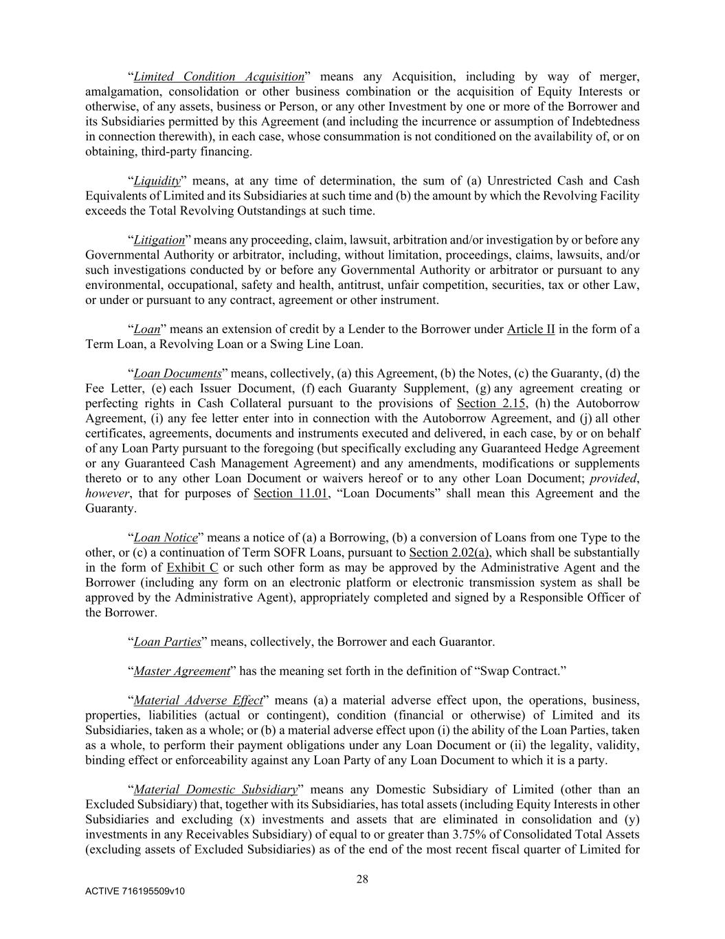 28 ACTIVE 716195509v10 “Limited Condition Acquisition” means any Acquisition, including by way of merger, amalgamation, consolidation or other business combination or the acquisition of Equity Interests or otherwise, of any assets, business or Person, or any other Investment by one or more of the Borrower and its Subsidiaries permitted by this Agreement (and including the incurrence or assumption of Indebtedness in connection therewith), in each case, whose consummation is not conditioned on the availability of, or on obtaining, third-party financing. “Liquidity” means, at any time of determination, the sum of (a) Unrestricted Cash and Cash Equivalents of Limited and its Subsidiaries at such time and (b) the amount by which the Revolving Facility exceeds the Total Revolving Outstandings at such time. “Litigation” means any proceeding, claim, lawsuit, arbitration and/or investigation by or before any Governmental Authority or arbitrator, including, without limitation, proceedings, claims, lawsuits, and/or such investigations conducted by or before any Governmental Authority or arbitrator or pursuant to any environmental, occupational, safety and health, antitrust, unfair competition, securities, tax or other Law, or under or pursuant to any contract, agreement or other instrument. “Loan” means an extension of credit by a Lender to the Borrower under Article II in the form of a Term Loan, a Revolving Loan or a Swing Line Loan. “Loan Documents” means, collectively, (a) this Agreement, (b) the Notes, (c) the Guaranty, (d) the Fee Letter, (e) each Issuer Document, (f) each Guaranty Supplement, (g) any agreement creating or perfecting rights in Cash Collateral pursuant to the provisions of Section 2.15, (h) the Autoborrow Agreement, (i) any fee letter enter into in connection with the Autoborrow Agreement, and (j) all other certificates, agreements, documents and instruments executed and delivered, in each case, by or on behalf of any Loan Party pursuant to the foregoing (but specifically excluding any Guaranteed Hedge Agreement or any Guaranteed Cash Management Agreement) and any amendments, modifications or supplements thereto or to any other Loan Document or waivers hereof or to any other Loan Document; provided, however, that for purposes of Section 11.01, “Loan Documents” shall mean this Agreement and the Guaranty. “Loan Notice” means a notice of (a) a Borrowing, (b) a conversion of Loans from one Type to the other, or (c) a continuation of Term SOFR Loans, pursuant to Section 2.02(a), which shall be substantially in the form of Exhibit C or such other form as may be approved by the Administrative Agent and the Borrower (including any form on an electronic platform or electronic transmission system as shall be approved by the Administrative Agent), appropriately completed and signed by a Responsible Officer of the Borrower. “Loan Parties” means, collectively, the Borrower and each Guarantor. “Master Agreement” has the meaning set forth in the definition of “Swap Contract.” “Material Adverse Effect” means (a) a material adverse effect upon, the operations, business, properties, liabilities (actual or contingent), condition (financial or otherwise) of Limited and its Subsidiaries, taken as a whole; or (b) a material adverse effect upon (i) the ability of the Loan Parties, taken as a whole, to perform their payment obligations under any Loan Document or (ii) the legality, validity, binding effect or enforceability against any Loan Party of any Loan Document to which it is a party. “Material Domestic Subsidiary” means any Domestic Subsidiary of Limited (other than an Excluded Subsidiary) that, together with its Subsidiaries, has total assets (including Equity Interests in other Subsidiaries and excluding (x) investments and assets that are eliminated in consolidation and (y) investments in any Receivables Subsidiary) of equal to or greater than 3.75% of Consolidated Total Assets (excluding assets of Excluded Subsidiaries) as of the end of the most recent fiscal quarter of Limited for