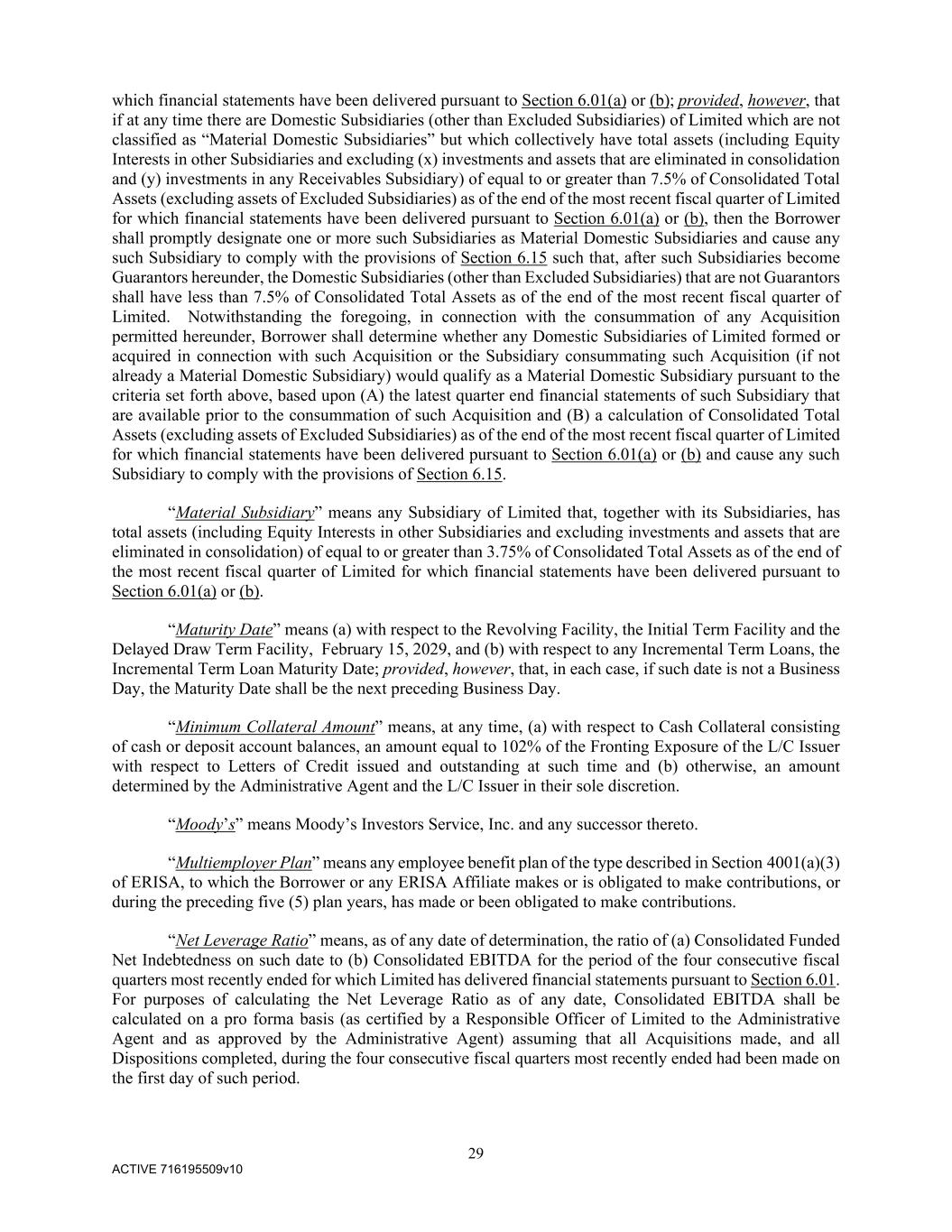 29 ACTIVE 716195509v10 which financial statements have been delivered pursuant to Section 6.01(a) or (b); provided, however, that if at any time there are Domestic Subsidiaries (other than Excluded Subsidiaries) of Limited which are not classified as “Material Domestic Subsidiaries” but which collectively have total assets (including Equity Interests in other Subsidiaries and excluding (x) investments and assets that are eliminated in consolidation and (y) investments in any Receivables Subsidiary) of equal to or greater than 7.5% of Consolidated Total Assets (excluding assets of Excluded Subsidiaries) as of the end of the most recent fiscal quarter of Limited for which financial statements have been delivered pursuant to Section 6.01(a) or (b), then the Borrower shall promptly designate one or more such Subsidiaries as Material Domestic Subsidiaries and cause any such Subsidiary to comply with the provisions of Section 6.15 such that, after such Subsidiaries become Guarantors hereunder, the Domestic Subsidiaries (other than Excluded Subsidiaries) that are not Guarantors shall have less than 7.5% of Consolidated Total Assets as of the end of the most recent fiscal quarter of Limited. Notwithstanding the foregoing, in connection with the consummation of any Acquisition permitted hereunder, Borrower shall determine whether any Domestic Subsidiaries of Limited formed or acquired in connection with such Acquisition or the Subsidiary consummating such Acquisition (if not already a Material Domestic Subsidiary) would qualify as a Material Domestic Subsidiary pursuant to the criteria set forth above, based upon (A) the latest quarter end financial statements of such Subsidiary that are available prior to the consummation of such Acquisition and (B) a calculation of Consolidated Total Assets (excluding assets of Excluded Subsidiaries) as of the end of the most recent fiscal quarter of Limited for which financial statements have been delivered pursuant to Section 6.01(a) or (b) and cause any such Subsidiary to comply with the provisions of Section 6.15. “Material Subsidiary” means any Subsidiary of Limited that, together with its Subsidiaries, has total assets (including Equity Interests in other Subsidiaries and excluding investments and assets that are eliminated in consolidation) of equal to or greater than 3.75% of Consolidated Total Assets as of the end of the most recent fiscal quarter of Limited for which financial statements have been delivered pursuant to Section 6.01(a) or (b). “Maturity Date” means (a) with respect to the Revolving Facility, the Initial Term Facility and the Delayed Draw Term Facility, February 15, 2029, and (b) with respect to any Incremental Term Loans, the Incremental Term Loan Maturity Date; provided, however, that, in each case, if such date is not a Business Day, the Maturity Date shall be the next preceding Business Day. “Minimum Collateral Amount” means, at any time, (a) with respect to Cash Collateral consisting of cash or deposit account balances, an amount equal to 102% of the Fronting Exposure of the L/C Issuer with respect to Letters of Credit issued and outstanding at such time and (b) otherwise, an amount determined by the Administrative Agent and the L/C Issuer in their sole discretion. “Moody’s” means Moody’s Investors Service, Inc. and any successor thereto. “Multiemployer Plan” means any employee benefit plan of the type described in Section 4001(a)(3) of ERISA, to which the Borrower or any ERISA Affiliate makes or is obligated to make contributions, or during the preceding five (5) plan years, has made or been obligated to make contributions. “Net Leverage Ratio” means, as of any date of determination, the ratio of (a) Consolidated Funded Net Indebtedness on such date to (b) Consolidated EBITDA for the period of the four consecutive fiscal quarters most recently ended for which Limited has delivered financial statements pursuant to Section 6.01. For purposes of calculating the Net Leverage Ratio as of any date, Consolidated EBITDA shall be calculated on a pro forma basis (as certified by a Responsible Officer of Limited to the Administrative Agent and as approved by the Administrative Agent) assuming that all Acquisitions made, and all Dispositions completed, during the four consecutive fiscal quarters most recently ended had been made on the first day of such period.