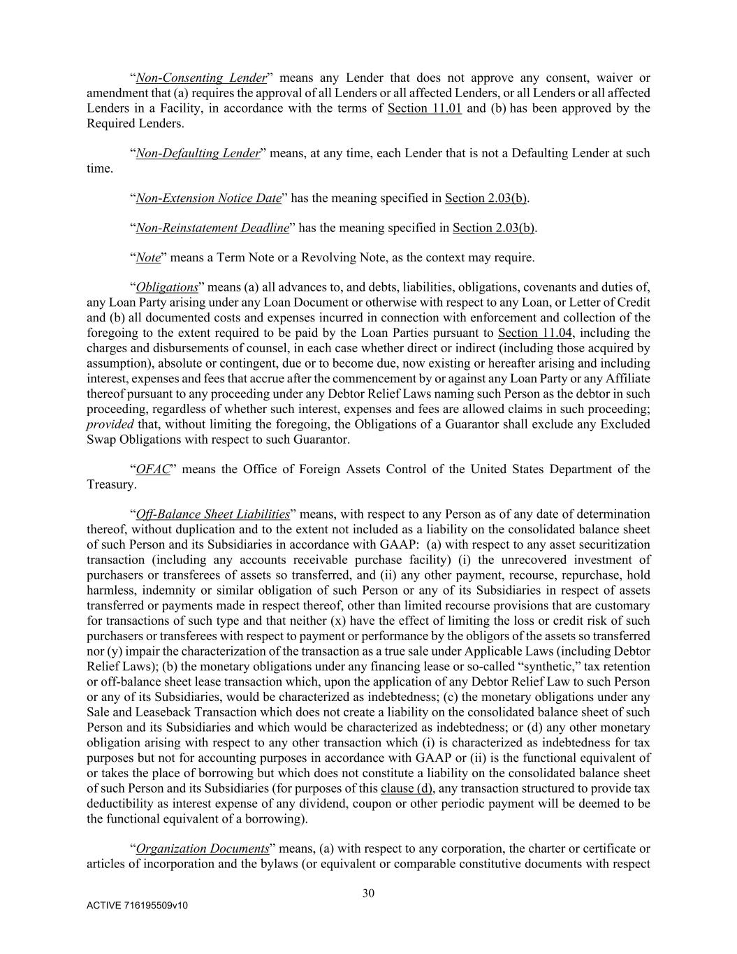 30 ACTIVE 716195509v10 “Non-Consenting Lender” means any Lender that does not approve any consent, waiver or amendment that (a) requires the approval of all Lenders or all affected Lenders, or all Lenders or all affected Lenders in a Facility, in accordance with the terms of Section 11.01 and (b) has been approved by the Required Lenders. “Non-Defaulting Lender” means, at any time, each Lender that is not a Defaulting Lender at such time. “Non-Extension Notice Date” has the meaning specified in Section 2.03(b). “Non-Reinstatement Deadline” has the meaning specified in Section 2.03(b). “Note” means a Term Note or a Revolving Note, as the context may require. “Obligations” means (a) all advances to, and debts, liabilities, obligations, covenants and duties of, any Loan Party arising under any Loan Document or otherwise with respect to any Loan, or Letter of Credit and (b) all documented costs and expenses incurred in connection with enforcement and collection of the foregoing to the extent required to be paid by the Loan Parties pursuant to Section 11.04, including the charges and disbursements of counsel, in each case whether direct or indirect (including those acquired by assumption), absolute or contingent, due or to become due, now existing or hereafter arising and including interest, expenses and fees that accrue after the commencement by or against any Loan Party or any Affiliate thereof pursuant to any proceeding under any Debtor Relief Laws naming such Person as the debtor in such proceeding, regardless of whether such interest, expenses and fees are allowed claims in such proceeding; provided that, without limiting the foregoing, the Obligations of a Guarantor shall exclude any Excluded Swap Obligations with respect to such Guarantor. “OFAC” means the Office of Foreign Assets Control of the United States Department of the Treasury. “Off-Balance Sheet Liabilities” means, with respect to any Person as of any date of determination thereof, without duplication and to the extent not included as a liability on the consolidated balance sheet of such Person and its Subsidiaries in accordance with GAAP: (a) with respect to any asset securitization transaction (including any accounts receivable purchase facility) (i) the unrecovered investment of purchasers or transferees of assets so transferred, and (ii) any other payment, recourse, repurchase, hold harmless, indemnity or similar obligation of such Person or any of its Subsidiaries in respect of assets transferred or payments made in respect thereof, other than limited recourse provisions that are customary for transactions of such type and that neither (x) have the effect of limiting the loss or credit risk of such purchasers or transferees with respect to payment or performance by the obligors of the assets so transferred nor (y) impair the characterization of the transaction as a true sale under Applicable Laws (including Debtor Relief Laws); (b) the monetary obligations under any financing lease or so-called “synthetic,” tax retention or off-balance sheet lease transaction which, upon the application of any Debtor Relief Law to such Person or any of its Subsidiaries, would be characterized as indebtedness; (c) the monetary obligations under any Sale and Leaseback Transaction which does not create a liability on the consolidated balance sheet of such Person and its Subsidiaries and which would be characterized as indebtedness; or (d) any other monetary obligation arising with respect to any other transaction which (i) is characterized as indebtedness for tax purposes but not for accounting purposes in accordance with GAAP or (ii) is the functional equivalent of or takes the place of borrowing but which does not constitute a liability on the consolidated balance sheet of such Person and its Subsidiaries (for purposes of this clause (d), any transaction structured to provide tax deductibility as interest expense of any dividend, coupon or other periodic payment will be deemed to be the functional equivalent of a borrowing). “Organization Documents” means, (a) with respect to any corporation, the charter or certificate or articles of incorporation and the bylaws (or equivalent or comparable constitutive documents with respect