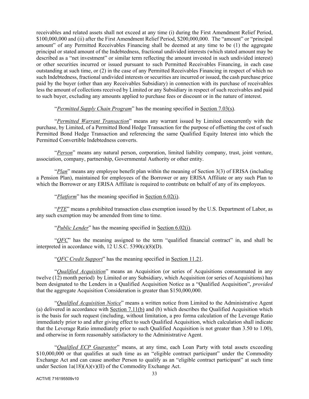 33 ACTIVE 716195509v10 receivables and related assets shall not exceed at any time (i) during the First Amendment Relief Period, $100,000,000 and (ii) after the First Amendment Relief Period, $200,000,000. The “amount” or “principal amount” of any Permitted Receivables Financing shall be deemed at any time to be (1) the aggregate principal or stated amount of the Indebtedness, fractional undivided interests (which stated amount may be described as a “net investment” or similar term reflecting the amount invested in such undivided interest) or other securities incurred or issued pursuant to such Permitted Receivables Financing, in each case outstanding at such time, or (2) in the case of any Permitted Receivables Financing in respect of which no such Indebtedness, fractional undivided interests or securities are incurred or issued, the cash purchase price paid by the buyer (other than any Receivables Subsidiary) in connection with its purchase of receivables less the amount of collections received by Limited or any Subsidiary in respect of such receivables and paid to such buyer, excluding any amounts applied to purchase fees or discount or in the nature of interest. “Permitted Supply Chain Program” has the meaning specified in Section 7.03(s). “Permitted Warrant Transaction” means any warrant issued by Limited concurrently with the purchase, by Limited, of a Permitted Bond Hedge Transaction for the purpose of offsetting the cost of such Permitted Bond Hedge Transaction and referencing the same Qualified Equity Interest into which the Permitted Convertible Indebtedness converts. “Person” means any natural person, corporation, limited liability company, trust, joint venture, association, company, partnership, Governmental Authority or other entity. “Plan” means any employee benefit plan within the meaning of Section 3(3) of ERISA (including a Pension Plan), maintained for employees of the Borrower or any ERISA Affiliate or any such Plan to which the Borrower or any ERISA Affiliate is required to contribute on behalf of any of its employees. “Platform” has the meaning specified in Section 6.02(i). “PTE” means a prohibited transaction class exemption issued by the U.S. Department of Labor, as any such exemption may be amended from time to time. “Public Lender” has the meaning specified in Section 6.02(i). “QFC” has the meaning assigned to the term “qualified financial contract” in, and shall be interpreted in accordance with, 12 U.S.C. 5390(c)(8)(D). “QFC Credit Support” has the meaning specified in Section 11.21. “Qualified Acquisition” means an Acquisition (or series of Acquisitions consummated in any twelve (12) month period) by Limited or any Subsidiary, which Acquisition (or series of Acquisitions) has been designated to the Lenders in a Qualified Acquisition Notice as a “Qualified Acquisition”, provided that the aggregate Acquisition Consideration is greater than $150,000,000. “Qualified Acquisition Notice” means a written notice from Limited to the Administrative Agent (a) delivered in accordance with Section 7.11(b) and (b) which describes the Qualified Acquisition which is the basis for such request (including, without limitation, a pro forma calculation of the Leverage Ratio immediately prior to and after giving effect to such Qualified Acquisition, which calculation shall indicate that the Leverage Ratio immediately prior to such Qualified Acquisition is not greater than 3.50 to 1.00), and otherwise in form reasonably satisfactory to the Administrative Agent. “Qualified ECP Guarantor” means, at any time, each Loan Party with total assets exceeding $10,000,000 or that qualifies at such time as an “eligible contract participant” under the Commodity Exchange Act and can cause another Person to qualify as an “eligible contract participant” at such time under Section 1a(18)(A)(v)(II) of the Commodity Exchange Act.