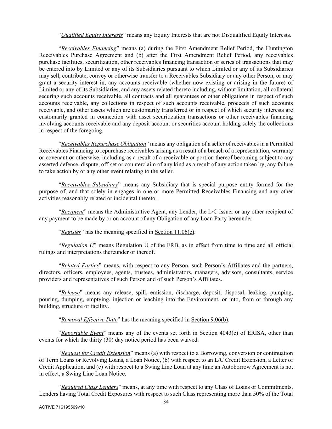 34 ACTIVE 716195509v10 “Qualified Equity Interests” means any Equity Interests that are not Disqualified Equity Interests. “Receivables Financing” means (a) during the First Amendment Relief Period, the Huntington Receivables Purchase Agreement and (b) after the First Amendment Relief Period, any receivables purchase facilities, securitization, other receivables financing transaction or series of transactions that may be entered into by Limited or any of its Subsidiaries pursuant to which Limited or any of its Subsidiaries may sell, contribute, convey or otherwise transfer to a Receivables Subsidiary or any other Person, or may grant a security interest in, any accounts receivable (whether now existing or arising in the future) of Limited or any of its Subsidiaries, and any assets related thereto including, without limitation, all collateral securing such accounts receivable, all contracts and all guarantees or other obligations in respect of such accounts receivable, any collections in respect of such accounts receivable, proceeds of such accounts receivable, and other assets which are customarily transferred or in respect of which security interests are customarily granted in connection with asset securitization transactions or other receivables financing involving accounts receivable and any deposit account or securities account holding solely the collections in respect of the foregoing. “Receivables Repurchase Obligation” means any obligation of a seller of receivables in a Permitted Receivables Financing to repurchase receivables arising as a result of a breach of a representation, warranty or covenant or otherwise, including as a result of a receivable or portion thereof becoming subject to any asserted defense, dispute, off-set or counterclaim of any kind as a result of any action taken by, any failure to take action by or any other event relating to the seller. “Receivables Subsidiary” means any Subsidiary that is special purpose entity formed for the purpose of, and that solely in engages in one or more Permitted Receivables Financing and any other activities reasonably related or incidental thereto. “Recipient” means the Administrative Agent, any Lender, the L/C Issuer or any other recipient of any payment to be made by or on account of any Obligation of any Loan Party hereunder. “Register” has the meaning specified in Section 11.06(c). “Regulation U” means Regulation U of the FRB, as in effect from time to time and all official rulings and interpretations thereunder or thereof. “Related Parties” means, with respect to any Person, such Person’s Affiliates and the partners, directors, officers, employees, agents, trustees, administrators, managers, advisors, consultants, service providers and representatives of such Person and of such Person’s Affiliates. “Release” means any release, spill, emission, discharge, deposit, disposal, leaking, pumping, pouring, dumping, emptying, injection or leaching into the Environment, or into, from or through any building, structure or facility. “Removal Effective Date” has the meaning specified in Section 9.06(b). “Reportable Event” means any of the events set forth in Section 4043(c) of ERISA, other than events for which the thirty (30) day notice period has been waived. “Request for Credit Extension” means (a) with respect to a Borrowing, conversion or continuation of Term Loans or Revolving Loans, a Loan Notice, (b) with respect to an L/C Credit Extension, a Letter of Credit Application, and (c) with respect to a Swing Line Loan at any time an Autoborrow Agreement is not in effect, a Swing Line Loan Notice. “Required Class Lenders” means, at any time with respect to any Class of Loans or Commitments, Lenders having Total Credit Exposures with respect to such Class representing more than 50% of the Total
