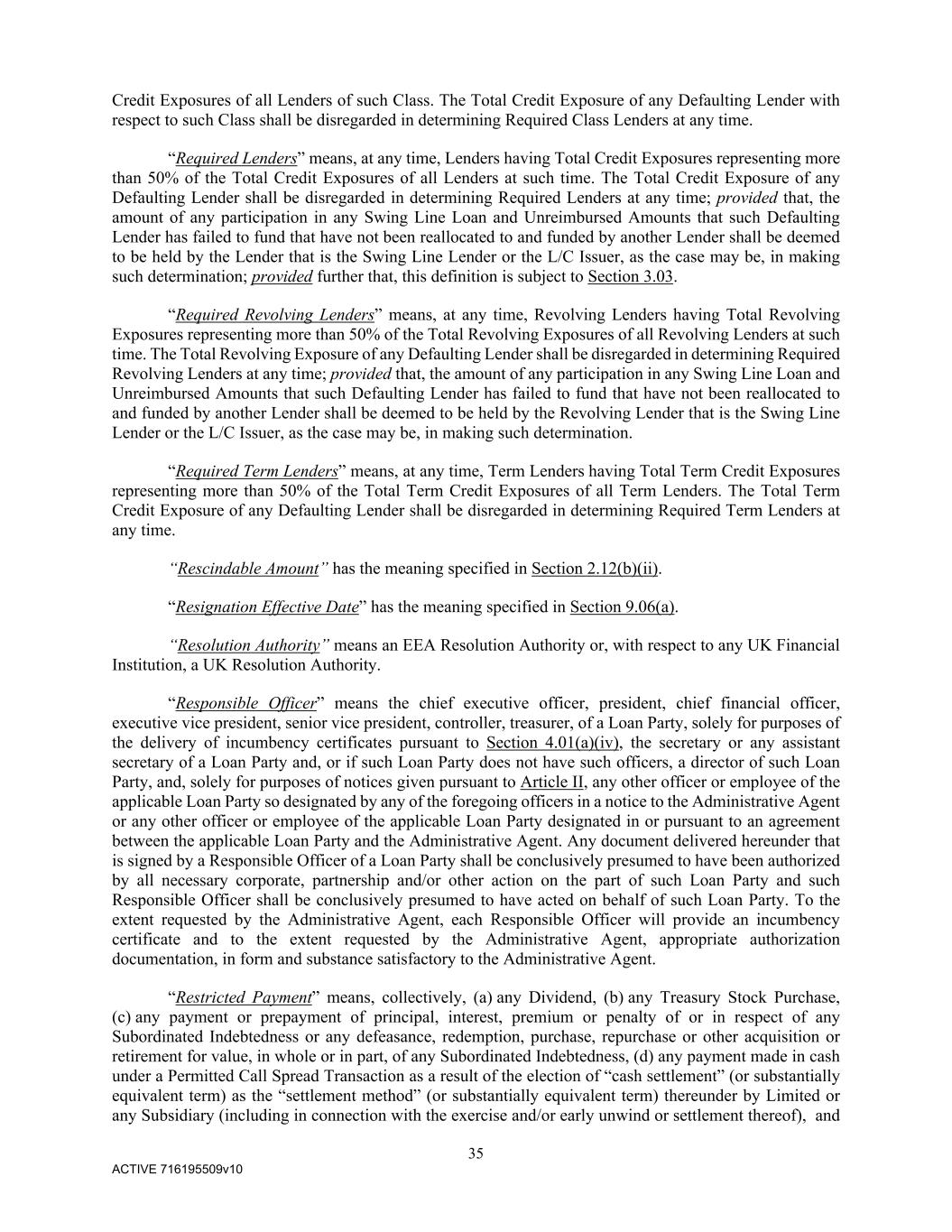 35 ACTIVE 716195509v10 Credit Exposures of all Lenders of such Class. The Total Credit Exposure of any Defaulting Lender with respect to such Class shall be disregarded in determining Required Class Lenders at any time. “Required Lenders” means, at any time, Lenders having Total Credit Exposures representing more than 50% of the Total Credit Exposures of all Lenders at such time. The Total Credit Exposure of any Defaulting Lender shall be disregarded in determining Required Lenders at any time; provided that, the amount of any participation in any Swing Line Loan and Unreimbursed Amounts that such Defaulting Lender has failed to fund that have not been reallocated to and funded by another Lender shall be deemed to be held by the Lender that is the Swing Line Lender or the L/C Issuer, as the case may be, in making such determination; provided further that, this definition is subject to Section 3.03. “Required Revolving Lenders” means, at any time, Revolving Lenders having Total Revolving Exposures representing more than 50% of the Total Revolving Exposures of all Revolving Lenders at such time. The Total Revolving Exposure of any Defaulting Lender shall be disregarded in determining Required Revolving Lenders at any time; provided that, the amount of any participation in any Swing Line Loan and Unreimbursed Amounts that such Defaulting Lender has failed to fund that have not been reallocated to and funded by another Lender shall be deemed to be held by the Revolving Lender that is the Swing Line Lender or the L/C Issuer, as the case may be, in making such determination. “Required Term Lenders” means, at any time, Term Lenders having Total Term Credit Exposures representing more than 50% of the Total Term Credit Exposures of all Term Lenders. The Total Term Credit Exposure of any Defaulting Lender shall be disregarded in determining Required Term Lenders at any time. “Rescindable Amount” has the meaning specified in Section 2.12(b)(ii). “Resignation Effective Date” has the meaning specified in Section 9.06(a). “Resolution Authority” means an EEA Resolution Authority or, with respect to any UK Financial Institution, a UK Resolution Authority. “Responsible Officer” means the chief executive officer, president, chief financial officer, executive vice president, senior vice president, controller, treasurer, of a Loan Party, solely for purposes of the delivery of incumbency certificates pursuant to Section 4.01(a)(iv), the secretary or any assistant secretary of a Loan Party and, or if such Loan Party does not have such officers, a director of such Loan Party, and, solely for purposes of notices given pursuant to Article II, any other officer or employee of the applicable Loan Party so designated by any of the foregoing officers in a notice to the Administrative Agent or any other officer or employee of the applicable Loan Party designated in or pursuant to an agreement between the applicable Loan Party and the Administrative Agent. Any document delivered hereunder that is signed by a Responsible Officer of a Loan Party shall be conclusively presumed to have been authorized by all necessary corporate, partnership and/or other action on the part of such Loan Party and such Responsible Officer shall be conclusively presumed to have acted on behalf of such Loan Party. To the extent requested by the Administrative Agent, each Responsible Officer will provide an incumbency certificate and to the extent requested by the Administrative Agent, appropriate authorization documentation, in form and substance satisfactory to the Administrative Agent. “Restricted Payment” means, collectively, (a) any Dividend, (b) any Treasury Stock Purchase, (c) any payment or prepayment of principal, interest, premium or penalty of or in respect of any Subordinated Indebtedness or any defeasance, redemption, purchase, repurchase or other acquisition or retirement for value, in whole or in part, of any Subordinated Indebtedness, (d) any payment made in cash under a Permitted Call Spread Transaction as a result of the election of “cash settlement” (or substantially equivalent term) as the “settlement method” (or substantially equivalent term) thereunder by Limited or any Subsidiary (including in connection with the exercise and/or early unwind or settlement thereof), and