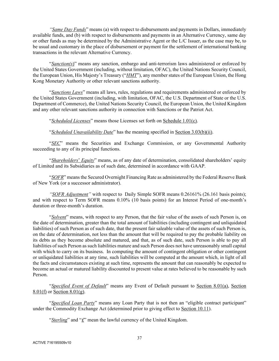 37 ACTIVE 716195509v10 “Same Day Funds” means (a) with respect to disbursements and payments in Dollars, immediately available funds, and (b) with respect to disbursements and payments in an Alternative Currency, same day or other funds as may be determined by the Administrative Agent or the L/C Issuer, as the case may be, to be usual and customary in the place of disbursement or payment for the settlement of international banking transactions in the relevant Alternative Currency. “Sanction(s)” means any sanction, embargo and anti-terrorism laws administered or enforced by the United States Government (including, without limitation, OFAC), the United Nations Security Council, the European Union, His Majesty’s Treasury (“HMT”), any member states of the European Union, the Hong Kong Monetary Authority or other relevant sanctions authority. “Sanctions Laws” means all laws, rules, regulations and requirements administered or enforced by the United States Government (including, with limitation, OFAC, the U.S. Department of State or the U.S. Department of Commerce), the United Nations Security Council, the European Union, the United Kingdom and any other relevant sanctions authority in connection with Sanctions or the Patriot Act. “Scheduled Licenses” means those Licenses set forth on Schedule 1.01(c). “Scheduled Unavailability Date” has the meaning specified in Section 3.03(b)(ii). “SEC” means the Securities and Exchange Commission, or any Governmental Authority succeeding to any of its principal functions. “Shareholders’ Equity” means, as of any date of determination, consolidated shareholders’ equity of Limited and its Subsidiaries as of such date, determined in accordance with GAAP. “SOFR” means the Secured Overnight Financing Rate as administered by the Federal Reserve Bank of New York (or a successor administrator). “SOFR Adjustment” with respect to Daily Simple SOFR means 0.26161% (26.161 basis points); and with respect to Term SOFR means 0.10% (10 basis points) for an Interest Period of one-month’s duration or three-month’s duration. “Solvent” means, with respect to any Person, that the fair value of the assets of such Person is, on the date of determination, greater than the total amount of liabilities (including contingent and unliquidated liabilities) of such Person as of such date, that the present fair saleable value of the assets of such Person is, on the date of determination, not less than the amount that will be required to pay the probable liability on its debts as they become absolute and matured, and that, as of such date, such Person is able to pay all liabilities of such Person as such liabilities mature and such Person does not have unreasonably small capital with which to carry on its business. In computing the amount of contingent obligation or other contingent or unliquidated liabilities at any time, such liabilities will be computed at the amount which, in light of all the facts and circumstances existing at such time, represents the amount that can reasonably be expected to become an actual or matured liability discounted to present value at rates believed to be reasonable by such Person. “Specified Event of Default” means any Event of Default pursuant to Section 8.01(a), Section 8.01(f) or Section 8.01(g). “Specified Loan Party” means any Loan Party that is not then an “eligible contract participant” under the Commodity Exchange Act (determined prior to giving effect to Section 10.11). “Sterling” and “£” mean the lawful currency of the United Kingdom.