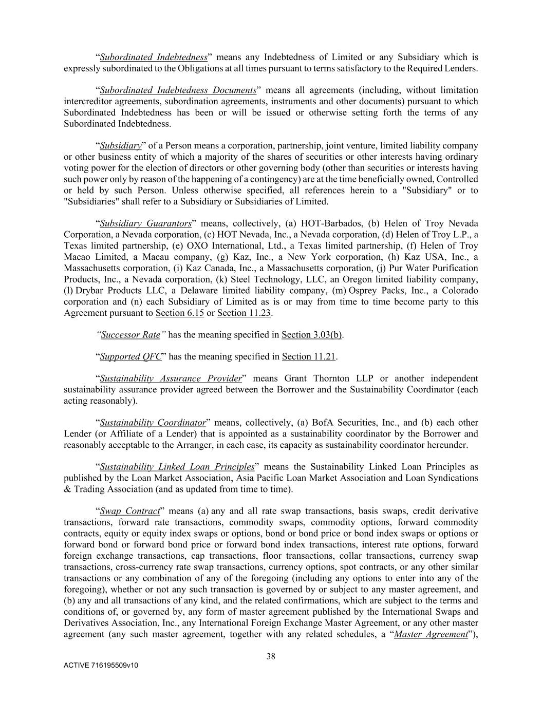 38 ACTIVE 716195509v10 “Subordinated Indebtedness” means any Indebtedness of Limited or any Subsidiary which is expressly subordinated to the Obligations at all times pursuant to terms satisfactory to the Required Lenders. “Subordinated Indebtedness Documents” means all agreements (including, without limitation intercreditor agreements, subordination agreements, instruments and other documents) pursuant to which Subordinated Indebtedness has been or will be issued or otherwise setting forth the terms of any Subordinated Indebtedness. “Subsidiary” of a Person means a corporation, partnership, joint venture, limited liability company or other business entity of which a majority of the shares of securities or other interests having ordinary voting power for the election of directors or other governing body (other than securities or interests having such power only by reason of the happening of a contingency) are at the time beneficially owned, Controlled or held by such Person. Unless otherwise specified, all references herein to a "Subsidiary" or to "Subsidiaries" shall refer to a Subsidiary or Subsidiaries of Limited. “Subsidiary Guarantors” means, collectively, (a) HOT-Barbados, (b) Helen of Troy Nevada Corporation, a Nevada corporation, (c) HOT Nevada, Inc., a Nevada corporation, (d) Helen of Troy L.P., a Texas limited partnership, (e) OXO International, Ltd., a Texas limited partnership, (f) Helen of Troy Macao Limited, a Macau company, (g) Kaz, Inc., a New York corporation, (h) Kaz USA, Inc., a Massachusetts corporation, (i) Kaz Canada, Inc., a Massachusetts corporation, (j) Pur Water Purification Products, Inc., a Nevada corporation, (k) Steel Technology, LLC, an Oregon limited liability company, (l) Drybar Products LLC, a Delaware limited liability company, (m) Osprey Packs, Inc., a Colorado corporation and (n) each Subsidiary of Limited as is or may from time to time become party to this Agreement pursuant to Section 6.15 or Section 11.23. “Successor Rate” has the meaning specified in Section 3.03(b). “Supported QFC” has the meaning specified in Section 11.21. “Sustainability Assurance Provider” means Grant Thornton LLP or another independent sustainability assurance provider agreed between the Borrower and the Sustainability Coordinator (each acting reasonably). “Sustainability Coordinator” means, collectively, (a) BofA Securities, Inc., and (b) each other Lender (or Affiliate of a Lender) that is appointed as a sustainability coordinator by the Borrower and reasonably acceptable to the Arranger, in each case, its capacity as sustainability coordinator hereunder. “Sustainability Linked Loan Principles” means the Sustainability Linked Loan Principles as published by the Loan Market Association, Asia Pacific Loan Market Association and Loan Syndications & Trading Association (and as updated from time to time). “Swap Contract” means (a) any and all rate swap transactions, basis swaps, credit derivative transactions, forward rate transactions, commodity swaps, commodity options, forward commodity contracts, equity or equity index swaps or options, bond or bond price or bond index swaps or options or forward bond or forward bond price or forward bond index transactions, interest rate options, forward foreign exchange transactions, cap transactions, floor transactions, collar transactions, currency swap transactions, cross-currency rate swap transactions, currency options, spot contracts, or any other similar transactions or any combination of any of the foregoing (including any options to enter into any of the foregoing), whether or not any such transaction is governed by or subject to any master agreement, and (b) any and all transactions of any kind, and the related confirmations, which are subject to the terms and conditions of, or governed by, any form of master agreement published by the International Swaps and Derivatives Association, Inc., any International Foreign Exchange Master Agreement, or any other master agreement (any such master agreement, together with any related schedules, a “Master Agreement”),