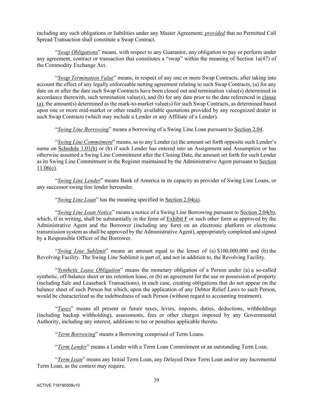 39 ACTIVE 716195509v10 including any such obligations or liabilities under any Master Agreement; provided that no Permitted Call Spread Transaction shall constitute a Swap Contract. “Swap Obligations” means, with respect to any Guarantor, any obligation to pay or perform under any agreement, contract or transaction that constitutes a “swap” within the meaning of Section 1a(47) of the Commodity Exchange Act. “Swap Termination Value” means, in respect of any one or more Swap Contracts, after taking into account the effect of any legally enforceable netting agreement relating to such Swap Contracts, (a) for any date on or after the date such Swap Contracts have been closed out and termination value(s) determined in accordance therewith, such termination value(s), and (b) for any date prior to the date referenced in clause (a), the amount(s) determined as the mark-to-market value(s) for such Swap Contracts, as determined based upon one or more mid-market or other readily available quotations provided by any recognized dealer in such Swap Contracts (which may include a Lender or any Affiliate of a Lender). “Swing Line Borrowing” means a borrowing of a Swing Line Loan pursuant to Section 2.04. “Swing Line Commitment” means, as to any Lender (a) the amount set forth opposite such Lender’s name on Schedule 1.01(b) or (b) if such Lender has entered into an Assignment and Assumption or has otherwise assumed a Swing Line Commitment after the Closing Date, the amount set forth for such Lender as its Swing Line Commitment in the Register maintained by the Administrative Agent pursuant to Section 11.06(c). “Swing Line Lender” means Bank of America in its capacity as provider of Swing Line Loans, or any successor swing line lender hereunder. “Swing Line Loan” has the meaning specified in Section 2.04(a). “Swing Line Loan Notice” means a notice of a Swing Line Borrowing pursuant to Section 2.04(b), which, if in writing, shall be substantially in the form of Exhibit F or such other form as approved by the Administrative Agent and the Borrower (including any form on an electronic platform or electronic transmission system as shall be approved by the Administrative Agent), appropriately completed and signed by a Responsible Officer of the Borrower. “Swing Line Sublimit” means an amount equal to the lesser of (a) $100,000,000 and (b) the Revolving Facility. The Swing Line Sublimit is part of, and not in addition to, the Revolving Facility. “Synthetic Lease Obligation” means the monetary obligation of a Person under (a) a so-called synthetic, off-balance sheet or tax retention lease, or (b) an agreement for the use or possession of property (including Sale and Leaseback Transactions), in each case, creating obligations that do not appear on the balance sheet of such Person but which, upon the application of any Debtor Relief Laws to such Person, would be characterized as the indebtedness of such Person (without regard to accounting treatment). “Taxes” means all present or future taxes, levies, imposts, duties, deductions, withholdings (including backup withholding), assessments, fees or other charges imposed by any Governmental Authority, including any interest, additions to tax or penalties applicable thereto. “Term Borrowing” means a Borrowing comprised of Term Loans. “Term Lender” means a Lender with a Term Loan Commitment or an outstanding Term Loan. “Term Loan” means any Initial Term Loan, any Delayed Draw Term Loan and/or any Incremental Term Loan, as the context may require.