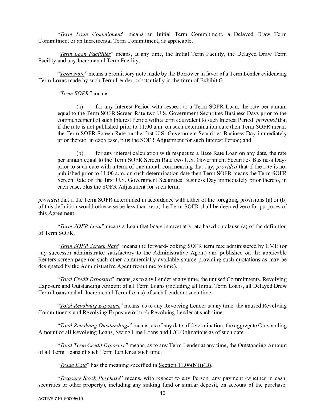 40 ACTIVE 716195509v10 “Term Loan Commitment” means an Initial Term Commitment, a Delayed Draw Term Commitment or an Incremental Term Commitment, as applicable. “Term Loan Facilities” means, at any time, the Initial Term Facility, the Delayed Draw Term Facility and any Incremental Term Facility. “Term Note” means a promissory note made by the Borrower in favor of a Term Lender evidencing Term Loans made by such Term Lender, substantially in the form of Exhibit G. “Term SOFR” means: (a) for any Interest Period with respect to a Term SOFR Loan, the rate per annum equal to the Term SOFR Screen Rate two U.S. Government Securities Business Days prior to the commencement of such Interest Period with a term equivalent to such Interest Period; provided that if the rate is not published prior to 11:00 a.m. on such determination date then Term SOFR means the Term SOFR Screen Rate on the first U.S. Government Securities Business Day immediately prior thereto, in each case, plus the SOFR Adjustment for such Interest Period; and (b) for any interest calculation with respect to a Base Rate Loan on any date, the rate per annum equal to the Term SOFR Screen Rate two U.S. Government Securities Business Days prior to such date with a term of one month commencing that day; provided that if the rate is not published prior to 11:00 a.m. on such determination date then Term SOFR means the Term SOFR Screen Rate on the first U.S. Government Securities Business Day immediately prior thereto, in each case, plus the SOFR Adjustment for such term; provided that if the Term SOFR determined in accordance with either of the foregoing provisions (a) or (b) of this definition would otherwise be less than zero, the Term SOFR shall be deemed zero for purposes of this Agreement. “Term SOFR Loan” means a Loan that bears interest at a rate based on clause (a) of the definition of Term SOFR. “Term SOFR Screen Rate” means the forward-looking SOFR term rate administered by CME (or any successor administrator satisfactory to the Administrative Agent) and published on the applicable Reuters screen page (or such other commercially available source providing such quotations as may be designated by the Administrative Agent from time to time). “Total Credit Exposure” means, as to any Lender at any time, the unused Commitments, Revolving Exposure and Outstanding Amount of all Term Loans (including all Initial Term Loans, all Delayed Draw Term Loans and all Incremental Term Loans) of such Lender at such time. “Total Revolving Exposure” means, as to any Revolving Lender at any time, the unused Revolving Commitments and Revolving Exposure of such Revolving Lender at such time. “Total Revolving Outstandings” means, as of any date of determination, the aggregate Outstanding Amount of all Revolving Loans, Swing Line Loans and L/C Obligations as of such date. “Total Term Credit Exposure” means, as to any Term Lender at any time, the Outstanding Amount of all Term Loans of such Term Lender at such time. “Trade Date” has the meaning specified in Section 11.06(b)(i)(B). “Treasury Stock Purchase” means, with respect to any Person, any payment (whether in cash, securities or other property), including any sinking fund or similar deposit, on account of the purchase,