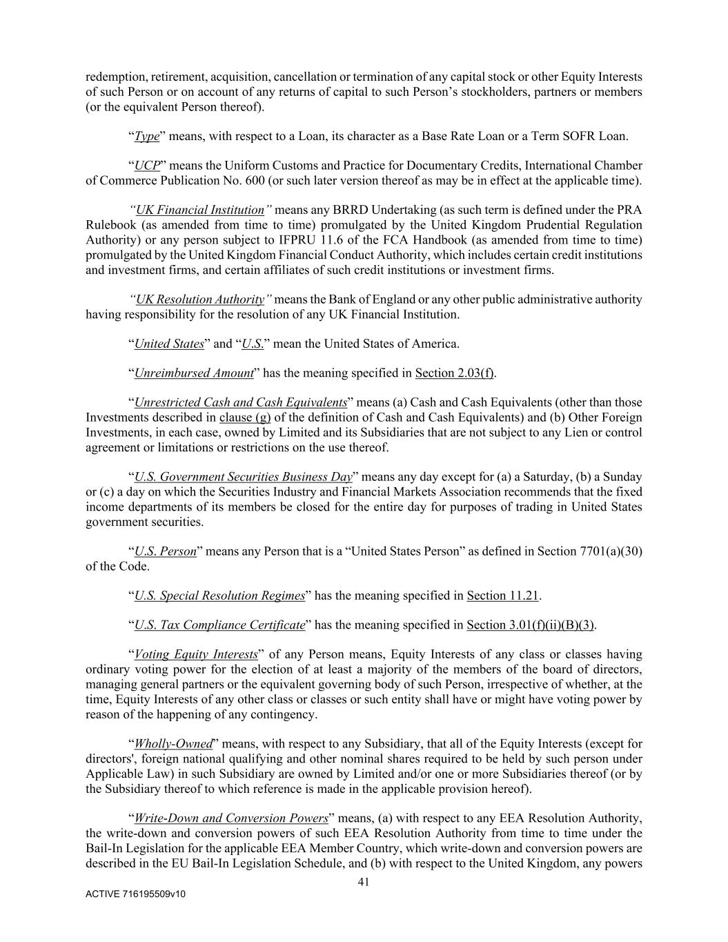 41 ACTIVE 716195509v10 redemption, retirement, acquisition, cancellation or termination of any capital stock or other Equity Interests of such Person or on account of any returns of capital to such Person’s stockholders, partners or members (or the equivalent Person thereof). “Type” means, with respect to a Loan, its character as a Base Rate Loan or a Term SOFR Loan. “UCP” means the Uniform Customs and Practice for Documentary Credits, International Chamber of Commerce Publication No. 600 (or such later version thereof as may be in effect at the applicable time). “UK Financial Institution” means any BRRD Undertaking (as such term is defined under the PRA Rulebook (as amended from time to time) promulgated by the United Kingdom Prudential Regulation Authority) or any person subject to IFPRU 11.6 of the FCA Handbook (as amended from time to time) promulgated by the United Kingdom Financial Conduct Authority, which includes certain credit institutions and investment firms, and certain affiliates of such credit institutions or investment firms. “UK Resolution Authority” means the Bank of England or any other public administrative authority having responsibility for the resolution of any UK Financial Institution. “United States” and “U.S.” mean the United States of America. “Unreimbursed Amount” has the meaning specified in Section 2.03(f). “Unrestricted Cash and Cash Equivalents” means (a) Cash and Cash Equivalents (other than those Investments described in clause (g) of the definition of Cash and Cash Equivalents) and (b) Other Foreign Investments, in each case, owned by Limited and its Subsidiaries that are not subject to any Lien or control agreement or limitations or restrictions on the use thereof. “U.S. Government Securities Business Day” means any day except for (a) a Saturday, (b) a Sunday or (c) a day on which the Securities Industry and Financial Markets Association recommends that the fixed income departments of its members be closed for the entire day for purposes of trading in United States government securities. “U.S. Person” means any Person that is a “United States Person” as defined in Section 7701(a)(30) of the Code. “U.S. Special Resolution Regimes” has the meaning specified in Section 11.21. “U.S. Tax Compliance Certificate” has the meaning specified in Section 3.01(f)(ii)(B)(3). “Voting Equity Interests” of any Person means, Equity Interests of any class or classes having ordinary voting power for the election of at least a majority of the members of the board of directors, managing general partners or the equivalent governing body of such Person, irrespective of whether, at the time, Equity Interests of any other class or classes or such entity shall have or might have voting power by reason of the happening of any contingency. “Wholly-Owned” means, with respect to any Subsidiary, that all of the Equity Interests (except for directors', foreign national qualifying and other nominal shares required to be held by such person under Applicable Law) in such Subsidiary are owned by Limited and/or one or more Subsidiaries thereof (or by the Subsidiary thereof to which reference is made in the applicable provision hereof). “Write-Down and Conversion Powers” means, (a) with respect to any EEA Resolution Authority, the write-down and conversion powers of such EEA Resolution Authority from time to time under the Bail-In Legislation for the applicable EEA Member Country, which write-down and conversion powers are described in the EU Bail-In Legislation Schedule, and (b) with respect to the United Kingdom, any powers