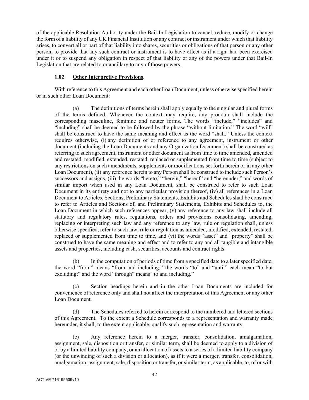 42 ACTIVE 716195509v10 of the applicable Resolution Authority under the Bail-In Legislation to cancel, reduce, modify or change the form of a liability of any UK Financial Institution or any contract or instrument under which that liability arises, to convert all or part of that liability into shares, securities or obligations of that person or any other person, to provide that any such contract or instrument is to have effect as if a right had been exercised under it or to suspend any obligation in respect of that liability or any of the powers under that Bail-In Legislation that are related to or ancillary to any of those powers. 1.02 Other Interpretive Provisions. With reference to this Agreement and each other Loan Document, unless otherwise specified herein or in such other Loan Document: (a) The definitions of terms herein shall apply equally to the singular and plural forms of the terms defined. Whenever the context may require, any pronoun shall include the corresponding masculine, feminine and neuter forms. The words “include,” “includes” and “including” shall be deemed to be followed by the phrase “without limitation.” The word “will” shall be construed to have the same meaning and effect as the word “shall.” Unless the context requires otherwise, (i) any definition of or reference to any agreement, instrument or other document (including the Loan Documents and any Organization Document) shall be construed as referring to such agreement, instrument or other document as from time to time amended, amended and restated, modified, extended, restated, replaced or supplemented from time to time (subject to any restrictions on such amendments, supplements or modifications set forth herein or in any other Loan Document), (ii) any reference herein to any Person shall be construed to include such Person’s successors and assigns, (iii) the words “hereto,” “herein,” “hereof” and “hereunder,” and words of similar import when used in any Loan Document, shall be construed to refer to such Loan Document in its entirety and not to any particular provision thereof, (iv) all references in a Loan Document to Articles, Sections, Preliminary Statements, Exhibits and Schedules shall be construed to refer to Articles and Sections of, and Preliminary Statements, Exhibits and Schedules to, the Loan Document in which such references appear, (v) any reference to any law shall include all statutory and regulatory rules, regulations, orders and provisions consolidating, amending, replacing or interpreting such law and any reference to any law, rule or regulation shall, unless otherwise specified, refer to such law, rule or regulation as amended, modified, extended, restated, replaced or supplemented from time to time, and (vi) the words “asset” and “property” shall be construed to have the same meaning and effect and to refer to any and all tangible and intangible assets and properties, including cash, securities, accounts and contract rights. (b) In the computation of periods of time from a specified date to a later specified date, the word “from” means “from and including;” the words “to” and “until” each mean “to but excluding;” and the word “through” means “to and including.” (c) Section headings herein and in the other Loan Documents are included for convenience of reference only and shall not affect the interpretation of this Agreement or any other Loan Document. (d) The Schedules referred to herein correspond to the numbered and lettered sections of this Agreement. To the extent a Schedule corresponds to a representation and warranty made hereunder, it shall, to the extent applicable, qualify such representation and warranty. (e) Any reference herein to a merger, transfer, consolidation, amalgamation, assignment, sale, disposition or transfer, or similar term, shall be deemed to apply to a division of or by a limited liability company, or an allocation of assets to a series of a limited liability company (or the unwinding of such a division or allocation), as if it were a merger, transfer, consolidation, amalgamation, assignment, sale, disposition or transfer, or similar term, as applicable, to, of or with