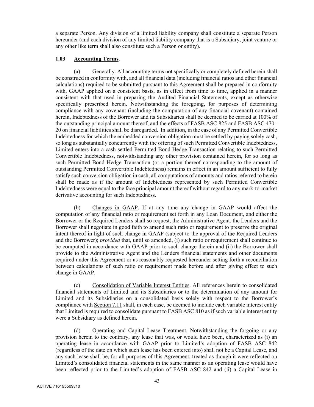 43 ACTIVE 716195509v10 a separate Person. Any division of a limited liability company shall constitute a separate Person hereunder (and each division of any limited liability company that is a Subsidiary, joint venture or any other like term shall also constitute such a Person or entity). 1.03 Accounting Terms. (a) Generally. All accounting terms not specifically or completely defined herein shall be construed in conformity with, and all financial data (including financial ratios and other financial calculations) required to be submitted pursuant to this Agreement shall be prepared in conformity with, GAAP applied on a consistent basis, as in effect from time to time, applied in a manner consistent with that used in preparing the Audited Financial Statements, except as otherwise specifically prescribed herein. Notwithstanding the foregoing, for purposes of determining compliance with any covenant (including the computation of any financial covenant) contained herein, Indebtedness of the Borrower and its Subsidiaries shall be deemed to be carried at 100% of the outstanding principal amount thereof, and the effects of FASB ASC 825 and FASB ASC 470– 20 on financial liabilities shall be disregarded. In addition, in the case of any Permitted Convertible Indebtedness for which the embedded conversion obligation must be settled by paying solely cash, so long as substantially concurrently with the offering of such Permitted Convertible Indebtedness, Limited enters into a cash-settled Permitted Bond Hedge Transaction relating to such Permitted Convertible Indebtedness, notwithstanding any other provision contained herein, for so long as such Permitted Bond Hedge Transaction (or a portion thereof corresponding to the amount of outstanding Permitted Convertible Indebtedness) remains in effect in an amount sufficient to fully satisfy such conversion obligation in cash, all computations of amounts and ratios referred to herein shall be made as if the amount of Indebtedness represented by such Permitted Convertible Indebtedness were equal to the face principal amount thereof without regard to any mark-to-market derivative accounting for such Indebtedness. (b) Changes in GAAP. If at any time any change in GAAP would affect the computation of any financial ratio or requirement set forth in any Loan Document, and either the Borrower or the Required Lenders shall so request, the Administrative Agent, the Lenders and the Borrower shall negotiate in good faith to amend such ratio or requirement to preserve the original intent thereof in light of such change in GAAP (subject to the approval of the Required Lenders and the Borrower); provided that, until so amended, (i) such ratio or requirement shall continue to be computed in accordance with GAAP prior to such change therein and (ii) the Borrower shall provide to the Administrative Agent and the Lenders financial statements and other documents required under this Agreement or as reasonably requested hereunder setting forth a reconciliation between calculations of such ratio or requirement made before and after giving effect to such change in GAAP. (c) Consolidation of Variable Interest Entities. All references herein to consolidated financial statements of Limited and its Subsidiaries or to the determination of any amount for Limited and its Subsidiaries on a consolidated basis solely with respect to the Borrower’s compliance with Section 7.11 shall, in each case, be deemed to include each variable interest entity that Limited is required to consolidate pursuant to FASB ASC 810 as if such variable interest entity were a Subsidiary as defined herein. (d) Operating and Capital Lease Treatment. Notwithstanding the forgoing or any provision herein to the contrary, any lease that was, or would have been, characterized as (i) an operating lease in accordance with GAAP prior to Limited’s adoption of FASB ASC 842 (regardless of the date on which such lease has been entered into) shall not be a Capital Lease, and any such lease shall be, for all purposes of this Agreement, treated as though it were reflected on Limited’s consolidated financial statements in the same manner as an operating lease would have been reflected prior to the Limited’s adoption of FASB ASC 842 and (ii) a Capital Lease in