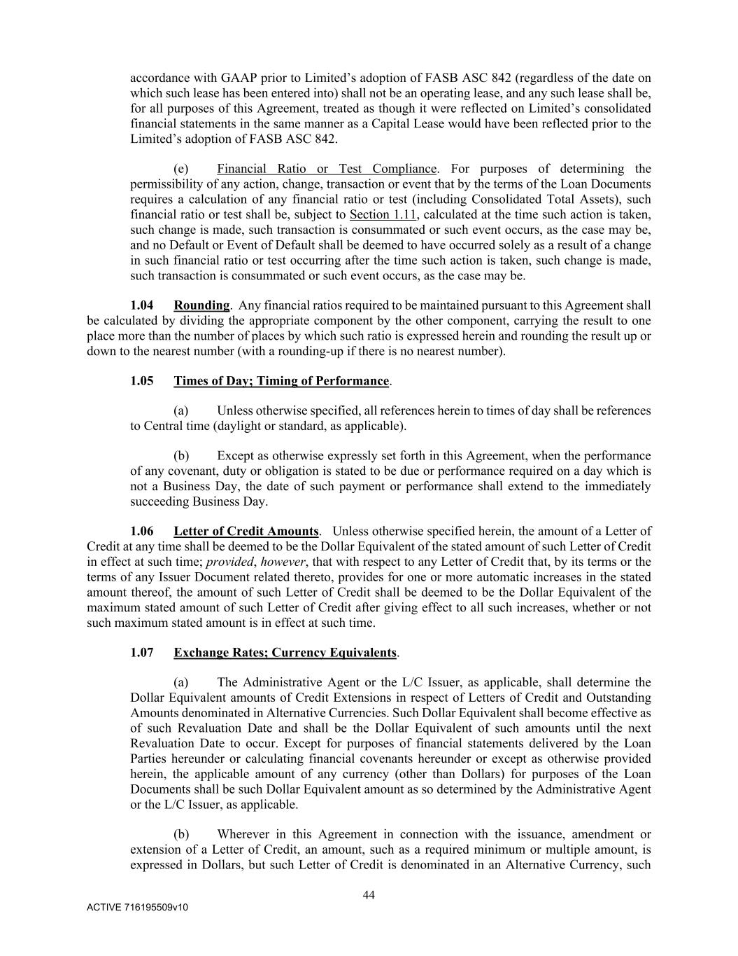 44 ACTIVE 716195509v10 accordance with GAAP prior to Limited’s adoption of FASB ASC 842 (regardless of the date on which such lease has been entered into) shall not be an operating lease, and any such lease shall be, for all purposes of this Agreement, treated as though it were reflected on Limited’s consolidated financial statements in the same manner as a Capital Lease would have been reflected prior to the Limited’s adoption of FASB ASC 842. (e) Financial Ratio or Test Compliance. For purposes of determining the permissibility of any action, change, transaction or event that by the terms of the Loan Documents requires a calculation of any financial ratio or test (including Consolidated Total Assets), such financial ratio or test shall be, subject to Section 1.11, calculated at the time such action is taken, such change is made, such transaction is consummated or such event occurs, as the case may be, and no Default or Event of Default shall be deemed to have occurred solely as a result of a change in such financial ratio or test occurring after the time such action is taken, such change is made, such transaction is consummated or such event occurs, as the case may be. 1.04 Rounding. Any financial ratios required to be maintained pursuant to this Agreement shall be calculated by dividing the appropriate component by the other component, carrying the result to one place more than the number of places by which such ratio is expressed herein and rounding the result up or down to the nearest number (with a rounding-up if there is no nearest number). 1.05 Times of Day; Timing of Performance. (a) Unless otherwise specified, all references herein to times of day shall be references to Central time (daylight or standard, as applicable). (b) Except as otherwise expressly set forth in this Agreement, when the performance of any covenant, duty or obligation is stated to be due or performance required on a day which is not a Business Day, the date of such payment or performance shall extend to the immediately succeeding Business Day. 1.06 Letter of Credit Amounts. Unless otherwise specified herein, the amount of a Letter of Credit at any time shall be deemed to be the Dollar Equivalent of the stated amount of such Letter of Credit in effect at such time; provided, however, that with respect to any Letter of Credit that, by its terms or the terms of any Issuer Document related thereto, provides for one or more automatic increases in the stated amount thereof, the amount of such Letter of Credit shall be deemed to be the Dollar Equivalent of the maximum stated amount of such Letter of Credit after giving effect to all such increases, whether or not such maximum stated amount is in effect at such time. 1.07 Exchange Rates; Currency Equivalents. (a) The Administrative Agent or the L/C Issuer, as applicable, shall determine the Dollar Equivalent amounts of Credit Extensions in respect of Letters of Credit and Outstanding Amounts denominated in Alternative Currencies. Such Dollar Equivalent shall become effective as of such Revaluation Date and shall be the Dollar Equivalent of such amounts until the next Revaluation Date to occur. Except for purposes of financial statements delivered by the Loan Parties hereunder or calculating financial covenants hereunder or except as otherwise provided herein, the applicable amount of any currency (other than Dollars) for purposes of the Loan Documents shall be such Dollar Equivalent amount as so determined by the Administrative Agent or the L/C Issuer, as applicable. (b) Wherever in this Agreement in connection with the issuance, amendment or extension of a Letter of Credit, an amount, such as a required minimum or multiple amount, is expressed in Dollars, but such Letter of Credit is denominated in an Alternative Currency, such
