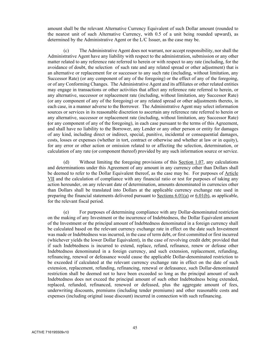 45 ACTIVE 716195509v10 amount shall be the relevant Alternative Currency Equivalent of such Dollar amount (rounded to the nearest unit of such Alternative Currency, with 0.5 of a unit being rounded upward), as determined by the Administrative Agent or the L/C Issuer, as the case may be. (c) The Administrative Agent does not warrant, nor accept responsibility, nor shall the Administrative Agent have any liability with respect to the administration, submission or any other matter related to any reference rate referred to herein or with respect to any rate (including, for the avoidance of doubt, the selection of such rate and any related spread or other adjustment) that is an alternative or replacement for or successor to any such rate (including, without limitation, any Successor Rate) (or any component of any of the foregoing) or the effect of any of the foregoing, or of any Conforming Changes. The Administrative Agent and its affiliates or other related entities may engage in transactions or other activities that affect any reference rate referred to herein, or any alternative, successor or replacement rate (including, without limitation, any Successor Rate) (or any component of any of the foregoing) or any related spread or other adjustments thereto, in each case, in a manner adverse to the Borrower. The Administrative Agent may select information sources or services in its reasonable discretion to ascertain any reference rate referred to herein or any alternative, successor or replacement rate (including, without limitation, any Successor Rate) (or any component of any of the foregoing), in each case pursuant to the terms of this Agreement, and shall have no liability to the Borrower, any Lender or any other person or entity for damages of any kind, including direct or indirect, special, punitive, incidental or consequential damages, costs, losses or expenses (whether in tort, contract or otherwise and whether at law or in equity), for any error or other action or omission related to or affecting the selection, determination, or calculation of any rate (or component thereof) provided by any such information source or service. (d) Without limiting the foregoing provisions of this Section 1.07, any calculations and determinations under this Agreement of any amount in any currency other than Dollars shall be deemed to refer to the Dollar Equivalent thereof, as the case may be. For purposes of Article VII and the calculation of compliance with any financial ratio or test for purposes of taking any action hereunder, on any relevant date of determination, amounts denominated in currencies other than Dollars shall be translated into Dollars at the applicable currency exchange rate used in preparing the financial statements delivered pursuant to Sections 6.01(a) or 6.01(b), as applicable, for the relevant fiscal period. (e) For purposes of determining compliance with any Dollar-denominated restriction on the making of any Investment or the incurrence of Indebtedness, the Dollar Equivalent amount of the Investment or the principal amount of Indebtedness denominated in a foreign currency shall be calculated based on the relevant currency exchange rate in effect on the date such Investment was made or Indebtedness was incurred, in the case of term debt, or first committed or first incurred (whichever yields the lower Dollar Equivalent), in the case of revolving credit debt; provided that if such Indebtedness is incurred to extend, replace, refund, refinance, renew or defease other Indebtedness denominated in a foreign currency, and such extension, replacement, refunding, refinancing, renewal or defeasance would cause the applicable Dollar-denominated restriction to be exceeded if calculated at the relevant currency exchange rate in effect on the date of such extension, replacement, refunding, refinancing, renewal or defeasance, such Dollar-denominated restriction shall be deemed not to have been exceeded so long as the principal amount of such Indebtedness does not exceed the principal amount of such other Indebtedness being extended, replaced, refunded, refinanced, renewed or defeased, plus the aggregate amount of fees, underwriting discounts, premiums (including tender premiums) and other reasonable costs and expenses (including original issue discount) incurred in connection with such refinancing.