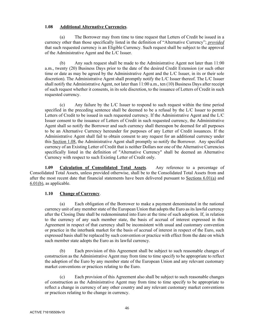 46 ACTIVE 716195509v10 1.08 Additional Alternative Currencies. (a) The Borrower may from time to time request that Letters of Credit be issued in a currency other than those specifically listed in the definition of “Alternative Currency”; provided that such requested currency is an Eligible Currency. Such request shall be subject to the approval of the Administrative Agent and the L/C Issuer. (b) Any such request shall be made to the Administrative Agent not later than 11:00 a.m., twenty (20) Business Days prior to the date of the desired Credit Extension (or such other time or date as may be agreed by the Administrative Agent and the L/C Issuer, in its or their sole discretion). The Administrative Agent shall promptly notify the L/C Issuer thereof. The L/C Issuer shall notify the Administrative Agent, not later than 11:00 a.m., ten (10) Business Days after receipt of such request whether it consents, in its sole discretion, to the issuance of Letters of Credit in such requested currency. (c) Any failure by the L/C Issuer to respond to such request within the time period specified in the preceding sentence shall be deemed to be a refusal by the L/C Issuer to permit Letters of Credit to be issued in such requested currency. If the Administrative Agent and the L/C Issuer consent to the issuance of Letters of Credit in such requested currency, the Administrative Agent shall so notify the Borrower and such currency shall thereupon be deemed for all purposes to be an Alternative Currency hereunder for purposes of any Letter of Credit issuances. If the Administrative Agent shall fail to obtain consent to any request for an additional currency under this Section 1.08, the Administrative Agent shall promptly so notify the Borrower. Any specified currency of an Existing Letter of Credit that is neither Dollars nor one of the Alternative Currencies specifically listed in the definition of "Alternative Currency" shall be deemed an Alternative Currency with respect to such Existing Letter of Credit only. 1.09 Calculation of Consolidated Total Assets. Any reference to a percentage of Consolidated Total Assets, unless provided otherwise, shall be to the Consolidated Total Assets from and after the most recent date that financial statements have been delivered pursuant to Sections 6.01(a) and 6.01(b), as applicable. 1.10 Change of Currency. (a) Each obligation of the Borrower to make a payment denominated in the national currency unit of any member state of the European Union that adopts the Euro as its lawful currency after the Closing Date shall be redenominated into Euro at the time of such adoption. If, in relation to the currency of any such member state, the basis of accrual of interest expressed in this Agreement in respect of that currency shall be inconsistent with usual and customary convention or practice in the interbank market for the basis of accrual of interest in respect of the Euro, such expressed basis shall be replaced by such convention or practice with effect from the date on which such member state adopts the Euro as its lawful currency. (b) Each provision of this Agreement shall be subject to such reasonable changes of construction as the Administrative Agent may from time to time specify to be appropriate to reflect the adoption of the Euro by any member state of the European Union and any relevant customary market conventions or practices relating to the Euro. (c) Each provision of this Agreement also shall be subject to such reasonable changes of construction as the Administrative Agent may from time to time specify to be appropriate to reflect a change in currency of any other country and any relevant customary market conventions or practices relating to the change in currency.