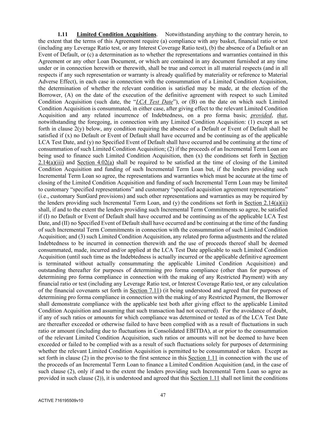 47 ACTIVE 716195509v10 1.11 Limited Condition Acquisitions. Notwithstanding anything to the contrary herein, to the extent that the terms of this Agreement require (a) compliance with any basket, financial ratio or test (including any Leverage Ratio test, or any Interest Coverage Ratio test), (b) the absence of a Default or an Event of Default, or (c) a determination as to whether the representations and warranties contained in this Agreement or any other Loan Document, or which are contained in any document furnished at any time under or in connection herewith or therewith, shall be true and correct in all material respects (and in all respects if any such representation or warranty is already qualified by materiality or reference to Material Adverse Effect), in each case in connection with the consummation of a Limited Condition Acquisition, the determination of whether the relevant condition is satisfied may be made, at the election of the Borrower, (A) on the date of the execution of the definitive agreement with respect to such Limited Condition Acquisition (such date, the “LCA Test Date”), or (B) on the date on which such Limited Condition Acquisition is consummated, in either case, after giving effect to the relevant Limited Condition Acquisition and any related incurrence of Indebtedness, on a pro forma basis; provided, that, notwithstanding the foregoing, in connection with any Limited Condition Acquisition: (1) except as set forth in clause 2(y) below, any condition requiring the absence of a Default or Event of Default shall be satisfied if (x) no Default or Event of Default shall have occurred and be continuing as of the applicable LCA Test Date, and (y) no Specified Event of Default shall have occurred and be continuing at the time of consummation of such Limited Condition Acquisition; (2) if the proceeds of an Incremental Term Loan are being used to finance such Limited Condition Acquisition, then (x) the conditions set forth in Section 2.14(a)(iii) and Section 4.02(a) shall be required to be satisfied at the time of closing of the Limited Condition Acquisition and funding of such Incremental Term Loan but, if the lenders providing such Incremental Term Loan so agree, the representations and warranties which must be accurate at the time of closing of the Limited Condition Acquisition and funding of such Incremental Term Loan may be limited to customary “specified representations” and customary “specified acquisition agreement representations” (i.e., customary SunGard provisions) and such other representations and warranties as may be required by the lenders providing such Incremental Term Loan, and (y) the conditions set forth in Section 2.14(a)(ii) shall, if and to the extent the lenders providing such Incremental Term Commitments so agree, be satisfied if (I) no Default or Event of Default shall have occurred and be continuing as of the applicable LCA Test Date, and (II) no Specified Event of Default shall have occurred and be continuing at the time of the funding of such Incremental Term Commitments in connection with the consummation of such Limited Condition Acquisition; and (3) such Limited Condition Acquisition, any related pro forma adjustments and the related Indebtedness to be incurred in connection therewith and the use of proceeds thereof shall be deemed consummated, made, incurred and/or applied at the LCA Test Date applicable to such Limited Condition Acquisition (until such time as the Indebtedness is actually incurred or the applicable definitive agreement is terminated without actually consummating the applicable Limited Condition Acquisition) and outstanding thereafter for purposes of determining pro forma compliance (other than for purposes of determining pro forma compliance in connection with the making of any Restricted Payment) with any financial ratio or test (including any Leverage Ratio test, or Interest Coverage Ratio test, or any calculation of the financial covenants set forth in Section 7.11) (it being understood and agreed that for purposes of determining pro forma compliance in connection with the making of any Restricted Payment, the Borrower shall demonstrate compliance with the applicable test both after giving effect to the applicable Limited Condition Acquisition and assuming that such transaction had not occurred). For the avoidance of doubt, if any of such ratios or amounts for which compliance was determined or tested as of the LCA Test Date are thereafter exceeded or otherwise failed to have been complied with as a result of fluctuations in such ratio or amount (including due to fluctuations in Consolidated EBITDA), at or prior to the consummation of the relevant Limited Condition Acquisition, such ratios or amounts will not be deemed to have been exceeded or failed to be complied with as a result of such fluctuations solely for purposes of determining whether the relevant Limited Condition Acquisition is permitted to be consummated or taken. Except as set forth in clause (2) in the proviso to the first sentence in this Section 1.11 in connection with the use of the proceeds of an Incremental Term Loan to finance a Limited Condition Acquisition (and, in the case of such clause (2), only if and to the extent the lenders providing such Incremental Term Loan so agree as provided in such clause (2)), it is understood and agreed that this Section 1.11 shall not limit the conditions