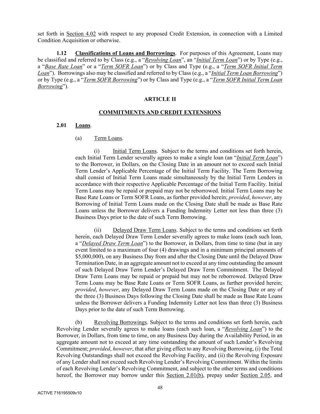 48 ACTIVE 716195509v10 set forth in Section 4.02 with respect to any proposed Credit Extension, in connection with a Limited Condition Acquisition or otherwise. 1.12 Classifications of Loans and Borrowings. For purposes of this Agreement, Loans may be classified and referred to by Class (e.g., a “Revolving Loan”, an “Initial Term Loan”) or by Type (e.g., a “Base Rate Loan” or a “Term SOFR Loan”) or by Class and Type (e.g., a “Term SOFR Initial Term Loan”). Borrowings also may be classified and referred to by Class (e.g., a “Initial Term Loan Borrowing”) or by Type (e.g., a “Term SOFR Borrowing”) or by Class and Type (e.g., a “Term SOFR Initial Term Loan Borrowing”). ARTICLE II COMMITMENTS AND CREDIT EXTENSIONS 2.01 Loans. (a) Term Loans. (i) Initial Term Loans. Subject to the terms and conditions set forth herein, each Initial Term Lender severally agrees to make a single loan (an “Initial Term Loan”) to the Borrower, in Dollars, on the Closing Date in an amount not to exceed such Initial Term Lender’s Applicable Percentage of the Initial Term Facility. The Term Borrowing shall consist of Initial Term Loans made simultaneously by the Initial Term Lenders in accordance with their respective Applicable Percentage of the Initial Term Facility. Initial Term Loans may be repaid or prepaid may not be reborrowed. Initial Term Loans may be Base Rate Loans or Term SOFR Loans, as further provided herein; provided, however, any Borrowing of Initial Term Loans made on the Closing Date shall be made as Base Rate Loans unless the Borrower delivers a Funding Indemnity Letter not less than three (3) Business Days prior to the date of such Term Borrowing. (ii) Delayed Draw Term Loans. Subject to the terms and conditions set forth herein, each Delayed Draw Term Lender severally agrees to make loans (each such loan, a “Delayed Draw Term Loan”) to the Borrower, in Dollars, from time to time (but in any event limited to a maximum of four (4) drawings and in a minimum principal amounts of $5,000,000), on any Business Day from and after the Closing Date until the Delayed Draw Termination Date, in an aggregate amount not to exceed at any time outstanding the amount of such Delayed Draw Term Lender’s Delayed Draw Term Commitment. The Delayed Draw Term Loans may be repaid or prepaid but may not be reborrowed. Delayed Draw Term Loans may be Base Rate Loans or Term SOFR Loans, as further provided herein; provided, however, any Delayed Draw Term Loans made on the Closing Date or any of the three (3) Business Days following the Closing Date shall be made as Base Rate Loans unless the Borrower delivers a Funding Indemnity Letter not less than three (3) Business Days prior to the date of such Term Borrowing. (b) Revolving Borrowings. Subject to the terms and conditions set forth herein, each Revolving Lender severally agrees to make loans (each such loan, a “Revolving Loan”) to the Borrower, in Dollars, from time to time, on any Business Day during the Availability Period, in an aggregate amount not to exceed at any time outstanding the amount of such Lender’s Revolving Commitment; provided, however, that after giving effect to any Revolving Borrowing, (i) the Total Revolving Outstandings shall not exceed the Revolving Facility, and (ii) the Revolving Exposure of any Lender shall not exceed such Revolving Lender’s Revolving Commitment. Within the limits of each Revolving Lender’s Revolving Commitment, and subject to the other terms and conditions hereof, the Borrower may borrow under this Section 2.01(b), prepay under Section 2.05, and