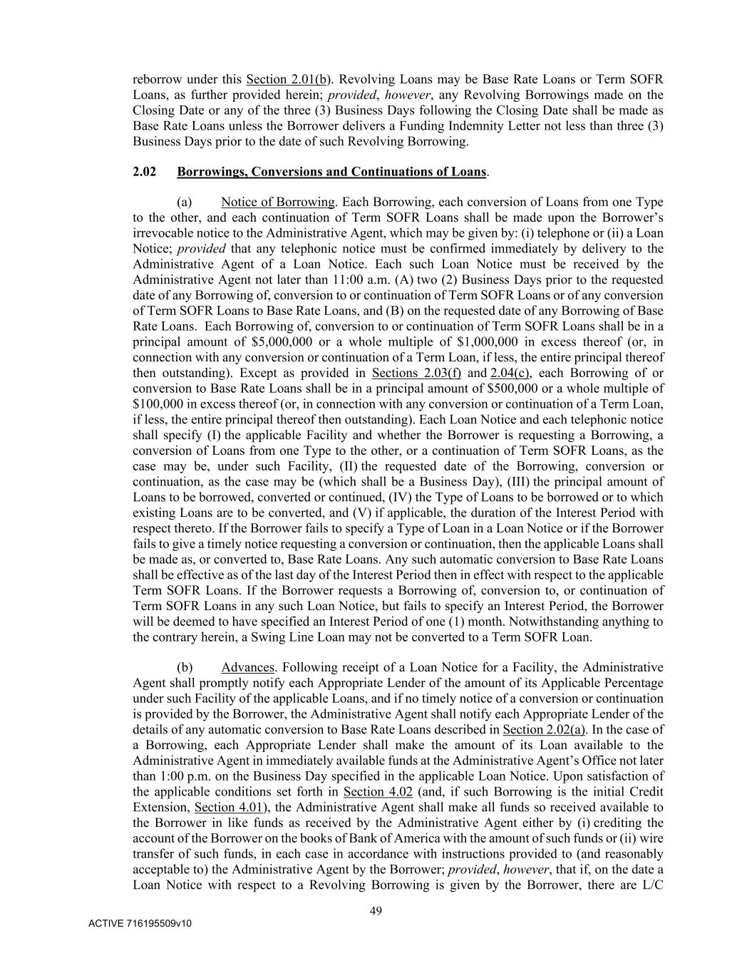 49 ACTIVE 716195509v10 reborrow under this Section 2.01(b). Revolving Loans may be Base Rate Loans or Term SOFR Loans, as further provided herein; provided, however, any Revolving Borrowings made on the Closing Date or any of the three (3) Business Days following the Closing Date shall be made as Base Rate Loans unless the Borrower delivers a Funding Indemnity Letter not less than three (3) Business Days prior to the date of such Revolving Borrowing. 2.02 Borrowings, Conversions and Continuations of Loans. (a) Notice of Borrowing. Each Borrowing, each conversion of Loans from one Type to the other, and each continuation of Term SOFR Loans shall be made upon the Borrower’s irrevocable notice to the Administrative Agent, which may be given by: (i) telephone or (ii) a Loan Notice; provided that any telephonic notice must be confirmed immediately by delivery to the Administrative Agent of a Loan Notice. Each such Loan Notice must be received by the Administrative Agent not later than 11:00 a.m. (A) two (2) Business Days prior to the requested date of any Borrowing of, conversion to or continuation of Term SOFR Loans or of any conversion of Term SOFR Loans to Base Rate Loans, and (B) on the requested date of any Borrowing of Base Rate Loans. Each Borrowing of, conversion to or continuation of Term SOFR Loans shall be in a principal amount of $5,000,000 or a whole multiple of $1,000,000 in excess thereof (or, in connection with any conversion or continuation of a Term Loan, if less, the entire principal thereof then outstanding). Except as provided in Sections 2.03(f) and 2.04(c), each Borrowing of or conversion to Base Rate Loans shall be in a principal amount of $500,000 or a whole multiple of $100,000 in excess thereof (or, in connection with any conversion or continuation of a Term Loan, if less, the entire principal thereof then outstanding). Each Loan Notice and each telephonic notice shall specify (I) the applicable Facility and whether the Borrower is requesting a Borrowing, a conversion of Loans from one Type to the other, or a continuation of Term SOFR Loans, as the case may be, under such Facility, (II) the requested date of the Borrowing, conversion or continuation, as the case may be (which shall be a Business Day), (III) the principal amount of Loans to be borrowed, converted or continued, (IV) the Type of Loans to be borrowed or to which existing Loans are to be converted, and (V) if applicable, the duration of the Interest Period with respect thereto. If the Borrower fails to specify a Type of Loan in a Loan Notice or if the Borrower fails to give a timely notice requesting a conversion or continuation, then the applicable Loans shall be made as, or converted to, Base Rate Loans. Any such automatic conversion to Base Rate Loans shall be effective as of the last day of the Interest Period then in effect with respect to the applicable Term SOFR Loans. If the Borrower requests a Borrowing of, conversion to, or continuation of Term SOFR Loans in any such Loan Notice, but fails to specify an Interest Period, the Borrower will be deemed to have specified an Interest Period of one (1) month. Notwithstanding anything to the contrary herein, a Swing Line Loan may not be converted to a Term SOFR Loan. (b) Advances. Following receipt of a Loan Notice for a Facility, the Administrative Agent shall promptly notify each Appropriate Lender of the amount of its Applicable Percentage under such Facility of the applicable Loans, and if no timely notice of a conversion or continuation is provided by the Borrower, the Administrative Agent shall notify each Appropriate Lender of the details of any automatic conversion to Base Rate Loans described in Section 2.02(a). In the case of a Borrowing, each Appropriate Lender shall make the amount of its Loan available to the Administrative Agent in immediately available funds at the Administrative Agent’s Office not later than 1:00 p.m. on the Business Day specified in the applicable Loan Notice. Upon satisfaction of the applicable conditions set forth in Section 4.02 (and, if such Borrowing is the initial Credit Extension, Section 4.01), the Administrative Agent shall make all funds so received available to the Borrower in like funds as received by the Administrative Agent either by (i) crediting the account of the Borrower on the books of Bank of America with the amount of such funds or (ii) wire transfer of such funds, in each case in accordance with instructions provided to (and reasonably acceptable to) the Administrative Agent by the Borrower; provided, however, that if, on the date a Loan Notice with respect to a Revolving Borrowing is given by the Borrower, there are L/C