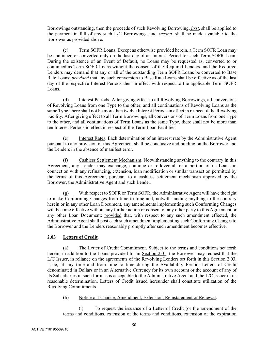 50 ACTIVE 716195509v10 Borrowings outstanding, then the proceeds of such Revolving Borrowing, first, shall be applied to the payment in full of any such L/C Borrowings, and second, shall be made available to the Borrower as provided above. (c) Term SOFR Loans. Except as otherwise provided herein, a Term SOFR Loan may be continued or converted only on the last day of an Interest Period for such Term SOFR Loan. During the existence of an Event of Default, no Loans may be requested as, converted to or continued as Term SOFR Loans without the consent of the Required Lenders, and the Required Lenders may demand that any or all of the outstanding Term SOFR Loans be converted to Base Rate Loans; provided that any such conversion to Base Rate Loans shall be effective as of the last day of the respective Interest Periods then in effect with respect to the applicable Term SOFR Loans. (d) Interest Periods. After giving effect to all Revolving Borrowings, all conversions of Revolving Loans from one Type to the other, and all continuations of Revolving Loans as the same Type, there shall not be more than twelve Interest Periods in effect in respect of the Revolving Facility. After giving effect to all Term Borrowings, all conversions of Term Loans from one Type to the other, and all continuations of Term Loans as the same Type, there shall not be more than ten Interest Periods in effect in respect of the Term Loan Facilities. (e) Interest Rates. Each determination of an interest rate by the Administrative Agent pursuant to any provision of this Agreement shall be conclusive and binding on the Borrower and the Lenders in the absence of manifest error. (f) Cashless Settlement Mechanism. Notwithstanding anything to the contrary in this Agreement, any Lender may exchange, continue or rollover all or a portion of its Loans in connection with any refinancing, extension, loan modification or similar transaction permitted by the terms of this Agreement, pursuant to a cashless settlement mechanism approved by the Borrower, the Administrative Agent and such Lender. (g) With respect to SOFR or Term SOFR, the Administrative Agent will have the right to make Conforming Changes from time to time and, notwithstanding anything to the contrary herein or in any other Loan Document, any amendments implementing such Conforming Changes will become effective without any further action or consent of any other party to this Agreement or any other Loan Document; provided that, with respect to any such amendment effected, the Administrative Agent shall post each such amendment implementing such Conforming Changes to the Borrower and the Lenders reasonably promptly after such amendment becomes effective. 2.03 Letters of Credit. (a) The Letter of Credit Commitment. Subject to the terms and conditions set forth herein, in addition to the Loans provided for in Section 2.01, the Borrower may request that the L/C Issuer, in reliance on the agreements of the Revolving Lenders set forth in this Section 2.03, issue, at any time and from time to time during the Availability Period, Letters of Credit denominated in Dollars or in an Alternative Currency for its own account or the account of any of its Subsidiaries in such form as is acceptable to the Administrative Agent and the L/C Issuer in its reasonable determination. Letters of Credit issued hereunder shall constitute utilization of the Revolving Commitments. (b) Notice of Issuance, Amendment, Extension, Reinstatement or Renewal. (i) To request the issuance of a Letter of Credit (or the amendment of the terms and conditions, extension of the terms and conditions, extension of the expiration