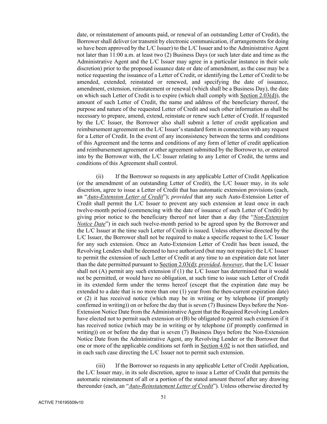 51 ACTIVE 716195509v10 date, or reinstatement of amounts paid, or renewal of an outstanding Letter of Credit), the Borrower shall deliver (or transmit by electronic communication, if arrangements for doing so have been approved by the L/C Issuer) to the L/C Issuer and to the Administrative Agent not later than 11:00 a.m. at least two (2) Business Days (or such later date and time as the Administrative Agent and the L/C Issuer may agree in a particular instance in their sole discretion) prior to the proposed issuance date or date of amendment, as the case may be a notice requesting the issuance of a Letter of Credit, or identifying the Letter of Credit to be amended, extended, reinstated or renewed, and specifying the date of issuance, amendment, extension, reinstatement or renewal (which shall be a Business Day), the date on which such Letter of Credit is to expire (which shall comply with Section 2.03(d)), the amount of such Letter of Credit, the name and address of the beneficiary thereof, the purpose and nature of the requested Letter of Credit and such other information as shall be necessary to prepare, amend, extend, reinstate or renew such Letter of Credit. If requested by the L/C Issuer, the Borrower also shall submit a letter of credit application and reimbursement agreement on the L/C Issuer’s standard form in connection with any request for a Letter of Credit. In the event of any inconsistency between the terms and conditions of this Agreement and the terms and conditions of any form of letter of credit application and reimbursement agreement or other agreement submitted by the Borrower to, or entered into by the Borrower with, the L/C Issuer relating to any Letter of Credit, the terms and conditions of this Agreement shall control. (ii) If the Borrower so requests in any applicable Letter of Credit Application (or the amendment of an outstanding Letter of Credit), the L/C Issuer may, in its sole discretion, agree to issue a Letter of Credit that has automatic extension provisions (each, an “Auto-Extension Letter of Credit”); provided that any such Auto-Extension Letter of Credit shall permit the L/C Issuer to prevent any such extension at least once in each twelve-month period (commencing with the date of issuance of such Letter of Credit) by giving prior notice to the beneficiary thereof not later than a day (the “Non-Extension Notice Date”) in each such twelve-month period to be agreed upon by the Borrower and the L/C Issuer at the time such Letter of Credit is issued. Unless otherwise directed by the L/C Issuer, the Borrower shall not be required to make a specific request to the L/C Issuer for any such extension. Once an Auto-Extension Letter of Credit has been issued, the Revolving Lenders shall be deemed to have authorized (but may not require) the L/C Issuer to permit the extension of such Letter of Credit at any time to an expiration date not later than the date permitted pursuant to Section 2.03(d); provided, however, that the L/C Issuer shall not (A) permit any such extension if (1) the L/C Issuer has determined that it would not be permitted, or would have no obligation, at such time to issue such Letter of Credit in its extended form under the terms hereof (except that the expiration date may be extended to a date that is no more than one (1) year from the then-current expiration date) or (2) it has received notice (which may be in writing or by telephone (if promptly confirmed in writing)) on or before the day that is seven (7) Business Days before the Non- Extension Notice Date from the Administrative Agent that the Required Revolving Lenders have elected not to permit such extension or (B) be obligated to permit such extension if it has received notice (which may be in writing or by telephone (if promptly confirmed in writing)) on or before the day that is seven (7) Business Days before the Non-Extension Notice Date from the Administrative Agent, any Revolving Lender or the Borrower that one or more of the applicable conditions set forth in Section 4.02 is not then satisfied, and in each such case directing the L/C Issuer not to permit such extension. (iii) If the Borrower so requests in any applicable Letter of Credit Application, the L/C Issuer may, in its sole discretion, agree to issue a Letter of Credit that permits the automatic reinstatement of all or a portion of the stated amount thereof after any drawing thereunder (each, an “Auto-Reinstatement Letter of Credit”). Unless otherwise directed by