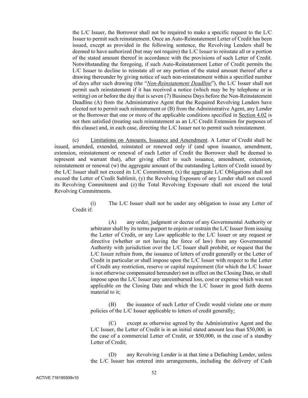 52 ACTIVE 716195509v10 the L/C Issuer, the Borrower shall not be required to make a specific request to the L/C Issuer to permit such reinstatement. Once an Auto-Reinstatement Letter of Credit has been issued, except as provided in the following sentence, the Revolving Lenders shall be deemed to have authorized (but may not require) the L/C Issuer to reinstate all or a portion of the stated amount thereof in accordance with the provisions of such Letter of Credit. Notwithstanding the foregoing, if such Auto-Reinstatement Letter of Credit permits the L/C Issuer to decline to reinstate all or any portion of the stated amount thereof after a drawing thereunder by giving notice of such non-reinstatement within a specified number of days after such drawing (the “Non-Reinstatement Deadline”), the L/C Issuer shall not permit such reinstatement if it has received a notice (which may be by telephone or in writing) on or before the day that is seven (7) Business Days before the Non-Reinstatement Deadline (A) from the Administrative Agent that the Required Revolving Lenders have elected not to permit such reinstatement or (B) from the Administrative Agent, any Lender or the Borrower that one or more of the applicable conditions specified in Section 4.02 is not then satisfied (treating such reinstatement as an L/C Credit Extension for purposes of this clause) and, in each case, directing the L/C Issuer not to permit such reinstatement. (c) Limitations on Amounts, Issuance and Amendment. A Letter of Credit shall be issued, amended, extended, reinstated or renewed only if (and upon issuance, amendment, extension, reinstatement or renewal of each Letter of Credit the Borrower shall be deemed to represent and warrant that), after giving effect to such issuance, amendment, extension, reinstatement or renewal (w) the aggregate amount of the outstanding Letters of Credit issued by the L/C Issuer shall not exceed its L/C Commitment, (x) the aggregate L/C Obligations shall not exceed the Letter of Credit Sublimit, (y) the Revolving Exposure of any Lender shall not exceed its Revolving Commitment and (z) the Total Revolving Exposure shall not exceed the total Revolving Commitments. (i) The L/C Issuer shall not be under any obligation to issue any Letter of Credit if: (A) any order, judgment or decree of any Governmental Authority or arbitrator shall by its terms purport to enjoin or restrain the L/C Issuer from issuing the Letter of Credit, or any Law applicable to the L/C Issuer or any request or directive (whether or not having the force of law) from any Governmental Authority with jurisdiction over the L/C Issuer shall prohibit, or request that the L/C Issuer refrain from, the issuance of letters of credit generally or the Letter of Credit in particular or shall impose upon the L/C Issuer with respect to the Letter of Credit any restriction, reserve or capital requirement (for which the L/C Issuer is not otherwise compensated hereunder) not in effect on the Closing Date, or shall impose upon the L/C Issuer any unreimbursed loss, cost or expense which was not applicable on the Closing Date and which the L/C Issuer in good faith deems material to it; (B) the issuance of such Letter of Credit would violate one or more policies of the L/C Issuer applicable to letters of credit generally; (C) except as otherwise agreed by the Administrative Agent and the L/C Issuer, the Letter of Credit is in an initial stated amount less than $50,000, in the case of a commercial Letter of Credit, or $50,000, in the case of a standby Letter of Credit; (D) any Revolving Lender is at that time a Defaulting Lender, unless the L/C Issuer has entered into arrangements, including the delivery of Cash