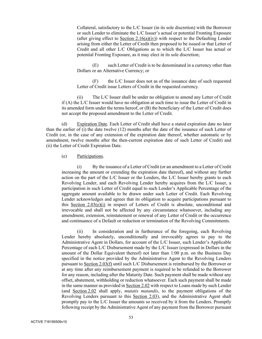 53 ACTIVE 716195509v10 Collateral, satisfactory to the L/C Issuer (in its sole discretion) with the Borrower or such Lender to eliminate the L/C Issuer’s actual or potential Fronting Exposure (after giving effect to Section 2.16(a)(iv)) with respect to the Defaulting Lender arising from either the Letter of Credit then proposed to be issued or that Letter of Credit and all other L/C Obligations as to which the L/C Issuer has actual or potential Fronting Exposure, as it may elect in its sole discretion; (E) such Letter of Credit is to be denominated in a currency other than Dollars or an Alternative Currency; or (F) the L/C Issuer does not as of the issuance date of such requested Letter of Credit issue Letters of Credit in the requested currency. (ii) The L/C Issuer shall be under no obligation to amend any Letter of Credit if (A) the L/C Issuer would have no obligation at such time to issue the Letter of Credit in its amended form under the terms hereof, or (B) the beneficiary of the Letter of Credit does not accept the proposed amendment to the Letter of Credit. (d) Expiration Date. Each Letter of Credit shall have a stated expiration date no later than the earlier of (i) the date twelve (12) months after the date of the issuance of such Letter of Credit (or, in the case of any extension of the expiration date thereof, whether automatic or by amendment, twelve months after the then-current expiration date of such Letter of Credit) and (ii) the Letter of Credit Expiration Date. (e) Participations. (i) By the issuance of a Letter of Credit (or an amendment to a Letter of Credit increasing the amount or extending the expiration date thereof), and without any further action on the part of the L/C Issuer or the Lenders, the L/C Issuer hereby grants to each Revolving Lender, and each Revolving Lender hereby acquires from the L/C Issuer, a participation in such Letter of Credit equal to such Lender’s Applicable Percentage of the aggregate amount available to be drawn under such Letter of Credit. Each Revolving Lender acknowledges and agrees that its obligation to acquire participations pursuant to this Section 2.03(e)(i) in respect of Letters of Credit is absolute, unconditional and irrevocable and shall not be affected by any circumstance whatsoever, including any amendment, extension, reinstatement or renewal of any Letter of Credit or the occurrence and continuance of a Default or reduction or termination of the Revolving Commitments. (ii) In consideration and in furtherance of the foregoing, each Revolving Lender hereby absolutely, unconditionally and irrevocably agrees to pay to the Administrative Agent in Dollars, for account of the L/C Issuer, such Lender’s Applicable Percentage of each L/C Disbursement made by the L/C Issuer (expressed in Dollars in the amount of the Dollar Equivalent thereof) not later than 1:00 p.m. on the Business Day specified in the notice provided by the Administrative Agent to the Revolving Lenders pursuant to Section 2.03(f) until such L/C Disbursement is reimbursed by the Borrower or at any time after any reimbursement payment is required to be refunded to the Borrower for any reason, including after the Maturity Date. Such payment shall be made without any offset, abatement, withholding or reduction whatsoever. Each such payment shall be made in the same manner as provided in Section 2.02 with respect to Loans made by such Lender (and Section 2.02 shall apply, mutatis mutandis, to the payment obligations of the Revolving Lenders pursuant to this Section 2.03), and the Administrative Agent shall promptly pay to the L/C Issuer the amounts so received by it from the Lenders. Promptly following receipt by the Administrative Agent of any payment from the Borrower pursuant