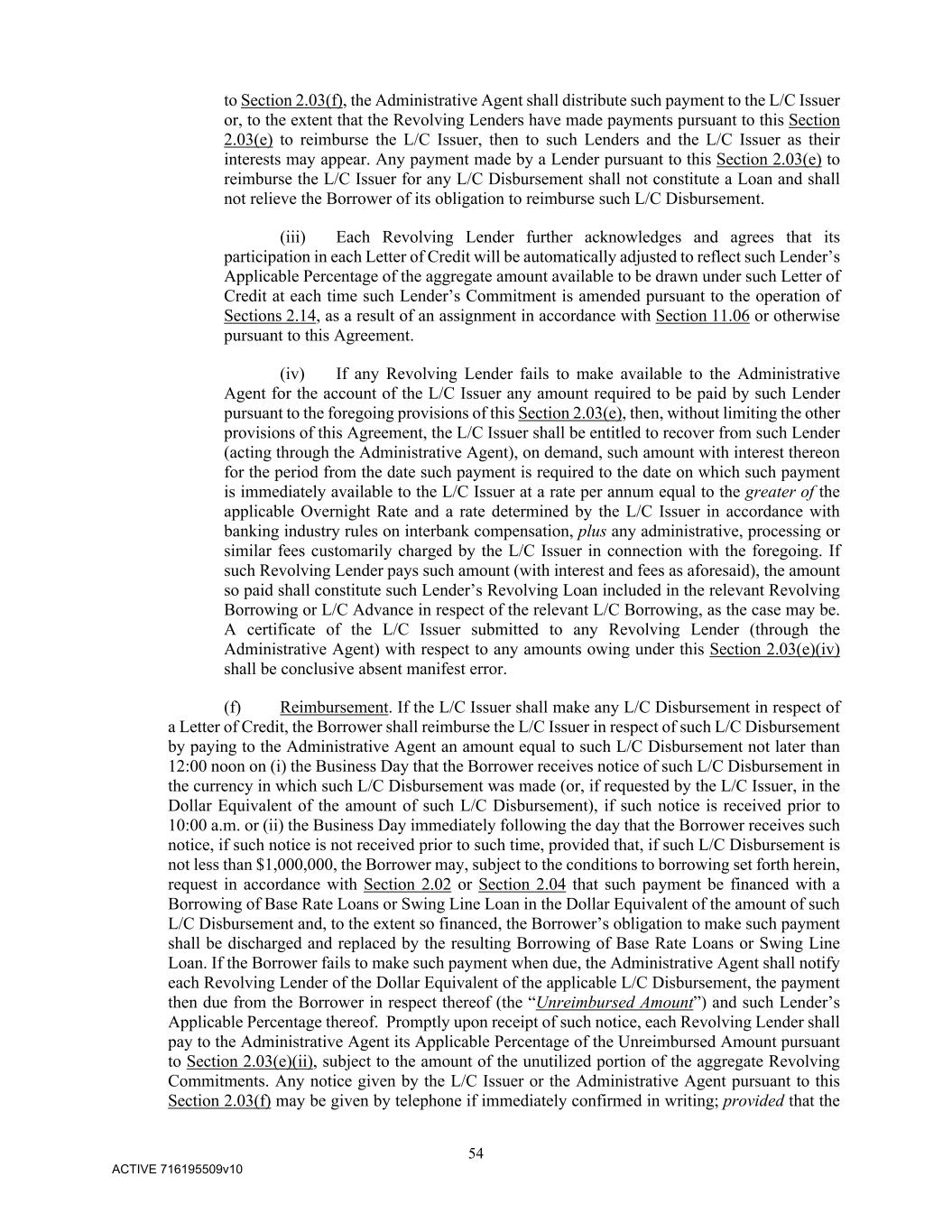 54 ACTIVE 716195509v10 to Section 2.03(f), the Administrative Agent shall distribute such payment to the L/C Issuer or, to the extent that the Revolving Lenders have made payments pursuant to this Section 2.03(e) to reimburse the L/C Issuer, then to such Lenders and the L/C Issuer as their interests may appear. Any payment made by a Lender pursuant to this Section 2.03(e) to reimburse the L/C Issuer for any L/C Disbursement shall not constitute a Loan and shall not relieve the Borrower of its obligation to reimburse such L/C Disbursement. (iii) Each Revolving Lender further acknowledges and agrees that its participation in each Letter of Credit will be automatically adjusted to reflect such Lender’s Applicable Percentage of the aggregate amount available to be drawn under such Letter of Credit at each time such Lender’s Commitment is amended pursuant to the operation of Sections 2.14, as a result of an assignment in accordance with Section 11.06 or otherwise pursuant to this Agreement. (iv) If any Revolving Lender fails to make available to the Administrative Agent for the account of the L/C Issuer any amount required to be paid by such Lender pursuant to the foregoing provisions of this Section 2.03(e), then, without limiting the other provisions of this Agreement, the L/C Issuer shall be entitled to recover from such Lender (acting through the Administrative Agent), on demand, such amount with interest thereon for the period from the date such payment is required to the date on which such payment is immediately available to the L/C Issuer at a rate per annum equal to the greater of the applicable Overnight Rate and a rate determined by the L/C Issuer in accordance with banking industry rules on interbank compensation, plus any administrative, processing or similar fees customarily charged by the L/C Issuer in connection with the foregoing. If such Revolving Lender pays such amount (with interest and fees as aforesaid), the amount so paid shall constitute such Lender’s Revolving Loan included in the relevant Revolving Borrowing or L/C Advance in respect of the relevant L/C Borrowing, as the case may be. A certificate of the L/C Issuer submitted to any Revolving Lender (through the Administrative Agent) with respect to any amounts owing under this Section 2.03(e)(iv) shall be conclusive absent manifest error. (f) Reimbursement. If the L/C Issuer shall make any L/C Disbursement in respect of a Letter of Credit, the Borrower shall reimburse the L/C Issuer in respect of such L/C Disbursement by paying to the Administrative Agent an amount equal to such L/C Disbursement not later than 12:00 noon on (i) the Business Day that the Borrower receives notice of such L/C Disbursement in the currency in which such L/C Disbursement was made (or, if requested by the L/C Issuer, in the Dollar Equivalent of the amount of such L/C Disbursement), if such notice is received prior to 10:00 a.m. or (ii) the Business Day immediately following the day that the Borrower receives such notice, if such notice is not received prior to such time, provided that, if such L/C Disbursement is not less than $1,000,000, the Borrower may, subject to the conditions to borrowing set forth herein, request in accordance with Section 2.02 or Section 2.04 that such payment be financed with a Borrowing of Base Rate Loans or Swing Line Loan in the Dollar Equivalent of the amount of such L/C Disbursement and, to the extent so financed, the Borrower’s obligation to make such payment shall be discharged and replaced by the resulting Borrowing of Base Rate Loans or Swing Line Loan. If the Borrower fails to make such payment when due, the Administrative Agent shall notify each Revolving Lender of the Dollar Equivalent of the applicable L/C Disbursement, the payment then due from the Borrower in respect thereof (the “Unreimbursed Amount”) and such Lender’s Applicable Percentage thereof. Promptly upon receipt of such notice, each Revolving Lender shall pay to the Administrative Agent its Applicable Percentage of the Unreimbursed Amount pursuant to Section 2.03(e)(ii), subject to the amount of the unutilized portion of the aggregate Revolving Commitments. Any notice given by the L/C Issuer or the Administrative Agent pursuant to this Section 2.03(f) may be given by telephone if immediately confirmed in writing; provided that the