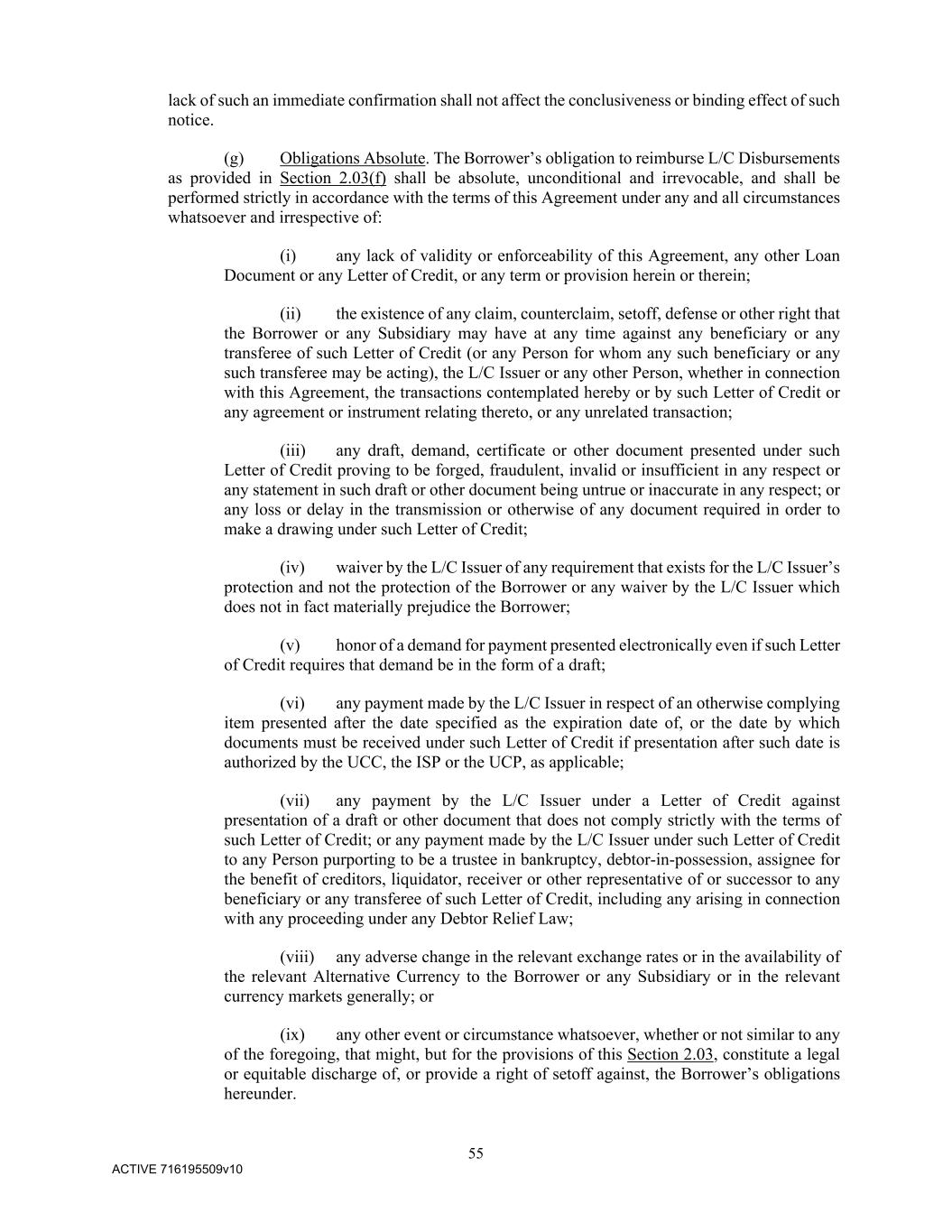 55 ACTIVE 716195509v10 lack of such an immediate confirmation shall not affect the conclusiveness or binding effect of such notice. (g) Obligations Absolute. The Borrower’s obligation to reimburse L/C Disbursements as provided in Section 2.03(f) shall be absolute, unconditional and irrevocable, and shall be performed strictly in accordance with the terms of this Agreement under any and all circumstances whatsoever and irrespective of: (i) any lack of validity or enforceability of this Agreement, any other Loan Document or any Letter of Credit, or any term or provision herein or therein; (ii) the existence of any claim, counterclaim, setoff, defense or other right that the Borrower or any Subsidiary may have at any time against any beneficiary or any transferee of such Letter of Credit (or any Person for whom any such beneficiary or any such transferee may be acting), the L/C Issuer or any other Person, whether in connection with this Agreement, the transactions contemplated hereby or by such Letter of Credit or any agreement or instrument relating thereto, or any unrelated transaction; (iii) any draft, demand, certificate or other document presented under such Letter of Credit proving to be forged, fraudulent, invalid or insufficient in any respect or any statement in such draft or other document being untrue or inaccurate in any respect; or any loss or delay in the transmission or otherwise of any document required in order to make a drawing under such Letter of Credit; (iv) waiver by the L/C Issuer of any requirement that exists for the L/C Issuer’s protection and not the protection of the Borrower or any waiver by the L/C Issuer which does not in fact materially prejudice the Borrower; (v) honor of a demand for payment presented electronically even if such Letter of Credit requires that demand be in the form of a draft; (vi) any payment made by the L/C Issuer in respect of an otherwise complying item presented after the date specified as the expiration date of, or the date by which documents must be received under such Letter of Credit if presentation after such date is authorized by the UCC, the ISP or the UCP, as applicable; (vii) any payment by the L/C Issuer under a Letter of Credit against presentation of a draft or other document that does not comply strictly with the terms of such Letter of Credit; or any payment made by the L/C Issuer under such Letter of Credit to any Person purporting to be a trustee in bankruptcy, debtor-in-possession, assignee for the benefit of creditors, liquidator, receiver or other representative of or successor to any beneficiary or any transferee of such Letter of Credit, including any arising in connection with any proceeding under any Debtor Relief Law; (viii) any adverse change in the relevant exchange rates or in the availability of the relevant Alternative Currency to the Borrower or any Subsidiary or in the relevant currency markets generally; or (ix) any other event or circumstance whatsoever, whether or not similar to any of the foregoing, that might, but for the provisions of this Section 2.03, constitute a legal or equitable discharge of, or provide a right of setoff against, the Borrower’s obligations hereunder.