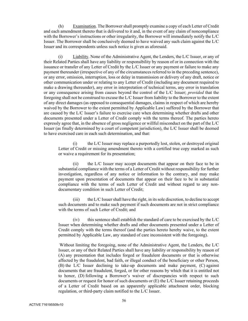 56 ACTIVE 716195509v10 (h) Examination. The Borrower shall promptly examine a copy of each Letter of Credit and each amendment thereto that is delivered to it and, in the event of any claim of noncompliance with the Borrower’s instructions or other irregularity, the Borrower will immediately notify the L/C Issuer. The Borrower shall be conclusively deemed to have waived any such claim against the L/C Issuer and its correspondents unless such notice is given as aforesaid. (i) Liability. None of the Administrative Agent, the Lenders, the L/C Issuer, or any of their Related Parties shall have any liability or responsibility by reason of or in connection with the issuance or transfer of any Letter of Credit by the L/C Issuer or any payment or failure to make any payment thereunder (irrespective of any of the circumstances referred to in the preceding sentence), or any error, omission, interruption, loss or delay in transmission or delivery of any draft, notice or other communication under or relating to any Letter of Credit (including any document required to make a drawing thereunder), any error in interpretation of technical terms, any error in translation or any consequence arising from causes beyond the control of the L/C Issuer; provided that the foregoing shall not be construed to excuse the L/C Issuer from liability to the Borrower to the extent of any direct damages (as opposed to consequential damages, claims in respect of which are hereby waived by the Borrower to the extent permitted by Applicable Law) suffered by the Borrower that are caused by the L/C Issuer’s failure to exercise care when determining whether drafts and other documents presented under a Letter of Credit comply with the terms thereof. The parties hereto expressly agree that, in the absence of gross negligence or willful misconduct on the part of the L/C Issuer (as finally determined by a court of competent jurisdiction), the L/C Issuer shall be deemed to have exercised care in each such determination, and that: (i) the L/C Issuer may replace a purportedly lost, stolen, or destroyed original Letter of Credit or missing amendment thereto with a certified true copy marked as such or waive a requirement for its presentation; (ii) the L/C Issuer may accept documents that appear on their face to be in substantial compliance with the terms of a Letter of Credit without responsibility for further investigation, regardless of any notice or information to the contrary, and may make payment upon presentation of documents that appear on their face to be in substantial compliance with the terms of such Letter of Credit and without regard to any non- documentary condition in such Letter of Credit; (iii) the L/C Issuer shall have the right, in its sole discretion, to decline to accept such documents and to make such payment if such documents are not in strict compliance with the terms of such Letter of Credit; and (iv) this sentence shall establish the standard of care to be exercised by the L/C Issuer when determining whether drafts and other documents presented under a Letter of Credit comply with the terms thereof (and the parties hereto hereby waive, to the extent permitted by Applicable Law, any standard of care inconsistent with the foregoing). Without limiting the foregoing, none of the Administrative Agent, the Lenders, the L/C Issuer, or any of their Related Parties shall have any liability or responsibility by reason of (A) any presentation that includes forged or fraudulent documents or that is otherwise affected by the fraudulent, bad faith, or illegal conduct of the beneficiary or other Person, (B) the L/C Issuer declining to take-up documents and make payment, (C) against documents that are fraudulent, forged, or for other reasons by which that it is entitled not to honor, (D) following a Borrower’s waiver of discrepancies with respect to such documents or request for honor of such documents or (E) the L/C Issuer retaining proceeds of a Letter of Credit based on an apparently applicable attachment order, blocking regulation, or third-party claim notified to the L/C Issuer.