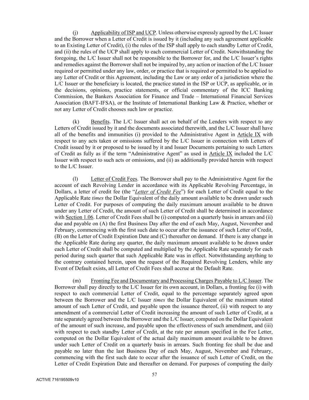 57 ACTIVE 716195509v10 (j) Applicability of ISP and UCP. Unless otherwise expressly agreed by the L/C Issuer and the Borrower when a Letter of Credit is issued by it (including any such agreement applicable to an Existing Letter of Credit), (i) the rules of the ISP shall apply to each standby Letter of Credit, and (ii) the rules of the UCP shall apply to each commercial Letter of Credit. Notwithstanding the foregoing, the L/C Issuer shall not be responsible to the Borrower for, and the L/C Issuer’s rights and remedies against the Borrower shall not be impaired by, any action or inaction of the L/C Issuer required or permitted under any law, order, or practice that is required or permitted to be applied to any Letter of Credit or this Agreement, including the Law or any order of a jurisdiction where the L/C Issuer or the beneficiary is located, the practice stated in the ISP or UCP, as applicable, or in the decisions, opinions, practice statements, or official commentary of the ICC Banking Commission, the Bankers Association for Finance and Trade – International Financial Services Association (BAFT-IFSA), or the Institute of International Banking Law & Practice, whether or not any Letter of Credit chooses such law or practice. (k) Benefits. The L/C Issuer shall act on behalf of the Lenders with respect to any Letters of Credit issued by it and the documents associated therewith, and the L/C Issuer shall have all of the benefits and immunities (i) provided to the Administrative Agent in Article IX with respect to any acts taken or omissions suffered by the L/C Issuer in connection with Letters of Credit issued by it or proposed to be issued by it and Issuer Documents pertaining to such Letters of Credit as fully as if the term “Administrative Agent” as used in Article IX included the L/C Issuer with respect to such acts or omissions, and (ii) as additionally provided herein with respect to the L/C Issuer. (l) Letter of Credit Fees. The Borrower shall pay to the Administrative Agent for the account of each Revolving Lender in accordance with its Applicable Revolving Percentage, in Dollars, a letter of credit fee (the “Letter of Credit Fee”) for each Letter of Credit equal to the Applicable Rate times the Dollar Equivalent of the daily amount available to be drawn under such Letter of Credit. For purposes of computing the daily maximum amount available to be drawn under any Letter of Credit, the amount of such Letter of Credit shall be determined in accordance with Section 1.06. Letter of Credit Fees shall be (i) computed on a quarterly basis in arrears and (ii) due and payable on (A) the first Business Day after the end of each May, August, November and February, commencing with the first such date to occur after the issuance of such Letter of Credit, (B) on the Letter of Credit Expiration Date and (C) thereafter on demand. If there is any change in the Applicable Rate during any quarter, the daily maximum amount available to be drawn under each Letter of Credit shall be computed and multiplied by the Applicable Rate separately for each period during such quarter that such Applicable Rate was in effect. Notwithstanding anything to the contrary contained herein, upon the request of the Required Revolving Lenders, while any Event of Default exists, all Letter of Credit Fees shall accrue at the Default Rate. (m) Fronting Fee and Documentary and Processing Charges Payable to L/C Issuer. The Borrower shall pay directly to the L/C Issuer for its own account, in Dollars, a fronting fee (i) with respect to each commercial Letter of Credit, equal to the percentage separately agreed upon between the Borrower and the L/C Issuer times the Dollar Equivalent of the maximum stated amount of such Letter of Credit, and payable upon the issuance thereof, (ii) with respect to any amendment of a commercial Letter of Credit increasing the amount of such Letter of Credit, at a rate separately agreed between the Borrower and the L/C Issuer, computed on the Dollar Equivalent of the amount of such increase, and payable upon the effectiveness of such amendment, and (iii) with respect to each standby Letter of Credit, at the rate per annum specified in the Fee Letter, computed on the Dollar Equivalent of the actual daily maximum amount available to be drawn under such Letter of Credit on a quarterly basis in arrears. Such fronting fee shall be due and payable no later than the last Business Day of each May, August, November and February, commencing with the first such date to occur after the issuance of such Letter of Credit, on the Letter of Credit Expiration Date and thereafter on demand. For purposes of computing the daily