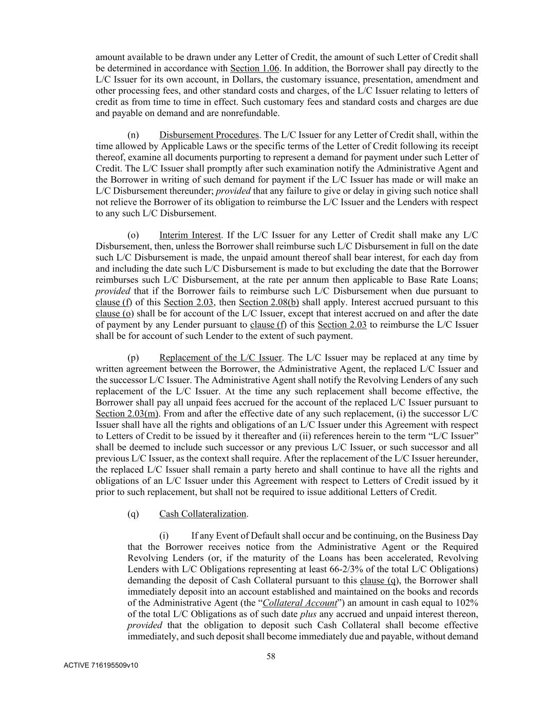 58 ACTIVE 716195509v10 amount available to be drawn under any Letter of Credit, the amount of such Letter of Credit shall be determined in accordance with Section 1.06. In addition, the Borrower shall pay directly to the L/C Issuer for its own account, in Dollars, the customary issuance, presentation, amendment and other processing fees, and other standard costs and charges, of the L/C Issuer relating to letters of credit as from time to time in effect. Such customary fees and standard costs and charges are due and payable on demand and are nonrefundable. (n) Disbursement Procedures. The L/C Issuer for any Letter of Credit shall, within the time allowed by Applicable Laws or the specific terms of the Letter of Credit following its receipt thereof, examine all documents purporting to represent a demand for payment under such Letter of Credit. The L/C Issuer shall promptly after such examination notify the Administrative Agent and the Borrower in writing of such demand for payment if the L/C Issuer has made or will make an L/C Disbursement thereunder; provided that any failure to give or delay in giving such notice shall not relieve the Borrower of its obligation to reimburse the L/C Issuer and the Lenders with respect to any such L/C Disbursement. (o) Interim Interest. If the L/C Issuer for any Letter of Credit shall make any L/C Disbursement, then, unless the Borrower shall reimburse such L/C Disbursement in full on the date such L/C Disbursement is made, the unpaid amount thereof shall bear interest, for each day from and including the date such L/C Disbursement is made to but excluding the date that the Borrower reimburses such L/C Disbursement, at the rate per annum then applicable to Base Rate Loans; provided that if the Borrower fails to reimburse such L/C Disbursement when due pursuant to clause (f) of this Section 2.03, then Section 2.08(b) shall apply. Interest accrued pursuant to this clause (o) shall be for account of the L/C Issuer, except that interest accrued on and after the date of payment by any Lender pursuant to clause (f) of this Section 2.03 to reimburse the L/C Issuer shall be for account of such Lender to the extent of such payment. (p) Replacement of the L/C Issuer. The L/C Issuer may be replaced at any time by written agreement between the Borrower, the Administrative Agent, the replaced L/C Issuer and the successor L/C Issuer. The Administrative Agent shall notify the Revolving Lenders of any such replacement of the L/C Issuer. At the time any such replacement shall become effective, the Borrower shall pay all unpaid fees accrued for the account of the replaced L/C Issuer pursuant to Section 2.03(m). From and after the effective date of any such replacement, (i) the successor L/C Issuer shall have all the rights and obligations of an L/C Issuer under this Agreement with respect to Letters of Credit to be issued by it thereafter and (ii) references herein to the term “L/C Issuer” shall be deemed to include such successor or any previous L/C Issuer, or such successor and all previous L/C Issuer, as the context shall require. After the replacement of the L/C Issuer hereunder, the replaced L/C Issuer shall remain a party hereto and shall continue to have all the rights and obligations of an L/C Issuer under this Agreement with respect to Letters of Credit issued by it prior to such replacement, but shall not be required to issue additional Letters of Credit. (q) Cash Collateralization. (i) If any Event of Default shall occur and be continuing, on the Business Day that the Borrower receives notice from the Administrative Agent or the Required Revolving Lenders (or, if the maturity of the Loans has been accelerated, Revolving Lenders with L/C Obligations representing at least 66-2/3% of the total L/C Obligations) demanding the deposit of Cash Collateral pursuant to this clause (q), the Borrower shall immediately deposit into an account established and maintained on the books and records of the Administrative Agent (the “Collateral Account”) an amount in cash equal to 102% of the total L/C Obligations as of such date plus any accrued and unpaid interest thereon, provided that the obligation to deposit such Cash Collateral shall become effective immediately, and such deposit shall become immediately due and payable, without demand