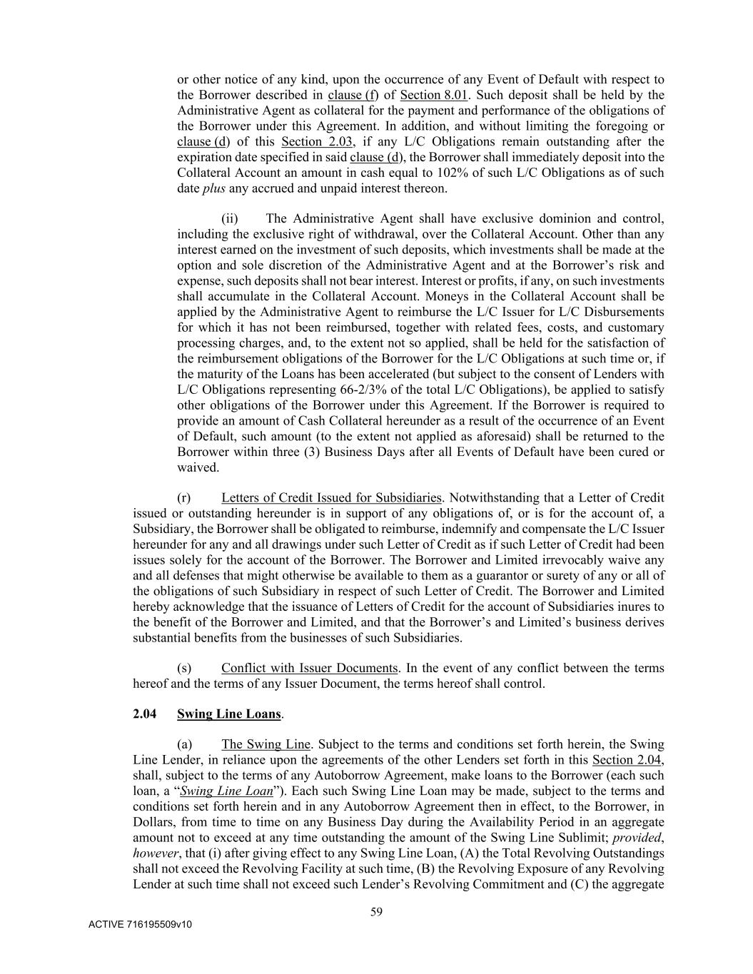 59 ACTIVE 716195509v10 or other notice of any kind, upon the occurrence of any Event of Default with respect to the Borrower described in clause (f) of Section 8.01. Such deposit shall be held by the Administrative Agent as collateral for the payment and performance of the obligations of the Borrower under this Agreement. In addition, and without limiting the foregoing or clause (d) of this Section 2.03, if any L/C Obligations remain outstanding after the expiration date specified in said clause (d), the Borrower shall immediately deposit into the Collateral Account an amount in cash equal to 102% of such L/C Obligations as of such date plus any accrued and unpaid interest thereon. (ii) The Administrative Agent shall have exclusive dominion and control, including the exclusive right of withdrawal, over the Collateral Account. Other than any interest earned on the investment of such deposits, which investments shall be made at the option and sole discretion of the Administrative Agent and at the Borrower’s risk and expense, such deposits shall not bear interest. Interest or profits, if any, on such investments shall accumulate in the Collateral Account. Moneys in the Collateral Account shall be applied by the Administrative Agent to reimburse the L/C Issuer for L/C Disbursements for which it has not been reimbursed, together with related fees, costs, and customary processing charges, and, to the extent not so applied, shall be held for the satisfaction of the reimbursement obligations of the Borrower for the L/C Obligations at such time or, if the maturity of the Loans has been accelerated (but subject to the consent of Lenders with L/C Obligations representing 66-2/3% of the total L/C Obligations), be applied to satisfy other obligations of the Borrower under this Agreement. If the Borrower is required to provide an amount of Cash Collateral hereunder as a result of the occurrence of an Event of Default, such amount (to the extent not applied as aforesaid) shall be returned to the Borrower within three (3) Business Days after all Events of Default have been cured or waived. (r) Letters of Credit Issued for Subsidiaries. Notwithstanding that a Letter of Credit issued or outstanding hereunder is in support of any obligations of, or is for the account of, a Subsidiary, the Borrower shall be obligated to reimburse, indemnify and compensate the L/C Issuer hereunder for any and all drawings under such Letter of Credit as if such Letter of Credit had been issues solely for the account of the Borrower. The Borrower and Limited irrevocably waive any and all defenses that might otherwise be available to them as a guarantor or surety of any or all of the obligations of such Subsidiary in respect of such Letter of Credit. The Borrower and Limited hereby acknowledge that the issuance of Letters of Credit for the account of Subsidiaries inures to the benefit of the Borrower and Limited, and that the Borrower’s and Limited’s business derives substantial benefits from the businesses of such Subsidiaries. (s) Conflict with Issuer Documents. In the event of any conflict between the terms hereof and the terms of any Issuer Document, the terms hereof shall control. 2.04 Swing Line Loans. (a) The Swing Line. Subject to the terms and conditions set forth herein, the Swing Line Lender, in reliance upon the agreements of the other Lenders set forth in this Section 2.04, shall, subject to the terms of any Autoborrow Agreement, make loans to the Borrower (each such loan, a “Swing Line Loan”). Each such Swing Line Loan may be made, subject to the terms and conditions set forth herein and in any Autoborrow Agreement then in effect, to the Borrower, in Dollars, from time to time on any Business Day during the Availability Period in an aggregate amount not to exceed at any time outstanding the amount of the Swing Line Sublimit; provided, however, that (i) after giving effect to any Swing Line Loan, (A) the Total Revolving Outstandings shall not exceed the Revolving Facility at such time, (B) the Revolving Exposure of any Revolving Lender at such time shall not exceed such Lender’s Revolving Commitment and (C) the aggregate