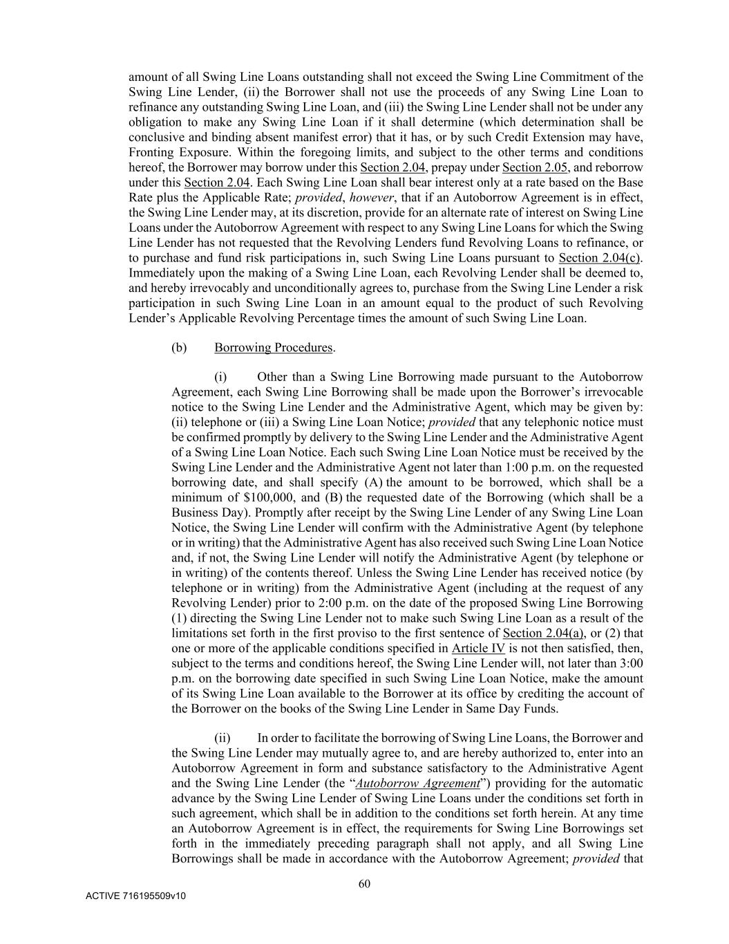 60 ACTIVE 716195509v10 amount of all Swing Line Loans outstanding shall not exceed the Swing Line Commitment of the Swing Line Lender, (ii) the Borrower shall not use the proceeds of any Swing Line Loan to refinance any outstanding Swing Line Loan, and (iii) the Swing Line Lender shall not be under any obligation to make any Swing Line Loan if it shall determine (which determination shall be conclusive and binding absent manifest error) that it has, or by such Credit Extension may have, Fronting Exposure. Within the foregoing limits, and subject to the other terms and conditions hereof, the Borrower may borrow under this Section 2.04, prepay under Section 2.05, and reborrow under this Section 2.04. Each Swing Line Loan shall bear interest only at a rate based on the Base Rate plus the Applicable Rate; provided, however, that if an Autoborrow Agreement is in effect, the Swing Line Lender may, at its discretion, provide for an alternate rate of interest on Swing Line Loans under the Autoborrow Agreement with respect to any Swing Line Loans for which the Swing Line Lender has not requested that the Revolving Lenders fund Revolving Loans to refinance, or to purchase and fund risk participations in, such Swing Line Loans pursuant to Section 2.04(c). Immediately upon the making of a Swing Line Loan, each Revolving Lender shall be deemed to, and hereby irrevocably and unconditionally agrees to, purchase from the Swing Line Lender a risk participation in such Swing Line Loan in an amount equal to the product of such Revolving Lender’s Applicable Revolving Percentage times the amount of such Swing Line Loan. (b) Borrowing Procedures. (i) Other than a Swing Line Borrowing made pursuant to the Autoborrow Agreement, each Swing Line Borrowing shall be made upon the Borrower’s irrevocable notice to the Swing Line Lender and the Administrative Agent, which may be given by: (ii) telephone or (iii) a Swing Line Loan Notice; provided that any telephonic notice must be confirmed promptly by delivery to the Swing Line Lender and the Administrative Agent of a Swing Line Loan Notice. Each such Swing Line Loan Notice must be received by the Swing Line Lender and the Administrative Agent not later than 1:00 p.m. on the requested borrowing date, and shall specify (A) the amount to be borrowed, which shall be a minimum of $100,000, and (B) the requested date of the Borrowing (which shall be a Business Day). Promptly after receipt by the Swing Line Lender of any Swing Line Loan Notice, the Swing Line Lender will confirm with the Administrative Agent (by telephone or in writing) that the Administrative Agent has also received such Swing Line Loan Notice and, if not, the Swing Line Lender will notify the Administrative Agent (by telephone or in writing) of the contents thereof. Unless the Swing Line Lender has received notice (by telephone or in writing) from the Administrative Agent (including at the request of any Revolving Lender) prior to 2:00 p.m. on the date of the proposed Swing Line Borrowing (1) directing the Swing Line Lender not to make such Swing Line Loan as a result of the limitations set forth in the first proviso to the first sentence of Section 2.04(a), or (2) that one or more of the applicable conditions specified in Article IV is not then satisfied, then, subject to the terms and conditions hereof, the Swing Line Lender will, not later than 3:00 p.m. on the borrowing date specified in such Swing Line Loan Notice, make the amount of its Swing Line Loan available to the Borrower at its office by crediting the account of the Borrower on the books of the Swing Line Lender in Same Day Funds. (ii) In order to facilitate the borrowing of Swing Line Loans, the Borrower and the Swing Line Lender may mutually agree to, and are hereby authorized to, enter into an Autoborrow Agreement in form and substance satisfactory to the Administrative Agent and the Swing Line Lender (the “Autoborrow Agreement”) providing for the automatic advance by the Swing Line Lender of Swing Line Loans under the conditions set forth in such agreement, which shall be in addition to the conditions set forth herein. At any time an Autoborrow Agreement is in effect, the requirements for Swing Line Borrowings set forth in the immediately preceding paragraph shall not apply, and all Swing Line Borrowings shall be made in accordance with the Autoborrow Agreement; provided that