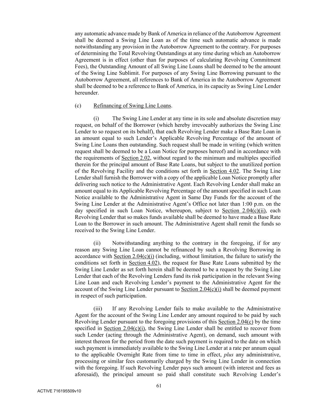 61 ACTIVE 716195509v10 any automatic advance made by Bank of America in reliance of the Autoborrow Agreement shall be deemed a Swing Line Loan as of the time such automatic advance is made notwithstanding any provision in the Autoborrow Agreement to the contrary. For purposes of determining the Total Revolving Outstandings at any time during which an Autoborrow Agreement is in effect (other than for purposes of calculating Revolving Commitment Fees), the Outstanding Amount of all Swing Line Loans shall be deemed to be the amount of the Swing Line Sublimit. For purposes of any Swing Line Borrowing pursuant to the Autoborrow Agreement, all references to Bank of America in the Autoborrow Agreement shall be deemed to be a reference to Bank of America, in its capacity as Swing Line Lender hereunder. (c) Refinancing of Swing Line Loans. (i) The Swing Line Lender at any time in its sole and absolute discretion may request, on behalf of the Borrower (which hereby irrevocably authorizes the Swing Line Lender to so request on its behalf), that each Revolving Lender make a Base Rate Loan in an amount equal to such Lender’s Applicable Revolving Percentage of the amount of Swing Line Loans then outstanding. Such request shall be made in writing (which written request shall be deemed to be a Loan Notice for purposes hereof) and in accordance with the requirements of Section 2.02, without regard to the minimum and multiples specified therein for the principal amount of Base Rate Loans, but subject to the unutilized portion of the Revolving Facility and the conditions set forth in Section 4.02. The Swing Line Lender shall furnish the Borrower with a copy of the applicable Loan Notice promptly after delivering such notice to the Administrative Agent. Each Revolving Lender shall make an amount equal to its Applicable Revolving Percentage of the amount specified in such Loan Notice available to the Administrative Agent in Same Day Funds for the account of the Swing Line Lender at the Administrative Agent’s Office not later than 1:00 p.m. on the day specified in such Loan Notice, whereupon, subject to Section 2.04(c)(ii), each Revolving Lender that so makes funds available shall be deemed to have made a Base Rate Loan to the Borrower in such amount. The Administrative Agent shall remit the funds so received to the Swing Line Lender. (ii) Notwithstanding anything to the contrary in the foregoing, if for any reason any Swing Line Loan cannot be refinanced by such a Revolving Borrowing in accordance with Section 2.04(c)(i) (including, without limitation, the failure to satisfy the conditions set forth in Section 4.02), the request for Base Rate Loans submitted by the Swing Line Lender as set forth herein shall be deemed to be a request by the Swing Line Lender that each of the Revolving Lenders fund its risk participation in the relevant Swing Line Loan and each Revolving Lender’s payment to the Administrative Agent for the account of the Swing Line Lender pursuant to Section 2.04(c)(i) shall be deemed payment in respect of such participation. (iii) If any Revolving Lender fails to make available to the Administrative Agent for the account of the Swing Line Lender any amount required to be paid by such Revolving Lender pursuant to the foregoing provisions of this Section 2.04(c) by the time specified in Section 2.04(c)(i), the Swing Line Lender shall be entitled to recover from such Lender (acting through the Administrative Agent), on demand, such amount with interest thereon for the period from the date such payment is required to the date on which such payment is immediately available to the Swing Line Lender at a rate per annum equal to the applicable Overnight Rate from time to time in effect, plus any administrative, processing or similar fees customarily charged by the Swing Line Lender in connection with the foregoing. If such Revolving Lender pays such amount (with interest and fees as aforesaid), the principal amount so paid shall constitute such Revolving Lender’s