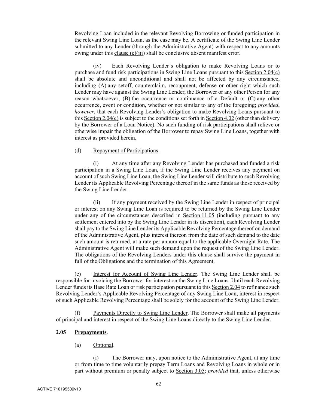 62 ACTIVE 716195509v10 Revolving Loan included in the relevant Revolving Borrowing or funded participation in the relevant Swing Line Loan, as the case may be. A certificate of the Swing Line Lender submitted to any Lender (through the Administrative Agent) with respect to any amounts owing under this clause (c)(iii) shall be conclusive absent manifest error. (iv) Each Revolving Lender’s obligation to make Revolving Loans or to purchase and fund risk participations in Swing Line Loans pursuant to this Section 2.04(c) shall be absolute and unconditional and shall not be affected by any circumstance, including (A) any setoff, counterclaim, recoupment, defense or other right which such Lender may have against the Swing Line Lender, the Borrower or any other Person for any reason whatsoever, (B) the occurrence or continuance of a Default or (C) any other occurrence, event or condition, whether or not similar to any of the foregoing; provided, however, that each Revolving Lender’s obligation to make Revolving Loans pursuant to this Section 2.04(c) is subject to the conditions set forth in Section 4.02 (other than delivery by the Borrower of a Loan Notice). No such funding of risk participations shall relieve or otherwise impair the obligation of the Borrower to repay Swing Line Loans, together with interest as provided herein. (d) Repayment of Participations. (i) At any time after any Revolving Lender has purchased and funded a risk participation in a Swing Line Loan, if the Swing Line Lender receives any payment on account of such Swing Line Loan, the Swing Line Lender will distribute to such Revolving Lender its Applicable Revolving Percentage thereof in the same funds as those received by the Swing Line Lender. (ii) If any payment received by the Swing Line Lender in respect of principal or interest on any Swing Line Loan is required to be returned by the Swing Line Lender under any of the circumstances described in Section 11.05 (including pursuant to any settlement entered into by the Swing Line Lender in its discretion), each Revolving Lender shall pay to the Swing Line Lender its Applicable Revolving Percentage thereof on demand of the Administrative Agent, plus interest thereon from the date of such demand to the date such amount is returned, at a rate per annum equal to the applicable Overnight Rate. The Administrative Agent will make such demand upon the request of the Swing Line Lender. The obligations of the Revolving Lenders under this clause shall survive the payment in full of the Obligations and the termination of this Agreement. (e) Interest for Account of Swing Line Lender. The Swing Line Lender shall be responsible for invoicing the Borrower for interest on the Swing Line Loans. Until each Revolving Lender funds its Base Rate Loan or risk participation pursuant to this Section 2.04 to refinance such Revolving Lender’s Applicable Revolving Percentage of any Swing Line Loan, interest in respect of such Applicable Revolving Percentage shall be solely for the account of the Swing Line Lender. (f) Payments Directly to Swing Line Lender. The Borrower shall make all payments of principal and interest in respect of the Swing Line Loans directly to the Swing Line Lender. 2.05 Prepayments. (a) Optional. (i) The Borrower may, upon notice to the Administrative Agent, at any time or from time to time voluntarily prepay Term Loans and Revolving Loans in whole or in part without premium or penalty subject to Section 3.05; provided that, unless otherwise