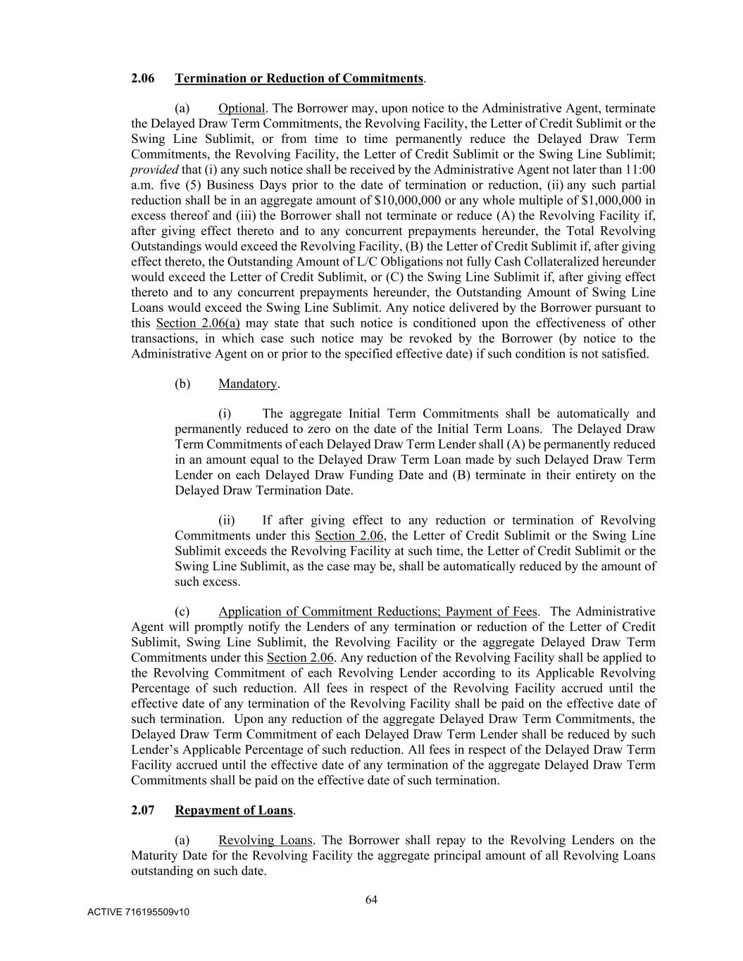 64 ACTIVE 716195509v10 2.06 Termination or Reduction of Commitments. (a) Optional. The Borrower may, upon notice to the Administrative Agent, terminate the Delayed Draw Term Commitments, the Revolving Facility, the Letter of Credit Sublimit or the Swing Line Sublimit, or from time to time permanently reduce the Delayed Draw Term Commitments, the Revolving Facility, the Letter of Credit Sublimit or the Swing Line Sublimit; provided that (i) any such notice shall be received by the Administrative Agent not later than 11:00 a.m. five (5) Business Days prior to the date of termination or reduction, (ii) any such partial reduction shall be in an aggregate amount of $10,000,000 or any whole multiple of $1,000,000 in excess thereof and (iii) the Borrower shall not terminate or reduce (A) the Revolving Facility if, after giving effect thereto and to any concurrent prepayments hereunder, the Total Revolving Outstandings would exceed the Revolving Facility, (B) the Letter of Credit Sublimit if, after giving effect thereto, the Outstanding Amount of L/C Obligations not fully Cash Collateralized hereunder would exceed the Letter of Credit Sublimit, or (C) the Swing Line Sublimit if, after giving effect thereto and to any concurrent prepayments hereunder, the Outstanding Amount of Swing Line Loans would exceed the Swing Line Sublimit. Any notice delivered by the Borrower pursuant to this Section 2.06(a) may state that such notice is conditioned upon the effectiveness of other transactions, in which case such notice may be revoked by the Borrower (by notice to the Administrative Agent on or prior to the specified effective date) if such condition is not satisfied. (b) Mandatory. (i) The aggregate Initial Term Commitments shall be automatically and permanently reduced to zero on the date of the Initial Term Loans. The Delayed Draw Term Commitments of each Delayed Draw Term Lender shall (A) be permanently reduced in an amount equal to the Delayed Draw Term Loan made by such Delayed Draw Term Lender on each Delayed Draw Funding Date and (B) terminate in their entirety on the Delayed Draw Termination Date. (ii) If after giving effect to any reduction or termination of Revolving Commitments under this Section 2.06, the Letter of Credit Sublimit or the Swing Line Sublimit exceeds the Revolving Facility at such time, the Letter of Credit Sublimit or the Swing Line Sublimit, as the case may be, shall be automatically reduced by the amount of such excess. (c) Application of Commitment Reductions; Payment of Fees. The Administrative Agent will promptly notify the Lenders of any termination or reduction of the Letter of Credit Sublimit, Swing Line Sublimit, the Revolving Facility or the aggregate Delayed Draw Term Commitments under this Section 2.06. Any reduction of the Revolving Facility shall be applied to the Revolving Commitment of each Revolving Lender according to its Applicable Revolving Percentage of such reduction. All fees in respect of the Revolving Facility accrued until the effective date of any termination of the Revolving Facility shall be paid on the effective date of such termination. Upon any reduction of the aggregate Delayed Draw Term Commitments, the Delayed Draw Term Commitment of each Delayed Draw Term Lender shall be reduced by such Lender’s Applicable Percentage of such reduction. All fees in respect of the Delayed Draw Term Facility accrued until the effective date of any termination of the aggregate Delayed Draw Term Commitments shall be paid on the effective date of such termination. 2.07 Repayment of Loans. (a) Revolving Loans. The Borrower shall repay to the Revolving Lenders on the Maturity Date for the Revolving Facility the aggregate principal amount of all Revolving Loans outstanding on such date.