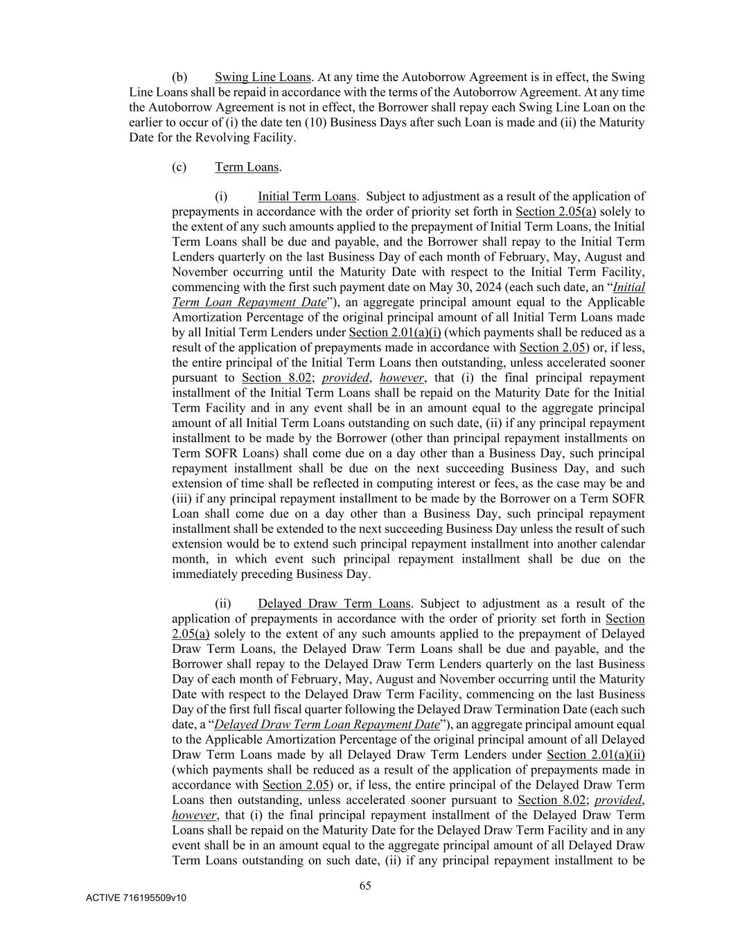 65 ACTIVE 716195509v10 (b) Swing Line Loans. At any time the Autoborrow Agreement is in effect, the Swing Line Loans shall be repaid in accordance with the terms of the Autoborrow Agreement. At any time the Autoborrow Agreement is not in effect, the Borrower shall repay each Swing Line Loan on the earlier to occur of (i) the date ten (10) Business Days after such Loan is made and (ii) the Maturity Date for the Revolving Facility. (c) Term Loans. (i) Initial Term Loans. Subject to adjustment as a result of the application of prepayments in accordance with the order of priority set forth in Section 2.05(a) solely to the extent of any such amounts applied to the prepayment of Initial Term Loans, the Initial Term Loans shall be due and payable, and the Borrower shall repay to the Initial Term Lenders quarterly on the last Business Day of each month of February, May, August and November occurring until the Maturity Date with respect to the Initial Term Facility, commencing with the first such payment date on May 30, 2024 (each such date, an “Initial Term Loan Repayment Date”), an aggregate principal amount equal to the Applicable Amortization Percentage of the original principal amount of all Initial Term Loans made by all Initial Term Lenders under Section 2.01(a)(i) (which payments shall be reduced as a result of the application of prepayments made in accordance with Section 2.05) or, if less, the entire principal of the Initial Term Loans then outstanding, unless accelerated sooner pursuant to Section 8.02; provided, however, that (i) the final principal repayment installment of the Initial Term Loans shall be repaid on the Maturity Date for the Initial Term Facility and in any event shall be in an amount equal to the aggregate principal amount of all Initial Term Loans outstanding on such date, (ii) if any principal repayment installment to be made by the Borrower (other than principal repayment installments on Term SOFR Loans) shall come due on a day other than a Business Day, such principal repayment installment shall be due on the next succeeding Business Day, and such extension of time shall be reflected in computing interest or fees, as the case may be and (iii) if any principal repayment installment to be made by the Borrower on a Term SOFR Loan shall come due on a day other than a Business Day, such principal repayment installment shall be extended to the next succeeding Business Day unless the result of such extension would be to extend such principal repayment installment into another calendar month, in which event such principal repayment installment shall be due on the immediately preceding Business Day. (ii) Delayed Draw Term Loans. Subject to adjustment as a result of the application of prepayments in accordance with the order of priority set forth in Section 2.05(a) solely to the extent of any such amounts applied to the prepayment of Delayed Draw Term Loans, the Delayed Draw Term Loans shall be due and payable, and the Borrower shall repay to the Delayed Draw Term Lenders quarterly on the last Business Day of each month of February, May, August and November occurring until the Maturity Date with respect to the Delayed Draw Term Facility, commencing on the last Business Day of the first full fiscal quarter following the Delayed Draw Termination Date (each such date, a “Delayed Draw Term Loan Repayment Date”), an aggregate principal amount equal to the Applicable Amortization Percentage of the original principal amount of all Delayed Draw Term Loans made by all Delayed Draw Term Lenders under Section 2.01(a)(ii) (which payments shall be reduced as a result of the application of prepayments made in accordance with Section 2.05) or, if less, the entire principal of the Delayed Draw Term Loans then outstanding, unless accelerated sooner pursuant to Section 8.02; provided, however, that (i) the final principal repayment installment of the Delayed Draw Term Loans shall be repaid on the Maturity Date for the Delayed Draw Term Facility and in any event shall be in an amount equal to the aggregate principal amount of all Delayed Draw Term Loans outstanding on such date, (ii) if any principal repayment installment to be