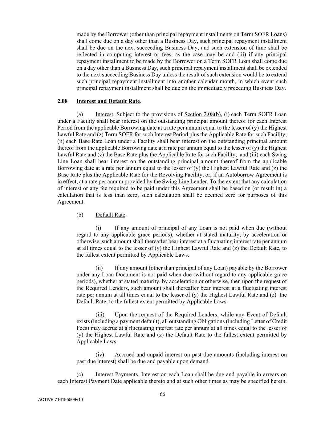 66 ACTIVE 716195509v10 made by the Borrower (other than principal repayment installments on Term SOFR Loans) shall come due on a day other than a Business Day, such principal repayment installment shall be due on the next succeeding Business Day, and such extension of time shall be reflected in computing interest or fees, as the case may be and (iii) if any principal repayment installment to be made by the Borrower on a Term SOFR Loan shall come due on a day other than a Business Day, such principal repayment installment shall be extended to the next succeeding Business Day unless the result of such extension would be to extend such principal repayment installment into another calendar month, in which event such principal repayment installment shall be due on the immediately preceding Business Day. 2.08 Interest and Default Rate. (a) Interest. Subject to the provisions of Section 2.08(b), (i) each Term SOFR Loan under a Facility shall bear interest on the outstanding principal amount thereof for each Interest Period from the applicable Borrowing date at a rate per annum equal to the lesser of (y) the Highest Lawful Rate and (z) Term SOFR for such Interest Period plus the Applicable Rate for such Facility; (ii) each Base Rate Loan under a Facility shall bear interest on the outstanding principal amount thereof from the applicable Borrowing date at a rate per annum equal to the lesser of (y) the Highest Lawful Rate and (z) the Base Rate plus the Applicable Rate for such Facility; and (iii) each Swing Line Loan shall bear interest on the outstanding principal amount thereof from the applicable Borrowing date at a rate per annum equal to the lesser of (y) the Highest Lawful Rate and (z) the Base Rate plus the Applicable Rate for the Revolving Facility, or, if an Autoborrow Agreement is in effect, at a rate per annum provided by the Swing Line Lender. To the extent that any calculation of interest or any fee required to be paid under this Agreement shall be based on (or result in) a calculation that is less than zero, such calculation shall be deemed zero for purposes of this Agreement. (b) Default Rate. (i) If any amount of principal of any Loan is not paid when due (without regard to any applicable grace periods), whether at stated maturity, by acceleration or otherwise, such amount shall thereafter bear interest at a fluctuating interest rate per annum at all times equal to the lesser of (y) the Highest Lawful Rate and (z) the Default Rate, to the fullest extent permitted by Applicable Laws. (ii) If any amount (other than principal of any Loan) payable by the Borrower under any Loan Document is not paid when due (without regard to any applicable grace periods), whether at stated maturity, by acceleration or otherwise, then upon the request of the Required Lenders, such amount shall thereafter bear interest at a fluctuating interest rate per annum at all times equal to the lesser of (y) the Highest Lawful Rate and (z) the Default Rate, to the fullest extent permitted by Applicable Laws. (iii) Upon the request of the Required Lenders, while any Event of Default exists (including a payment default), all outstanding Obligations (including Letter of Credit Fees) may accrue at a fluctuating interest rate per annum at all times equal to the lesser of (y) the Highest Lawful Rate and (z) the Default Rate to the fullest extent permitted by Applicable Laws. (iv) Accrued and unpaid interest on past due amounts (including interest on past due interest) shall be due and payable upon demand. (c) Interest Payments. Interest on each Loan shall be due and payable in arrears on each Interest Payment Date applicable thereto and at such other times as may be specified herein.