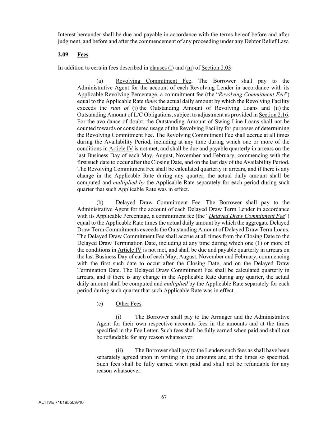 67 ACTIVE 716195509v10 Interest hereunder shall be due and payable in accordance with the terms hereof before and after judgment, and before and after the commencement of any proceeding under any Debtor Relief Law. 2.09 Fees. In addition to certain fees described in clauses (l) and (m) of Section 2.03: (a) Revolving Commitment Fee. The Borrower shall pay to the Administrative Agent for the account of each Revolving Lender in accordance with its Applicable Revolving Percentage, a commitment fee (the “Revolving Commitment Fee”) equal to the Applicable Rate times the actual daily amount by which the Revolving Facility exceeds the sum of (i) the Outstanding Amount of Revolving Loans and (ii) the Outstanding Amount of L/C Obligations, subject to adjustment as provided in Section 2.16. For the avoidance of doubt, the Outstanding Amount of Swing Line Loans shall not be counted towards or considered usage of the Revolving Facility for purposes of determining the Revolving Commitment Fee. The Revolving Commitment Fee shall accrue at all times during the Availability Period, including at any time during which one or more of the conditions in Article IV is not met, and shall be due and payable quarterly in arrears on the last Business Day of each May, August, November and February, commencing with the first such date to occur after the Closing Date, and on the last day of the Availability Period. The Revolving Commitment Fee shall be calculated quarterly in arrears, and if there is any change in the Applicable Rate during any quarter, the actual daily amount shall be computed and multiplied by the Applicable Rate separately for each period during such quarter that such Applicable Rate was in effect. (b) Delayed Draw Commitment Fee. The Borrower shall pay to the Administrative Agent for the account of each Delayed Draw Term Lender in accordance with its Applicable Percentage, a commitment fee (the “Delayed Draw Commitment Fee”) equal to the Applicable Rate times the actual daily amount by which the aggregate Delayed Draw Term Commitments exceeds the Outstanding Amount of Delayed Draw Term Loans. The Delayed Draw Commitment Fee shall accrue at all times from the Closing Date to the Delayed Draw Termination Date, including at any time during which one (1) or more of the conditions in Article IV is not met, and shall be due and payable quarterly in arrears on the last Business Day of each of each May, August, November and February, commencing with the first such date to occur after the Closing Date, and on the Delayed Draw Termination Date. The Delayed Draw Commitment Fee shall be calculated quarterly in arrears, and if there is any change in the Applicable Rate during any quarter, the actual daily amount shall be computed and multiplied by the Applicable Rate separately for each period during such quarter that such Applicable Rate was in effect. (c) Other Fees. (i) The Borrower shall pay to the Arranger and the Administrative Agent for their own respective accounts fees in the amounts and at the times specified in the Fee Letter. Such fees shall be fully earned when paid and shall not be refundable for any reason whatsoever. (ii) The Borrower shall pay to the Lenders such fees as shall have been separately agreed upon in writing in the amounts and at the times so specified. Such fees shall be fully earned when paid and shall not be refundable for any reason whatsoever.