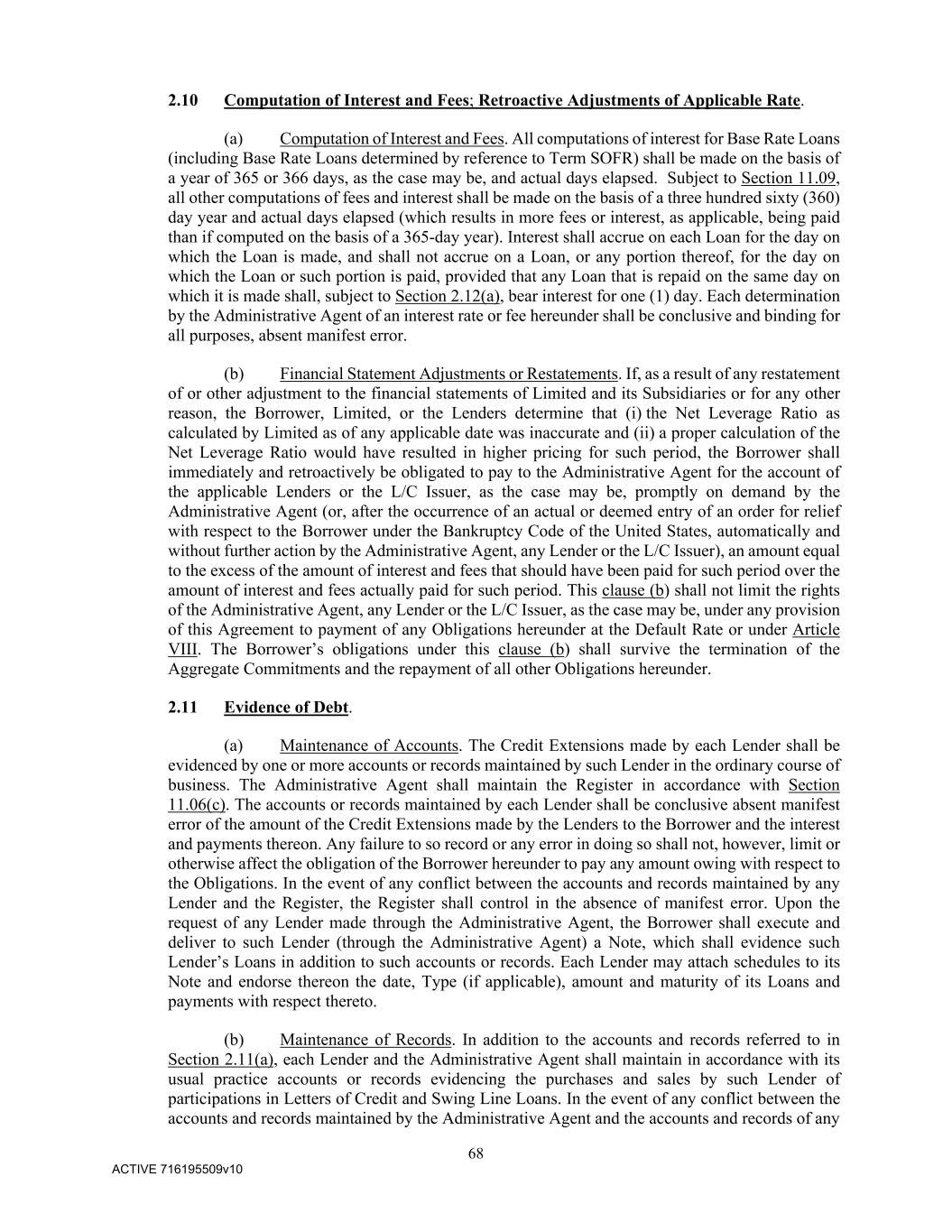 68 ACTIVE 716195509v10 2.10 Computation of Interest and Fees; Retroactive Adjustments of Applicable Rate. (a) Computation of Interest and Fees. All computations of interest for Base Rate Loans (including Base Rate Loans determined by reference to Term SOFR) shall be made on the basis of a year of 365 or 366 days, as the case may be, and actual days elapsed. Subject to Section 11.09, all other computations of fees and interest shall be made on the basis of a three hundred sixty (360) day year and actual days elapsed (which results in more fees or interest, as applicable, being paid than if computed on the basis of a 365-day year). Interest shall accrue on each Loan for the day on which the Loan is made, and shall not accrue on a Loan, or any portion thereof, for the day on which the Loan or such portion is paid, provided that any Loan that is repaid on the same day on which it is made shall, subject to Section 2.12(a), bear interest for one (1) day. Each determination by the Administrative Agent of an interest rate or fee hereunder shall be conclusive and binding for all purposes, absent manifest error. (b) Financial Statement Adjustments or Restatements. If, as a result of any restatement of or other adjustment to the financial statements of Limited and its Subsidiaries or for any other reason, the Borrower, Limited, or the Lenders determine that (i) the Net Leverage Ratio as calculated by Limited as of any applicable date was inaccurate and (ii) a proper calculation of the Net Leverage Ratio would have resulted in higher pricing for such period, the Borrower shall immediately and retroactively be obligated to pay to the Administrative Agent for the account of the applicable Lenders or the L/C Issuer, as the case may be, promptly on demand by the Administrative Agent (or, after the occurrence of an actual or deemed entry of an order for relief with respect to the Borrower under the Bankruptcy Code of the United States, automatically and without further action by the Administrative Agent, any Lender or the L/C Issuer), an amount equal to the excess of the amount of interest and fees that should have been paid for such period over the amount of interest and fees actually paid for such period. This clause (b) shall not limit the rights of the Administrative Agent, any Lender or the L/C Issuer, as the case may be, under any provision of this Agreement to payment of any Obligations hereunder at the Default Rate or under Article VIII. The Borrower’s obligations under this clause (b) shall survive the termination of the Aggregate Commitments and the repayment of all other Obligations hereunder. 2.11 Evidence of Debt. (a) Maintenance of Accounts. The Credit Extensions made by each Lender shall be evidenced by one or more accounts or records maintained by such Lender in the ordinary course of business. The Administrative Agent shall maintain the Register in accordance with Section 11.06(c). The accounts or records maintained by each Lender shall be conclusive absent manifest error of the amount of the Credit Extensions made by the Lenders to the Borrower and the interest and payments thereon. Any failure to so record or any error in doing so shall not, however, limit or otherwise affect the obligation of the Borrower hereunder to pay any amount owing with respect to the Obligations. In the event of any conflict between the accounts and records maintained by any Lender and the Register, the Register shall control in the absence of manifest error. Upon the request of any Lender made through the Administrative Agent, the Borrower shall execute and deliver to such Lender (through the Administrative Agent) a Note, which shall evidence such Lender’s Loans in addition to such accounts or records. Each Lender may attach schedules to its Note and endorse thereon the date, Type (if applicable), amount and maturity of its Loans and payments with respect thereto. (b) Maintenance of Records. In addition to the accounts and records referred to in Section 2.11(a), each Lender and the Administrative Agent shall maintain in accordance with its usual practice accounts or records evidencing the purchases and sales by such Lender of participations in Letters of Credit and Swing Line Loans. In the event of any conflict between the accounts and records maintained by the Administrative Agent and the accounts and records of any