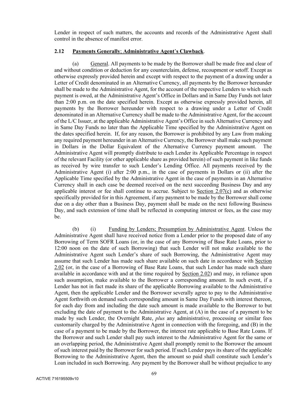 69 ACTIVE 716195509v10 Lender in respect of such matters, the accounts and records of the Administrative Agent shall control in the absence of manifest error. 2.12 Payments Generally; Administrative Agent’s Clawback. (a) General. All payments to be made by the Borrower shall be made free and clear of and without condition or deduction for any counterclaim, defense, recoupment or setoff. Except as otherwise expressly provided herein and except with respect to the payment of a drawing under a Letter of Credit denominated in an Alternative Currency, all payments by the Borrower hereunder shall be made to the Administrative Agent, for the account of the respective Lenders to which such payment is owed, at the Administrative Agent’s Office in Dollars and in Same Day Funds not later than 2:00 p.m. on the date specified herein. Except as otherwise expressly provided herein, all payments by the Borrower hereunder with respect to a drawing under a Letter of Credit denominated in an Alternative Currency shall be made to the Administrative Agent, for the account of the L/C Issuer, at the applicable Administrative Agent’s Office in such Alternative Currency and in Same Day Funds no later than the Applicable Time specified by the Administrative Agent on the dates specified herein. If, for any reason, the Borrower is prohibited by any Law from making any required payment hereunder in an Alternative Currency, the Borrower shall make such payment in Dollars in the Dollar Equivalent of the Alternative Currency payment amount. The Administrative Agent will promptly distribute to each Lender its Applicable Percentage in respect of the relevant Facility (or other applicable share as provided herein) of such payment in like funds as received by wire transfer to such Lender’s Lending Office. All payments received by the Administrative Agent (i) after 2:00 p.m., in the case of payments in Dollars or (ii) after the Applicable Time specified by the Administrative Agent in the case of payments in an Alternative Currency shall in each case be deemed received on the next succeeding Business Day and any applicable interest or fee shall continue to accrue. Subject to Section 2.07(c) and as otherwise specifically provided for in this Agreement, if any payment to be made by the Borrower shall come due on a day other than a Business Day, payment shall be made on the next following Business Day, and such extension of time shall be reflected in computing interest or fees, as the case may be. (b) (i) Funding by Lenders; Presumption by Administrative Agent. Unless the Administrative Agent shall have received notice from a Lender prior to the proposed date of any Borrowing of Term SOFR Loans (or, in the case of any Borrowing of Base Rate Loans, prior to 12:00 noon on the date of such Borrowing) that such Lender will not make available to the Administrative Agent such Lender’s share of such Borrowing, the Administrative Agent may assume that such Lender has made such share available on such date in accordance with Section 2.02 (or, in the case of a Borrowing of Base Rate Loans, that such Lender has made such share available in accordance with and at the time required by Section 2.02) and may, in reliance upon such assumption, make available to the Borrower a corresponding amount. In such event, if a Lender has not in fact made its share of the applicable Borrowing available to the Administrative Agent, then the applicable Lender and the Borrower severally agree to pay to the Administrative Agent forthwith on demand such corresponding amount in Same Day Funds with interest thereon, for each day from and including the date such amount is made available to the Borrower to but excluding the date of payment to the Administrative Agent, at (A) in the case of a payment to be made by such Lender, the Overnight Rate, plus any administrative, processing or similar fees customarily charged by the Administrative Agent in connection with the foregoing, and (B) in the case of a payment to be made by the Borrower, the interest rate applicable to Base Rate Loans. If the Borrower and such Lender shall pay such interest to the Administrative Agent for the same or an overlapping period, the Administrative Agent shall promptly remit to the Borrower the amount of such interest paid by the Borrower for such period. If such Lender pays its share of the applicable Borrowing to the Administrative Agent, then the amount so paid shall constitute such Lender’s Loan included in such Borrowing. Any payment by the Borrower shall be without prejudice to any