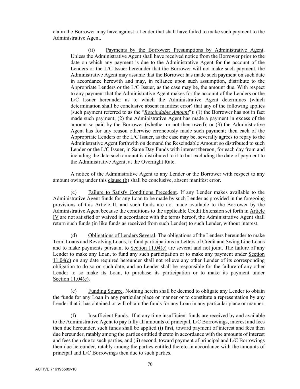 70 ACTIVE 716195509v10 claim the Borrower may have against a Lender that shall have failed to make such payment to the Administrative Agent. (ii) Payments by the Borrower; Presumptions by Administrative Agent. Unless the Administrative Agent shall have received notice from the Borrower prior to the date on which any payment is due to the Administrative Agent for the account of the Lenders or the L/C Issuer hereunder that the Borrower will not make such payment, the Administrative Agent may assume that the Borrower has made such payment on such date in accordance herewith and may, in reliance upon such assumption, distribute to the Appropriate Lenders or the L/C Issuer, as the case may be, the amount due. With respect to any payment that the Administrative Agent makes for the account of the Lenders or the L/C Issuer hereunder as to which the Administrative Agent determines (which determination shall be conclusive absent manifest error) that any of the following applies (such payment referred to as the “Rescindable Amount”): (1) the Borrower has not in fact made such payment; (2) the Administrative Agent has made a payment in excess of the amount so paid by the Borrower (whether or not then owed); or (3) the Administrative Agent has for any reason otherwise erroneously made such payment; then each of the Appropriate Lenders or the L/C Issuer, as the case may be, severally agrees to repay to the Administrative Agent forthwith on demand the Rescindable Amount so distributed to such Lender or the L/C Issuer, in Same Day Funds with interest thereon, for each day from and including the date such amount is distributed to it to but excluding the date of payment to the Administrative Agent, at the Overnight Rate. A notice of the Administrative Agent to any Lender or the Borrower with respect to any amount owing under this clause (b) shall be conclusive, absent manifest error. (c) Failure to Satisfy Conditions Precedent. If any Lender makes available to the Administrative Agent funds for any Loan to be made by such Lender as provided in the foregoing provisions of this Article II, and such funds are not made available to the Borrower by the Administrative Agent because the conditions to the applicable Credit Extension set forth in Article IV are not satisfied or waived in accordance with the terms hereof, the Administrative Agent shall return such funds (in like funds as received from such Lender) to such Lender, without interest. (d) Obligations of Lenders Several. The obligations of the Lenders hereunder to make Term Loans and Revolving Loans, to fund participations in Letters of Credit and Swing Line Loans and to make payments pursuant to Section 11.04(c) are several and not joint. The failure of any Lender to make any Loan, to fund any such participation or to make any payment under Section 11.04(c) on any date required hereunder shall not relieve any other Lender of its corresponding obligation to do so on such date, and no Lender shall be responsible for the failure of any other Lender to so make its Loan, to purchase its participation or to make its payment under Section 11.04(c). (e) Funding Source. Nothing herein shall be deemed to obligate any Lender to obtain the funds for any Loan in any particular place or manner or to constitute a representation by any Lender that it has obtained or will obtain the funds for any Loan in any particular place or manner. (f) Insufficient Funds. If at any time insufficient funds are received by and available to the Administrative Agent to pay fully all amounts of principal, L/C Borrowings, interest and fees then due hereunder, such funds shall be applied (i) first, toward payment of interest and fees then due hereunder, ratably among the parties entitled thereto in accordance with the amounts of interest and fees then due to such parties, and (ii) second, toward payment of principal and L/C Borrowings then due hereunder, ratably among the parties entitled thereto in accordance with the amounts of principal and L/C Borrowings then due to such parties.