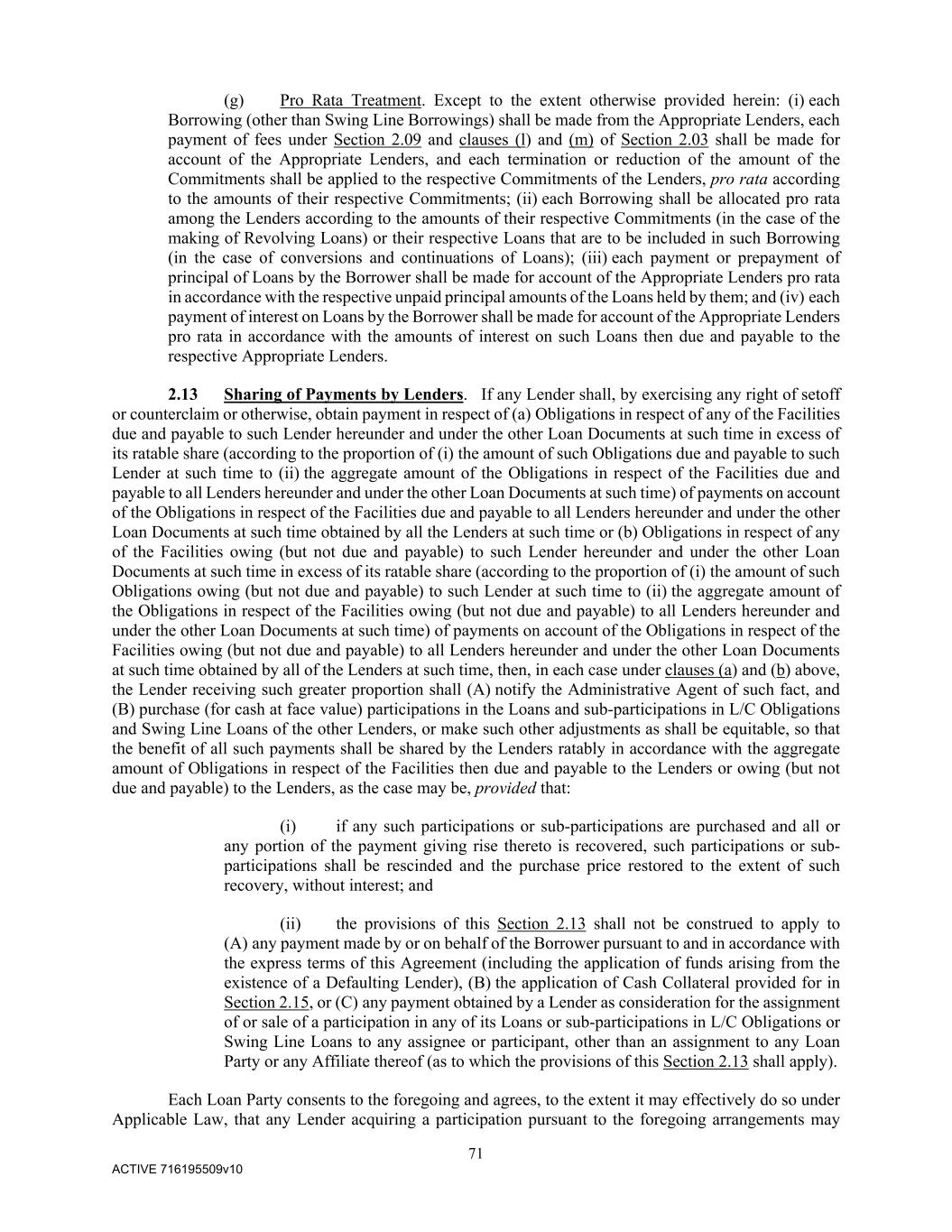 71 ACTIVE 716195509v10 (g) Pro Rata Treatment. Except to the extent otherwise provided herein: (i) each Borrowing (other than Swing Line Borrowings) shall be made from the Appropriate Lenders, each payment of fees under Section 2.09 and clauses (l) and (m) of Section 2.03 shall be made for account of the Appropriate Lenders, and each termination or reduction of the amount of the Commitments shall be applied to the respective Commitments of the Lenders, pro rata according to the amounts of their respective Commitments; (ii) each Borrowing shall be allocated pro rata among the Lenders according to the amounts of their respective Commitments (in the case of the making of Revolving Loans) or their respective Loans that are to be included in such Borrowing (in the case of conversions and continuations of Loans); (iii) each payment or prepayment of principal of Loans by the Borrower shall be made for account of the Appropriate Lenders pro rata in accordance with the respective unpaid principal amounts of the Loans held by them; and (iv) each payment of interest on Loans by the Borrower shall be made for account of the Appropriate Lenders pro rata in accordance with the amounts of interest on such Loans then due and payable to the respective Appropriate Lenders. 2.13 Sharing of Payments by Lenders. If any Lender shall, by exercising any right of setoff or counterclaim or otherwise, obtain payment in respect of (a) Obligations in respect of any of the Facilities due and payable to such Lender hereunder and under the other Loan Documents at such time in excess of its ratable share (according to the proportion of (i) the amount of such Obligations due and payable to such Lender at such time to (ii) the aggregate amount of the Obligations in respect of the Facilities due and payable to all Lenders hereunder and under the other Loan Documents at such time) of payments on account of the Obligations in respect of the Facilities due and payable to all Lenders hereunder and under the other Loan Documents at such time obtained by all the Lenders at such time or (b) Obligations in respect of any of the Facilities owing (but not due and payable) to such Lender hereunder and under the other Loan Documents at such time in excess of its ratable share (according to the proportion of (i) the amount of such Obligations owing (but not due and payable) to such Lender at such time to (ii) the aggregate amount of the Obligations in respect of the Facilities owing (but not due and payable) to all Lenders hereunder and under the other Loan Documents at such time) of payments on account of the Obligations in respect of the Facilities owing (but not due and payable) to all Lenders hereunder and under the other Loan Documents at such time obtained by all of the Lenders at such time, then, in each case under clauses (a) and (b) above, the Lender receiving such greater proportion shall (A) notify the Administrative Agent of such fact, and (B) purchase (for cash at face value) participations in the Loans and sub-participations in L/C Obligations and Swing Line Loans of the other Lenders, or make such other adjustments as shall be equitable, so that the benefit of all such payments shall be shared by the Lenders ratably in accordance with the aggregate amount of Obligations in respect of the Facilities then due and payable to the Lenders or owing (but not due and payable) to the Lenders, as the case may be, provided that: (i) if any such participations or sub-participations are purchased and all or any portion of the payment giving rise thereto is recovered, such participations or sub- participations shall be rescinded and the purchase price restored to the extent of such recovery, without interest; and (ii) the provisions of this Section 2.13 shall not be construed to apply to (A) any payment made by or on behalf of the Borrower pursuant to and in accordance with the express terms of this Agreement (including the application of funds arising from the existence of a Defaulting Lender), (B) the application of Cash Collateral provided for in Section 2.15, or (C) any payment obtained by a Lender as consideration for the assignment of or sale of a participation in any of its Loans or sub-participations in L/C Obligations or Swing Line Loans to any assignee or participant, other than an assignment to any Loan Party or any Affiliate thereof (as to which the provisions of this Section 2.13 shall apply). Each Loan Party consents to the foregoing and agrees, to the extent it may effectively do so under Applicable Law, that any Lender acquiring a participation pursuant to the foregoing arrangements may