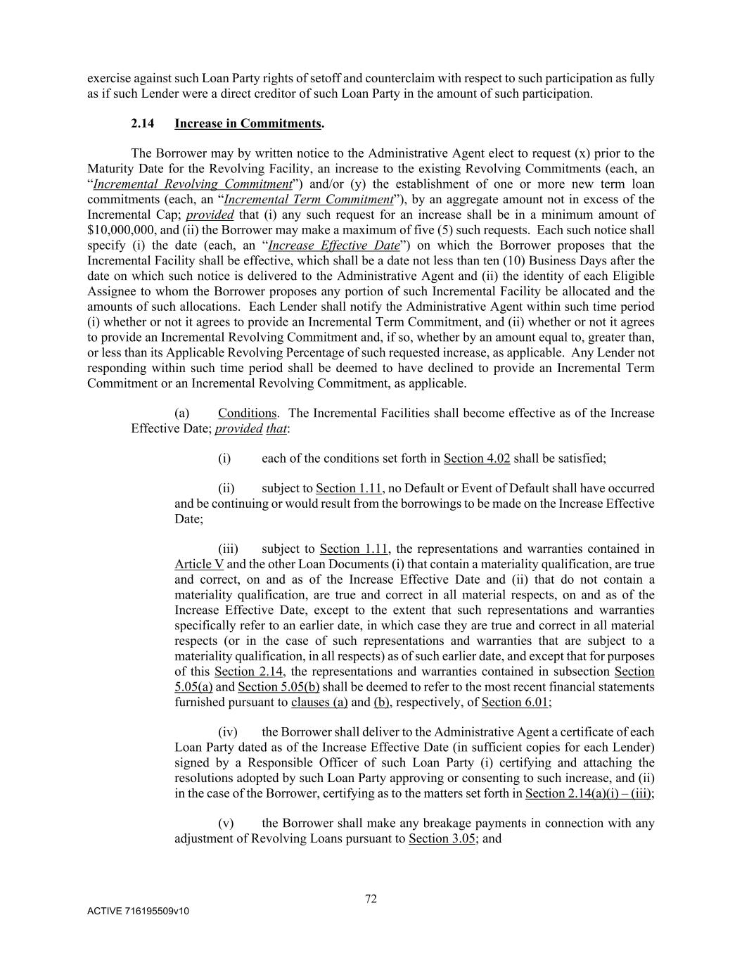 72 ACTIVE 716195509v10 exercise against such Loan Party rights of setoff and counterclaim with respect to such participation as fully as if such Lender were a direct creditor of such Loan Party in the amount of such participation. 2.14 Increase in Commitments. The Borrower may by written notice to the Administrative Agent elect to request (x) prior to the Maturity Date for the Revolving Facility, an increase to the existing Revolving Commitments (each, an “Incremental Revolving Commitment”) and/or (y) the establishment of one or more new term loan commitments (each, an “Incremental Term Commitment”), by an aggregate amount not in excess of the Incremental Cap; provided that (i) any such request for an increase shall be in a minimum amount of $10,000,000, and (ii) the Borrower may make a maximum of five (5) such requests. Each such notice shall specify (i) the date (each, an “Increase Effective Date”) on which the Borrower proposes that the Incremental Facility shall be effective, which shall be a date not less than ten (10) Business Days after the date on which such notice is delivered to the Administrative Agent and (ii) the identity of each Eligible Assignee to whom the Borrower proposes any portion of such Incremental Facility be allocated and the amounts of such allocations. Each Lender shall notify the Administrative Agent within such time period (i) whether or not it agrees to provide an Incremental Term Commitment, and (ii) whether or not it agrees to provide an Incremental Revolving Commitment and, if so, whether by an amount equal to, greater than, or less than its Applicable Revolving Percentage of such requested increase, as applicable. Any Lender not responding within such time period shall be deemed to have declined to provide an Incremental Term Commitment or an Incremental Revolving Commitment, as applicable. (a) Conditions. The Incremental Facilities shall become effective as of the Increase Effective Date; provided that: (i) each of the conditions set forth in Section 4.02 shall be satisfied; (ii) subject to Section 1.11, no Default or Event of Default shall have occurred and be continuing or would result from the borrowings to be made on the Increase Effective Date; (iii) subject to Section 1.11, the representations and warranties contained in Article V and the other Loan Documents (i) that contain a materiality qualification, are true and correct, on and as of the Increase Effective Date and (ii) that do not contain a materiality qualification, are true and correct in all material respects, on and as of the Increase Effective Date, except to the extent that such representations and warranties specifically refer to an earlier date, in which case they are true and correct in all material respects (or in the case of such representations and warranties that are subject to a materiality qualification, in all respects) as of such earlier date, and except that for purposes of this Section 2.14, the representations and warranties contained in subsection Section 5.05(a) and Section 5.05(b) shall be deemed to refer to the most recent financial statements furnished pursuant to clauses (a) and (b), respectively, of Section 6.01; (iv) the Borrower shall deliver to the Administrative Agent a certificate of each Loan Party dated as of the Increase Effective Date (in sufficient copies for each Lender) signed by a Responsible Officer of such Loan Party (i) certifying and attaching the resolutions adopted by such Loan Party approving or consenting to such increase, and (ii) in the case of the Borrower, certifying as to the matters set forth in Section 2.14(a)(i) – (iii); (v) the Borrower shall make any breakage payments in connection with any adjustment of Revolving Loans pursuant to Section 3.05; and