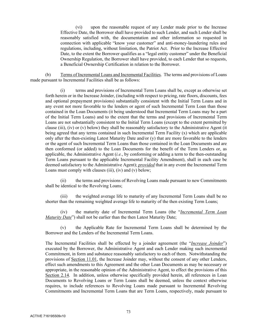 73 ACTIVE 716195509v10 (vi) upon the reasonable request of any Lender made prior to the Increase Effective Date, the Borrower shall have provided to such Lender, and such Lender shall be reasonably satisfied with, the documentation and other information so requested in connection with applicable “know your customer” and anti-money-laundering rules and regulations, including, without limitation, the Patriot Act. Prior to the Increase Effective Date, to the extent the Borrower qualifies as a “legal entity customer” under the Beneficial Ownership Regulation, the Borrower shall have provided, to each Lender that so requests, a Beneficial Ownership Certification in relation to the Borrower. (b) Terms of Incremental Loans and Incremental Facilities. The terms and provisions of Loans made pursuant to Incremental Facilities shall be as follows: (i) terms and provisions of Incremental Term Loans shall be, except as otherwise set forth herein or in the Increase Joinder, (including with respect to pricing, rate floors, discounts, fees and optional prepayment provisions) substantially consistent with the Initial Term Loans and in any event not more favorable to the lenders or agent of such Incremental Term Loan than those contained in the Loan Documents (it being understood that Incremental Term Loans may be a part of the Initial Term Loans) and to the extent that the terms and provisions of Incremental Term Loans are not substantially consistent to the Initial Term Loans (except to the extent permitted by clause (iii), (iv) or (v) below) they shall be reasonably satisfactory to the Administrative Agent (it being agreed that any terms contained in such Incremental Term Facility (x) which are applicable only after the then-existing Latest Maturity Date and/or (y) that are more favorable to the lenders or the agent of such Incremental Term Loans than those contained in the Loan Documents and are then conformed (or added) to the Loan Documents for the benefit of the Term Lenders or, as applicable, the Administrative Agent (i.e., by conforming or adding a term to the then-outstanding Term Loans pursuant to the applicable Incremental Facility Amendment), shall in each case be deemed satisfactory to the Administrative Agent); provided that in any event the Incremental Term Loans must comply with clauses (iii), (iv) and (v) below; (ii) the terms and provisions of Revolving Loans made pursuant to new Commitments shall be identical to the Revolving Loans; (iii) the weighted average life to maturity of any Incremental Term Loans shall be no shorter than the remaining weighted average life to maturity of the then existing Term Loans; (iv) the maturity date of Incremental Term Loans (the “Incremental Term Loan Maturity Date”) shall not be earlier than the then Latest Maturity Date; (v) the Applicable Rate for Incremental Term Loans shall be determined by the Borrower and the Lenders of the Incremental Term Loans. The Incremental Facilities shall be effected by a joinder agreement (the “Increase Joinder”) executed by the Borrower, the Administrative Agent and each Lender making such incremental Commitment, in form and substance reasonably satisfactory to each of them. Notwithstanding the provisions of Section 11.01, the Increase Joinder may, without the consent of any other Lenders, effect such amendments to this Agreement and the other Loan Documents as may be necessary or appropriate, in the reasonable opinion of the Administrative Agent, to effect the provisions of this Section 2.14. In addition, unless otherwise specifically provided herein, all references in Loan Documents to Revolving Loans or Term Loans shall be deemed, unless the context otherwise requires, to include references to Revolving Loans made pursuant to Incremental Revolving Commitments and Incremental Term Loans that are Term Loans, respectively, made pursuant to